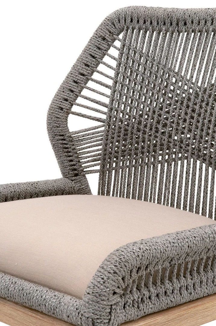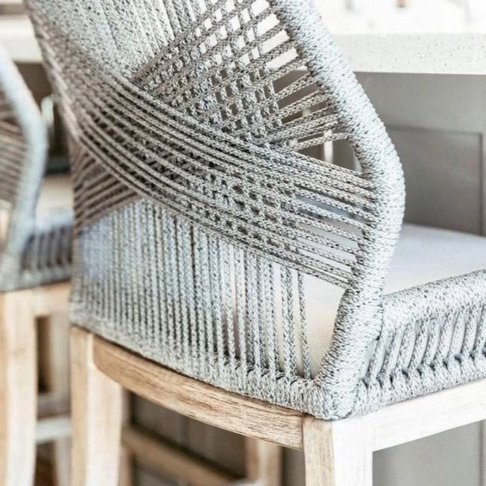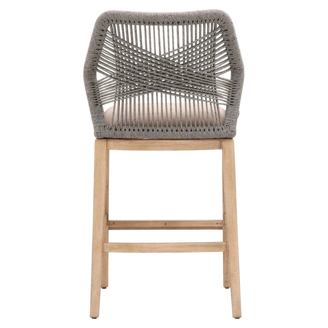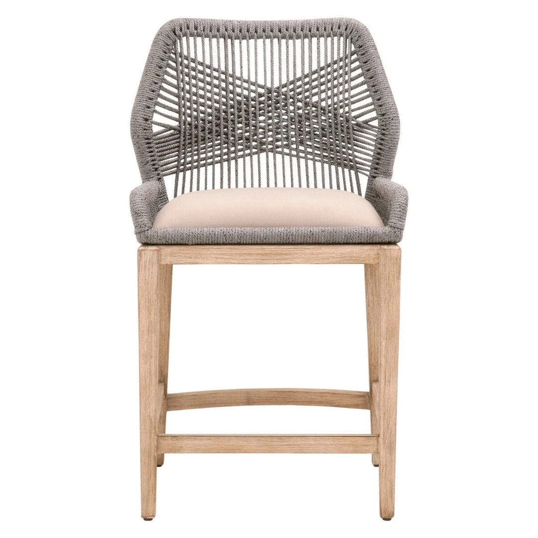This woven counter stool will add a touch of coastal style to your kitchen, bar or dining space. Constructed with a reinforced aluminum frame and solid mahogany legs, this stool is not only sturdy, but durable. A rich platinum-colored rope is tightly woven to create a unique loom design, while the wood legs have a beautiful distressed natural gray finish. Paired with a light gray fixed seat cushion, the stool provides comfort with style and will be the perfect addition to any transitional or traditional dining room or bar area.