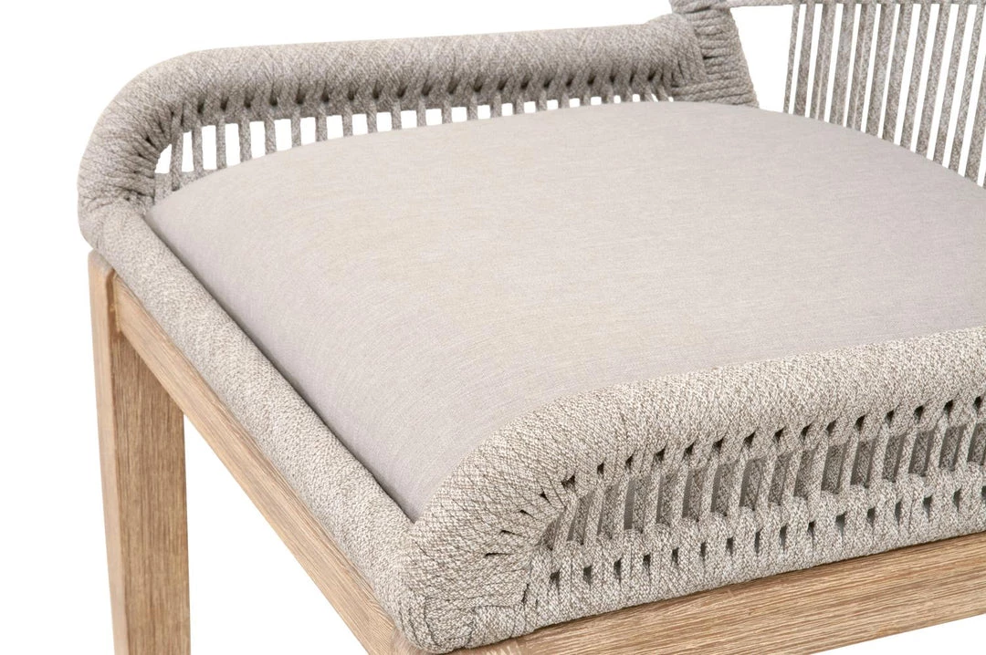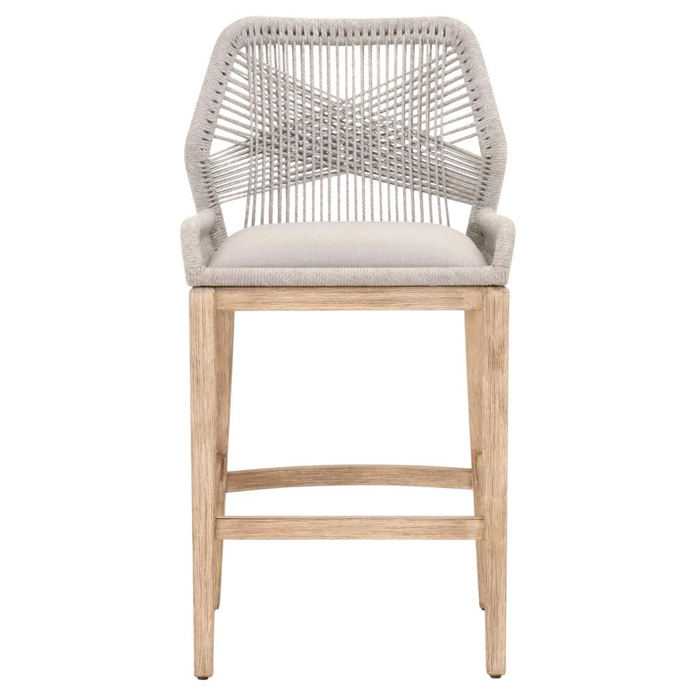 This woven barstool will add a touch of coastal style to your kitchen, bar or dining space. Constructed with an Aluminum frame and solid Mahogany legs, this stool is not only sturdy but durable. A rich Platinum-colored rope is tightly woven to create a unique loom design, while the wood legs have a beautiful distressed Natural Gray finish. Paired with an upholstered Light Gray seat cushion affixed to the base, the stool provides comfort with style and will be the perfect addition to any transitional or traditional dining room or bar area.