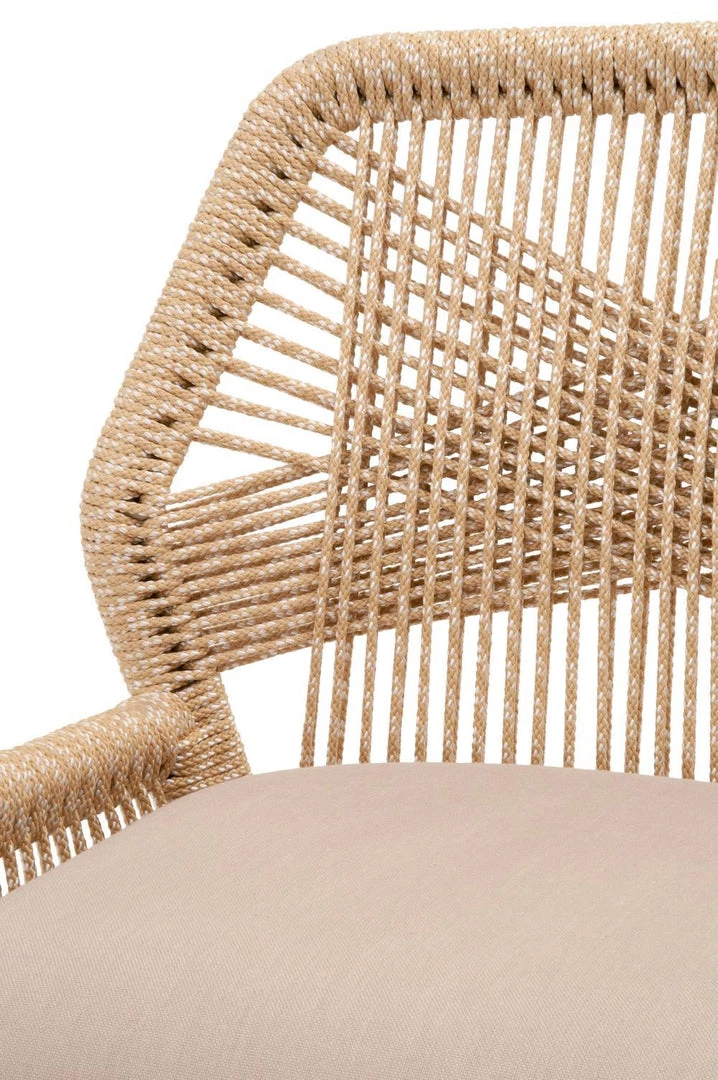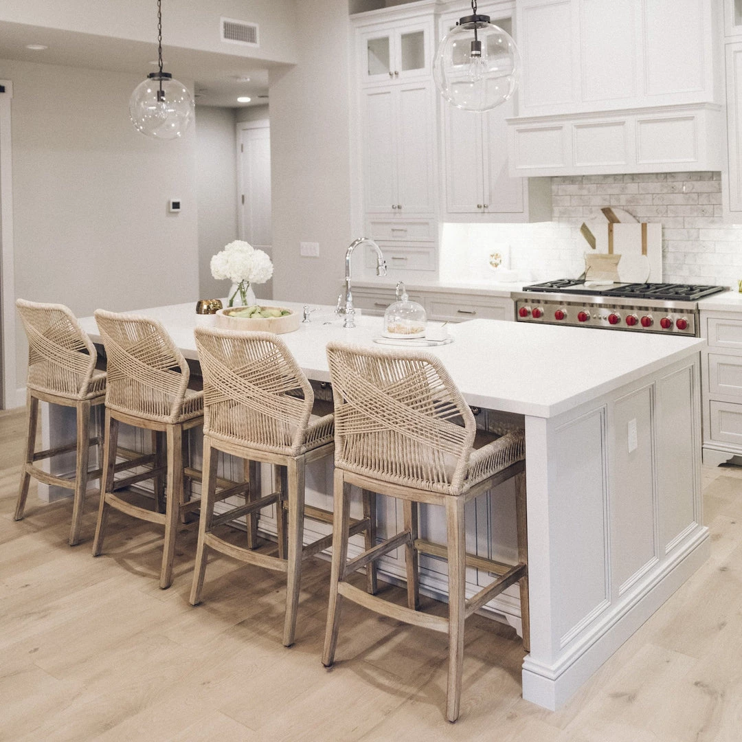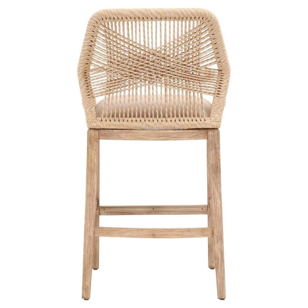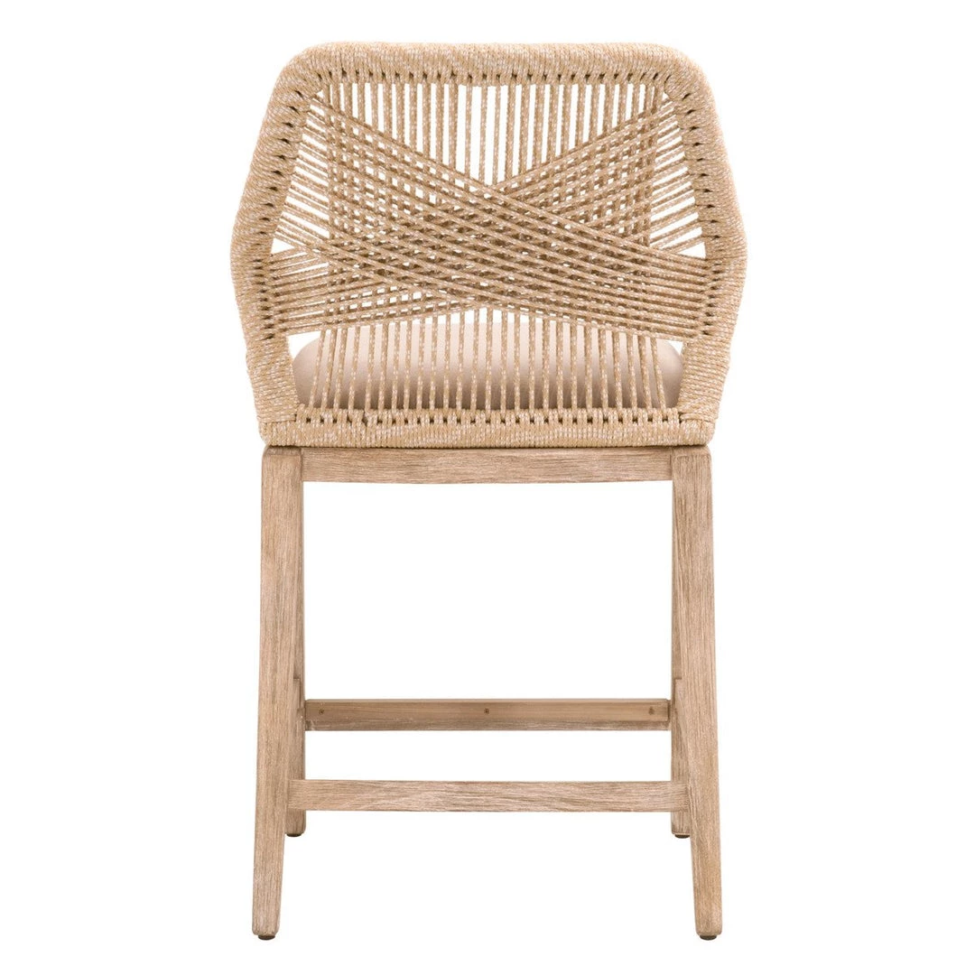 This woven counter stool will add a touch of coastal style to your kitchen, bar or dining space. Constructed with an aluminum frame and solid mahogany legs, this stool is not only sturdy, but durable. A rich Platinum-colored rope is tightly woven to create a unique loom design, while the wood legs have a beautiful distressed Natural Gray finish. Paired with an upholstered Light Gray seat cushion affixed to the base, the stool provides comfort with style and will be the perfect addition to any transitional or traditional dining room or bar area.