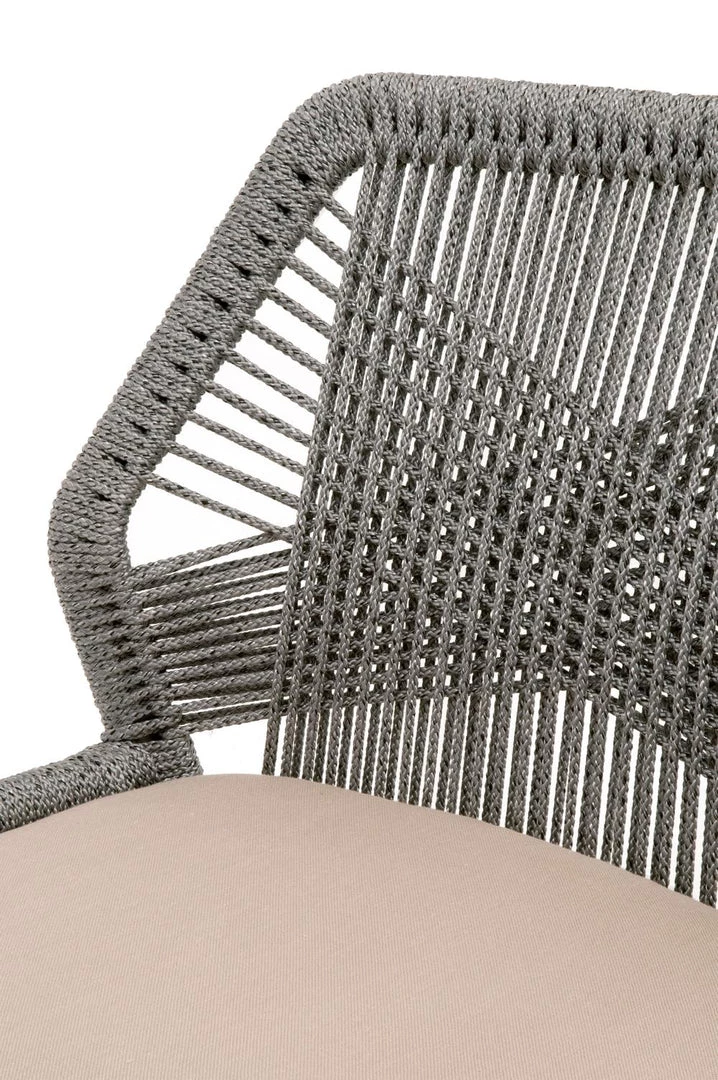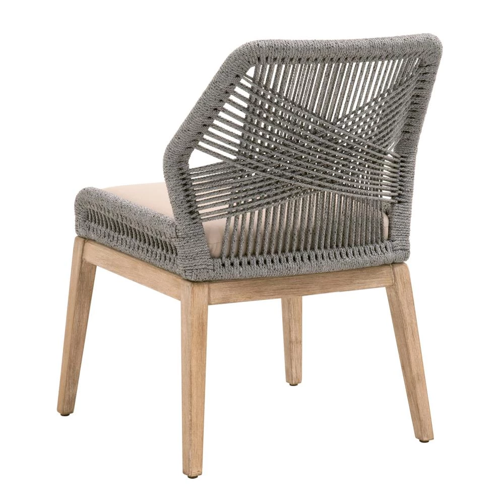 These woven side chairs will add a touch of coastal style to your kitchen or dining space. Constructed with a reinforced aluminum frame and solid mahogany legs, these dining chairs are not only sturdy, but durable. A rich platinum-colored rope is tightly woven to create a unique loom design, while the wood legs have a beautiful distressed natural gray finish. Paired with a fixed light gray seat cushion, the chairs provide comfort with style and will be the perfect addition to any transitional or traditional dining room.