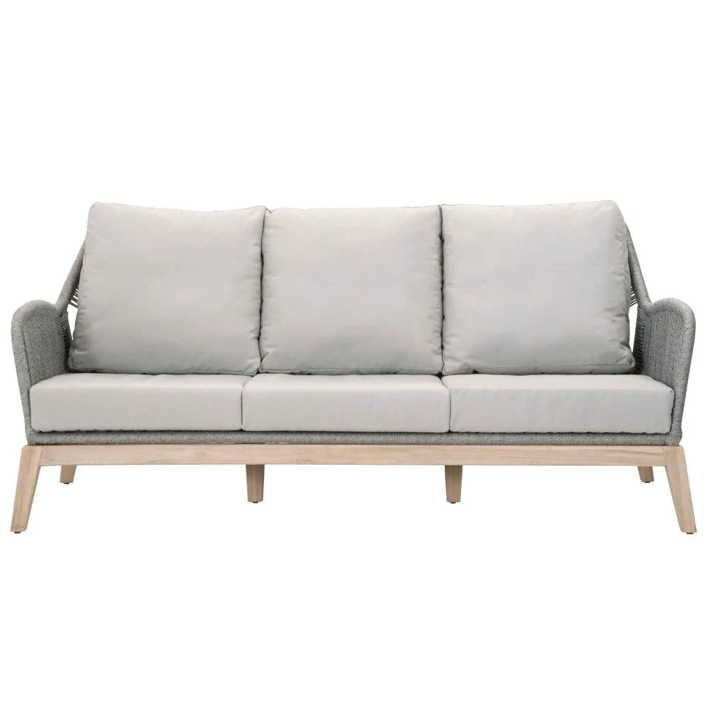This woven outdoor sofa will add a touch of coastal style to your backyard or patio. Constructed with an aluminum frame and solid gray teak legs, this sofa is not only sturdy, but durable for outdoor use. A rich platinum colored rope is tightly woven to create a unique loom design, while the gray teak legs feature a beautiful wood grain finish. Paired with removable all-weather seat and back cushions, the sofa provides comfort with style and will be the perfect addition to any outdoor lounging area.