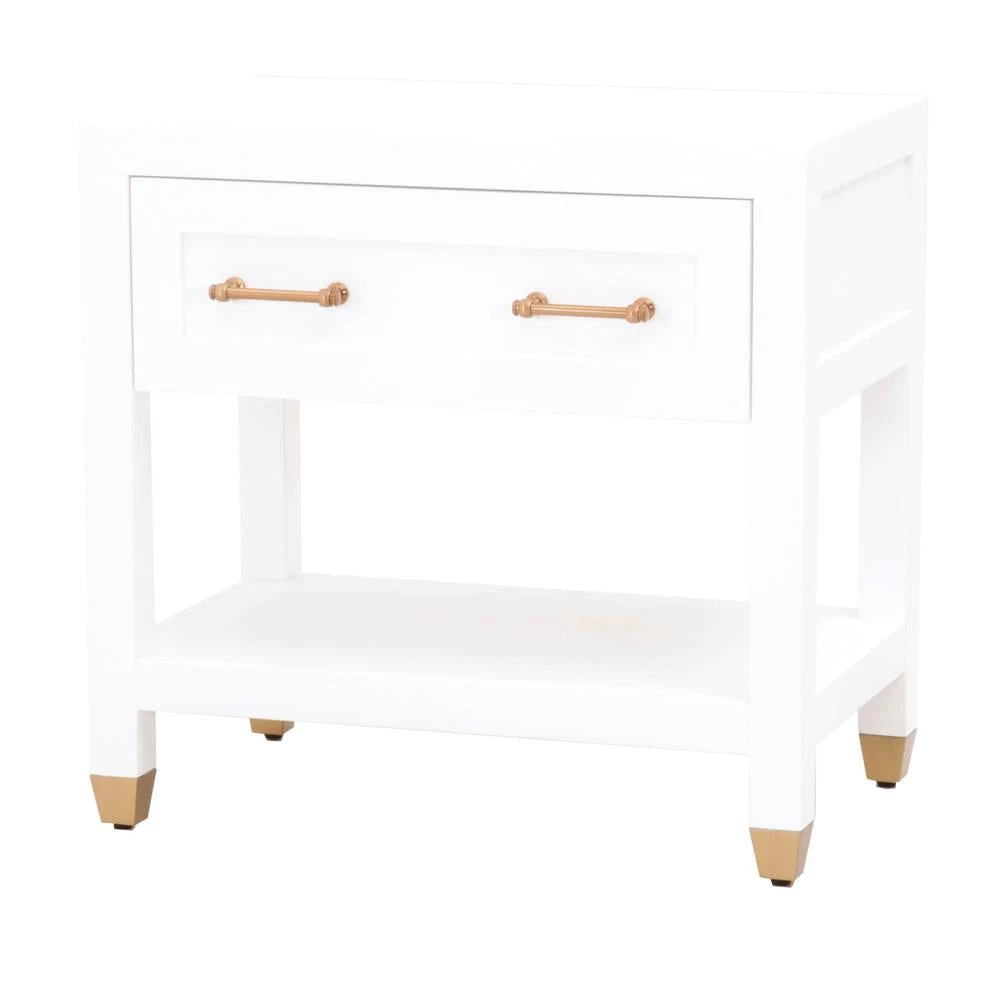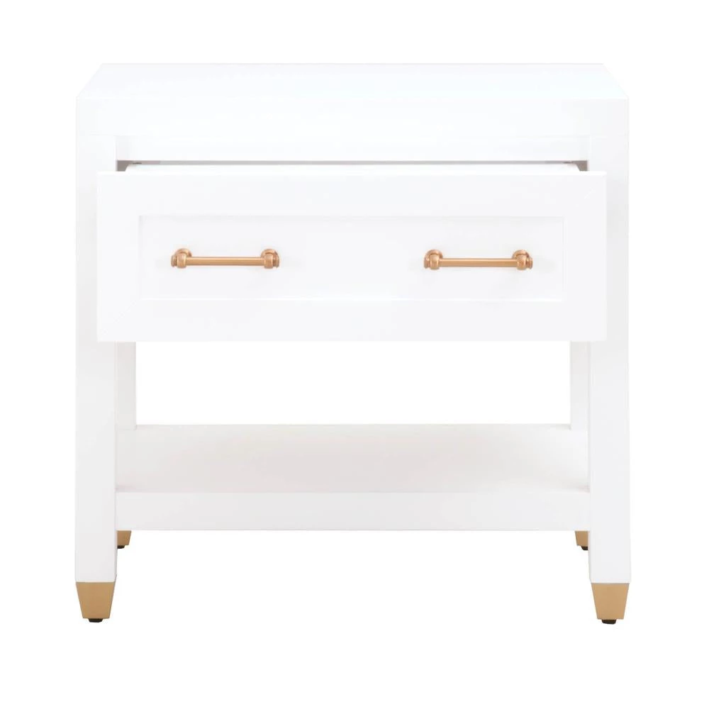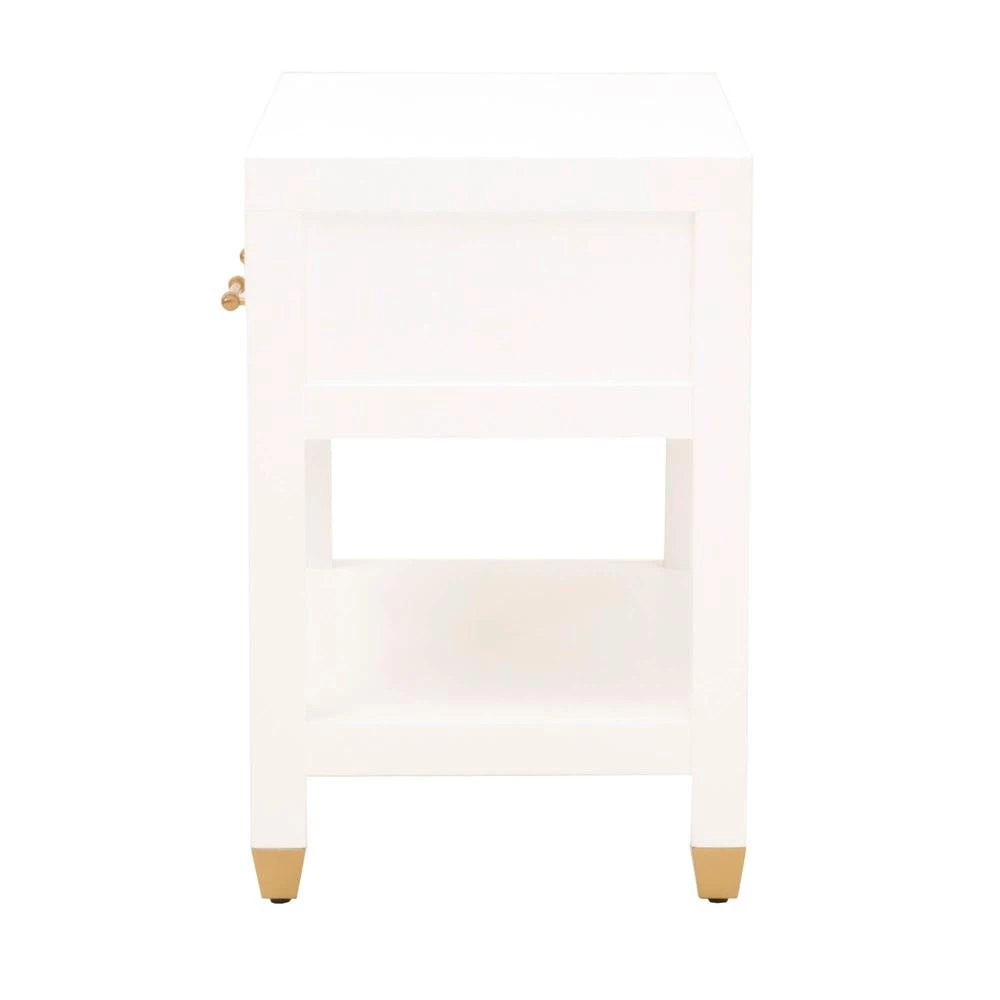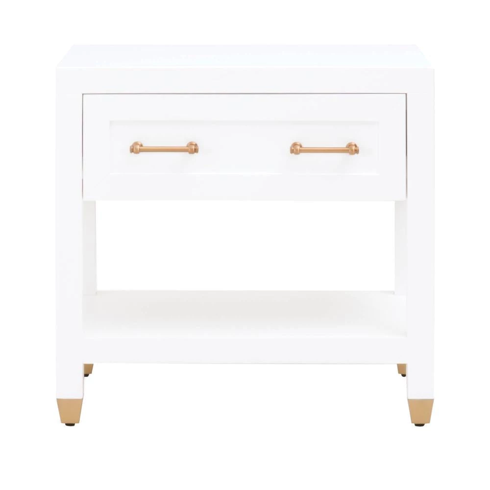 A sophisticated nightstand with a modern flare. Constructed with 1 storage drawer and storage shelf, this matte white bedside table has plenty of space to store remotes, magazines, books, and much more. It is accented with brushed brass pull handles and hardware, giving this nightstand a transitional look that will be a great addition to your bedroom.