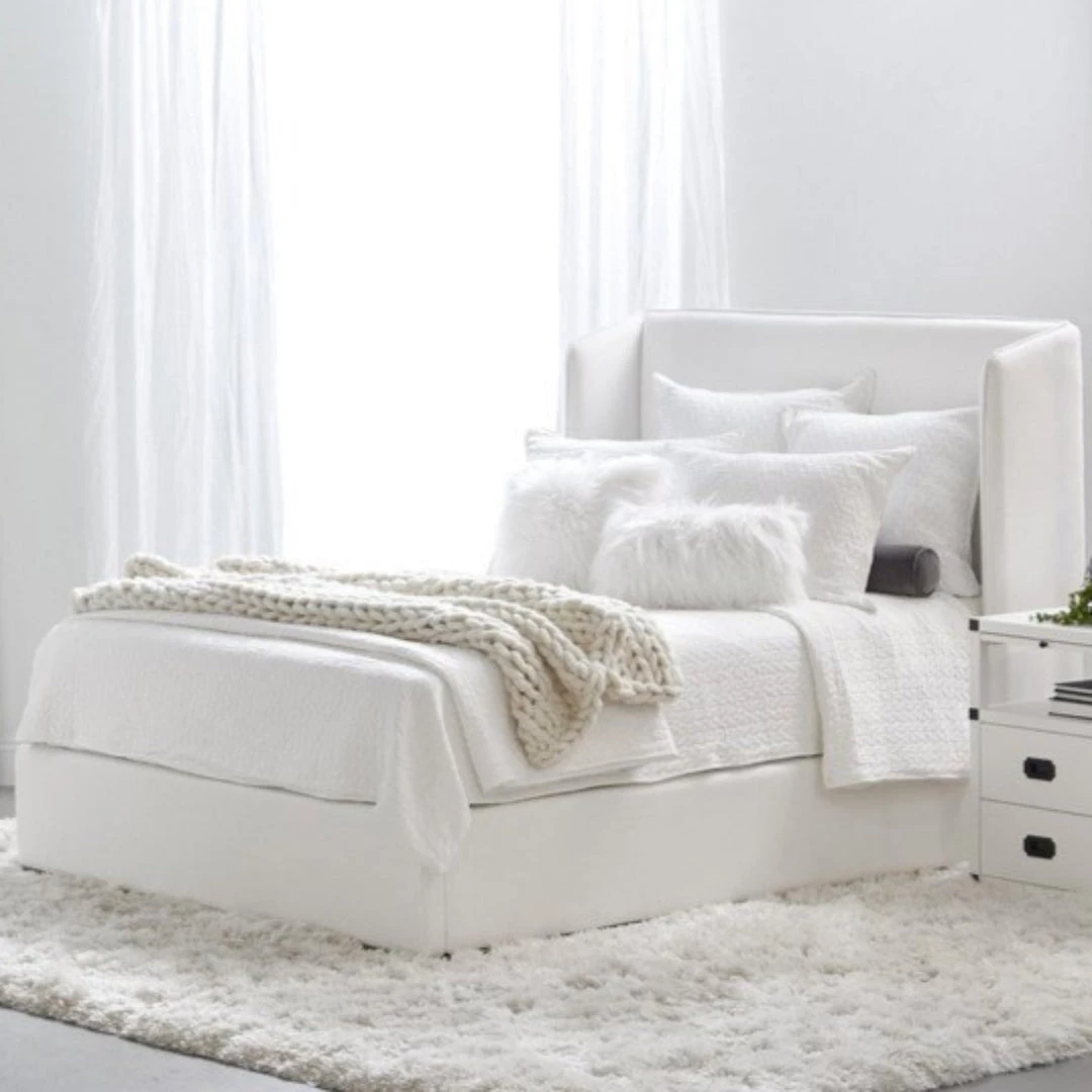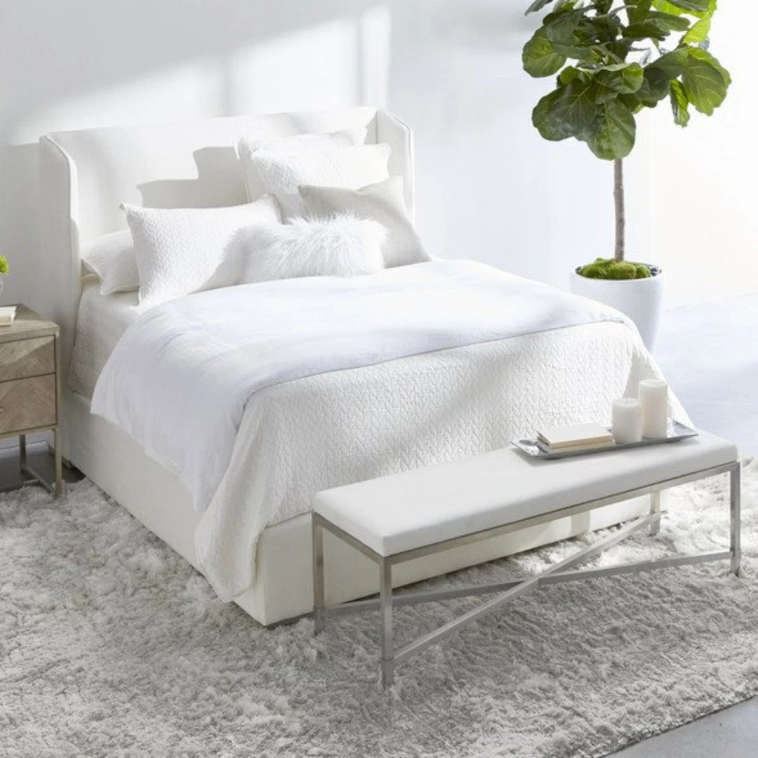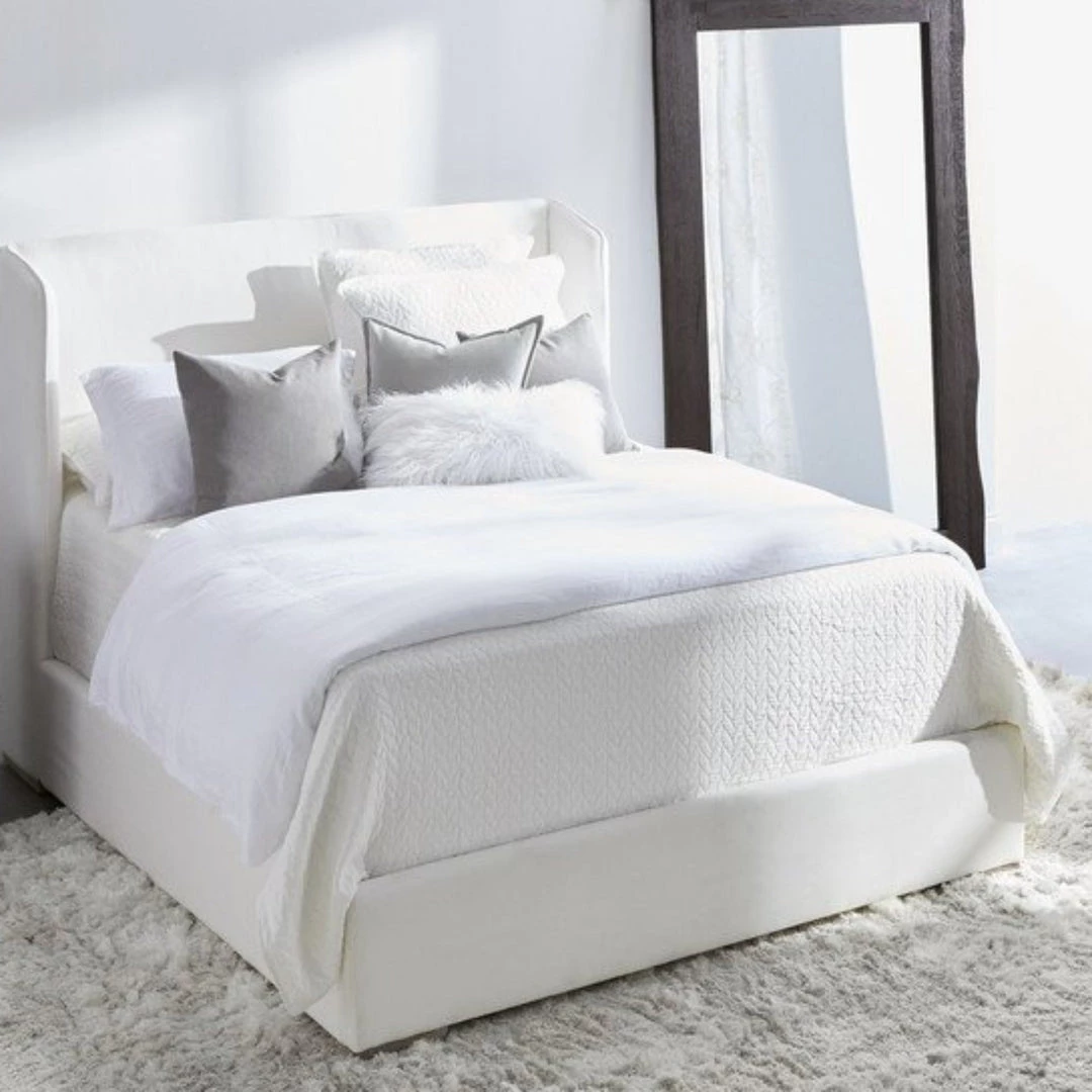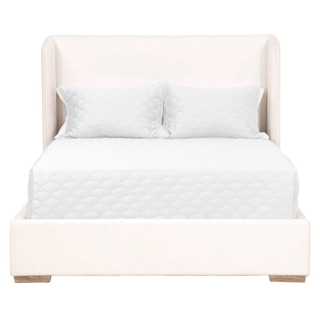 This wingback upholstered queen bed frame will add sophistication and class to any bedroom. The Livesmart Peyton Pearl fabric and solid oak feet create a neutral palette that will work well with many color combinations. The frame features a removable metal frame European slat system and stain resistant fabric. Designed for dependability and durability, this transitional style queen bed frame will be a great addition to your bedroom.