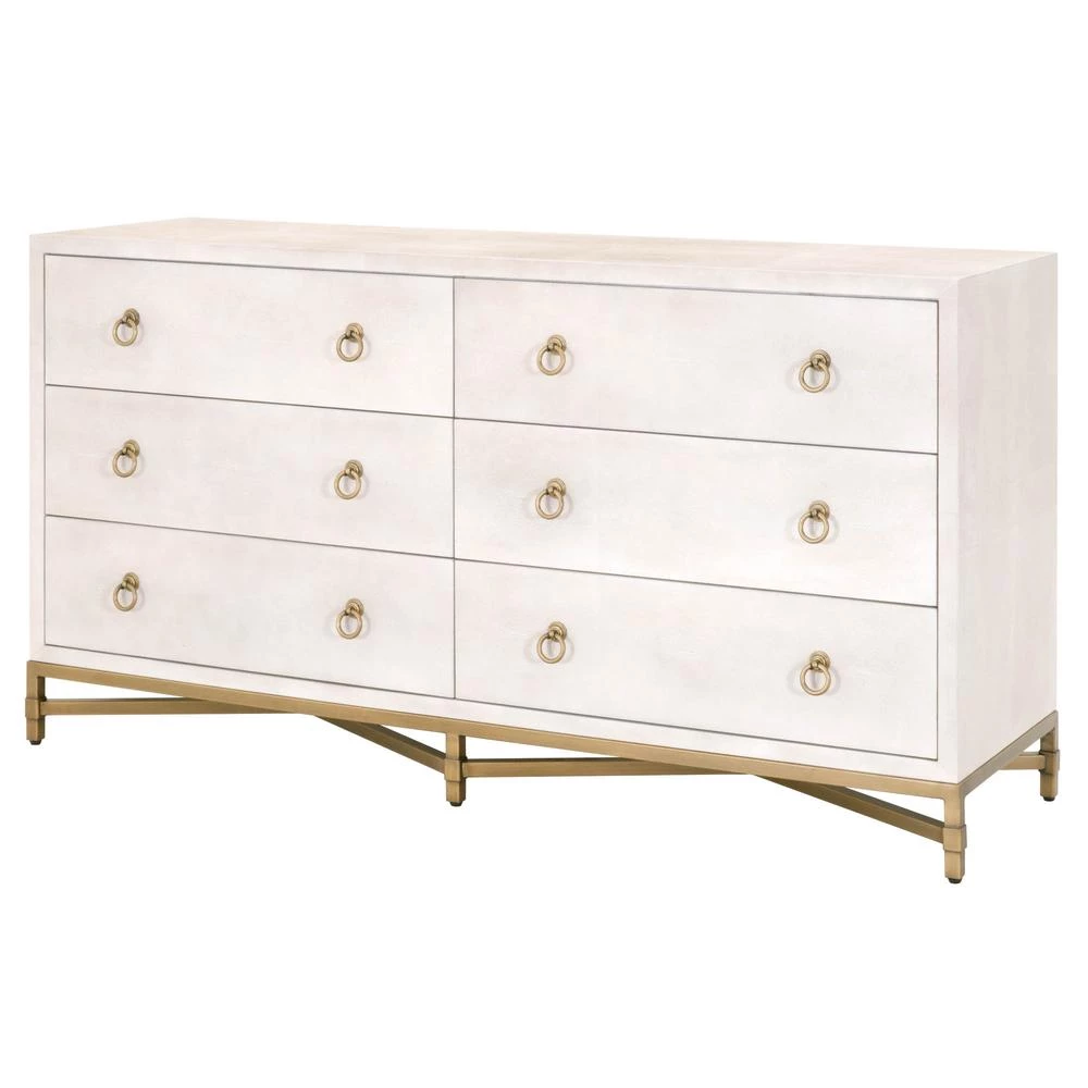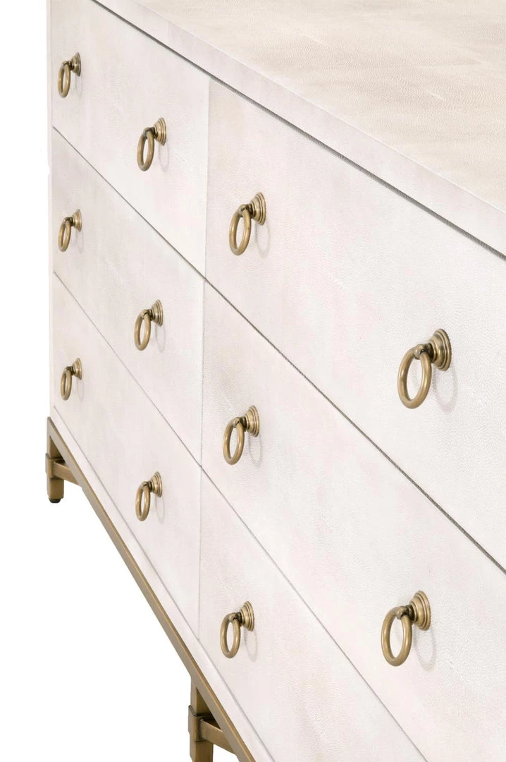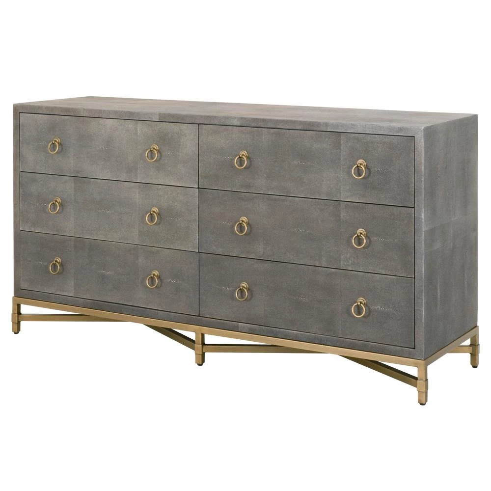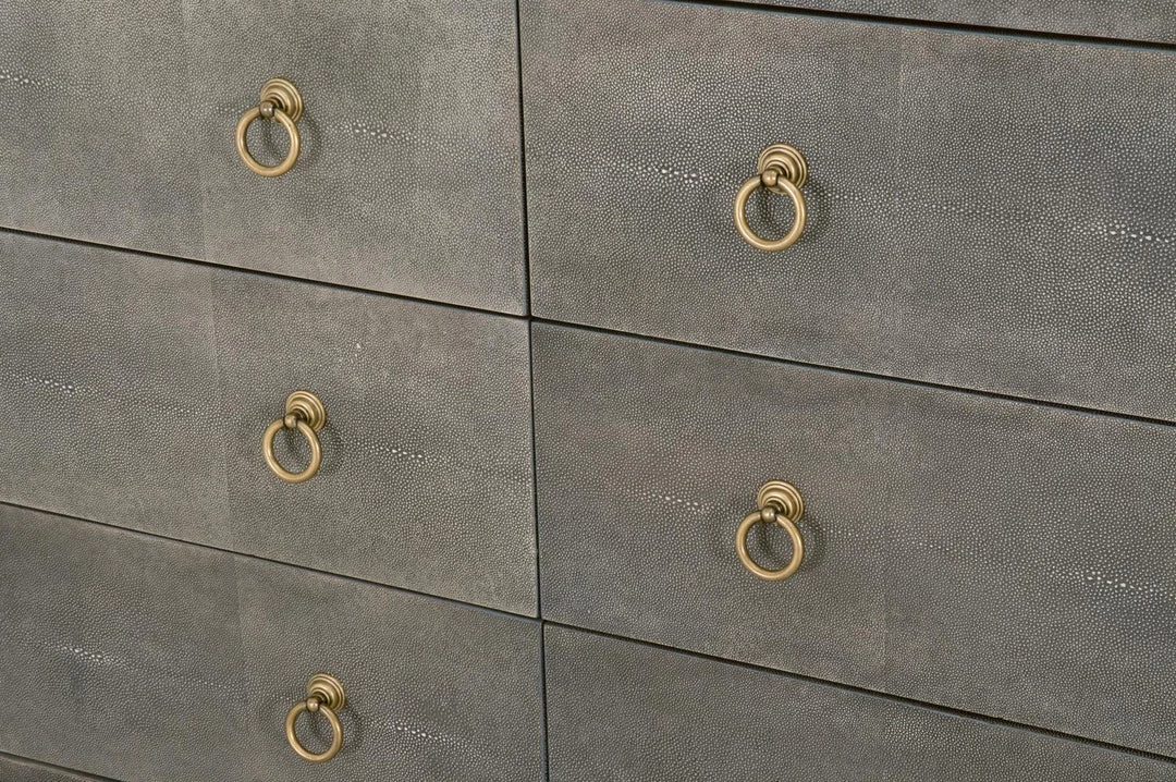 You are sure to liven up your bedroom with this gorgeous and one-of-a-kind dresser. This unique dresser mimics that of natural shagreen skin. Its textured finish is made of a gray faux shagreen resin that includes seams for a very natural look. The base is constructed of steel shaped in a “X” design with an elegant, brushed gold finish. It features six storage drawers with matching brushed gold ring pulls for ample storage space for clothes and other daily essentials.