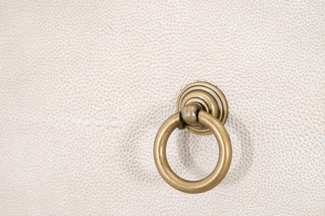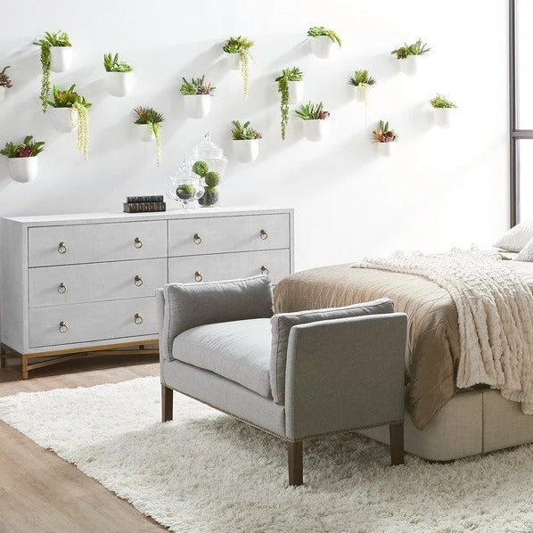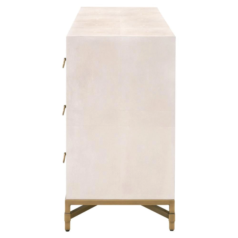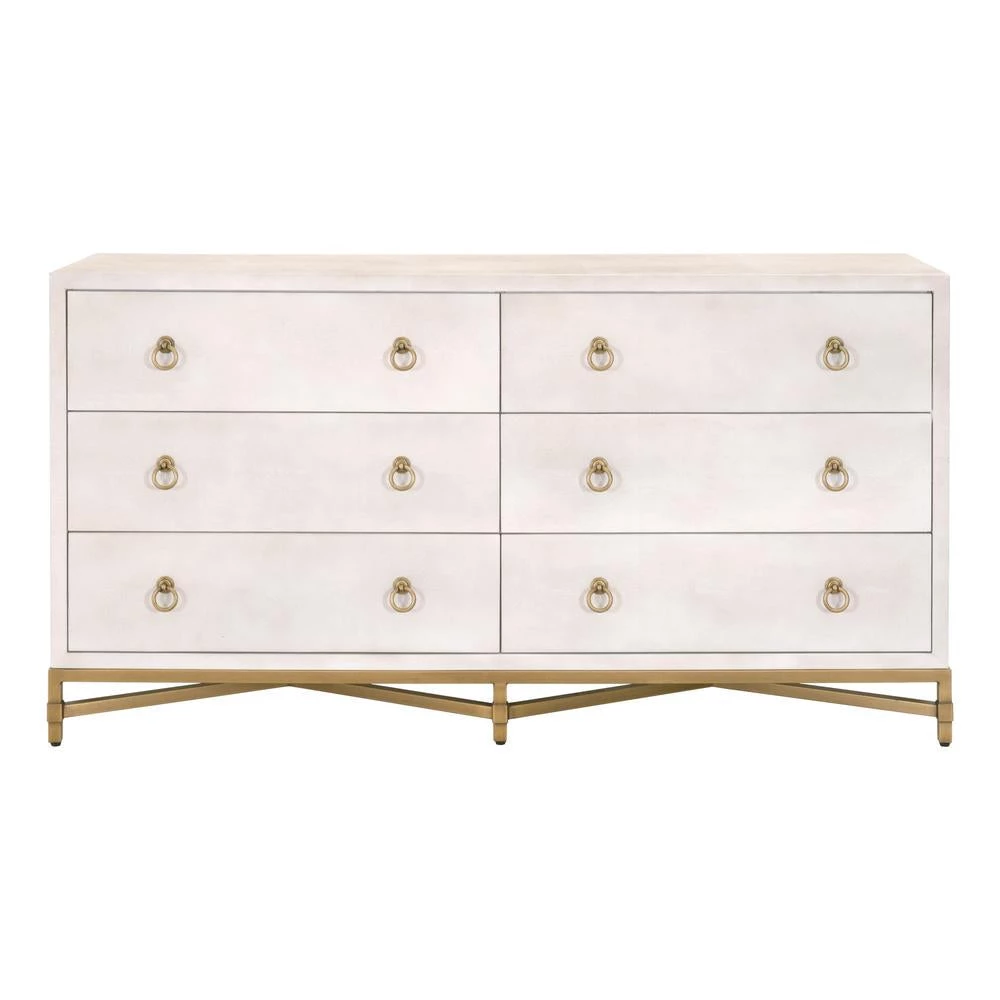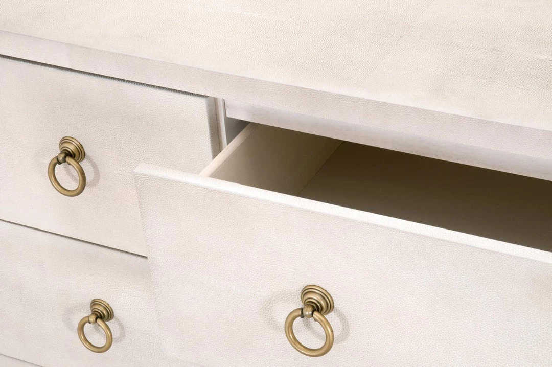 You are sure to liven up your bedroom with this gorgeous and one-of-a-kind dresser. This unique dresser mimics that of natural shagreen skin. Its textured finish is made of a gray faux shagreen resin that includes seams for a very natural look. The base is constructed of steel shaped in a “X” design with an elegant, brushed gold finish. It features six storage drawers with matching brushed gold ring pulls for ample storage space for clothes and other daily essentials.