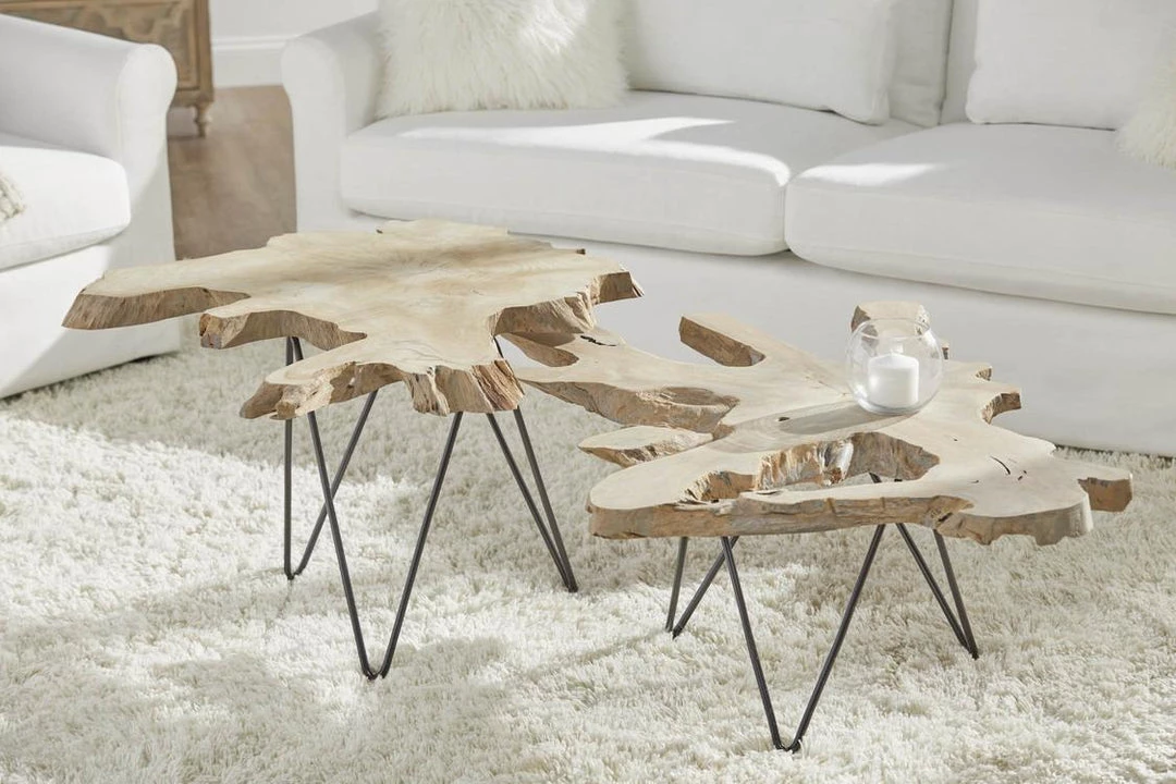 Add earthy style to your living room or patio with this teak wood coffee table. Modeled after natural driftwood, this coffee table is crafted of natural teak roots and black iron legs. It comes with two separate tables, one shorter than the other, to create a nested look. Due to the natural nature of the teak roots, each tabletop varies slightly with knotting, live edging, holes and sizing. Along with the organic and raw look that the teak provides, teak is also suitable for outdoor use thanks to the natural oils that help protect it from certain weather elements. The modern-looking black iron legs are slim and add a touch of mid-century appeal to this gorgeous table as well. Furnishing your living space with this one-of-a-kind coffee table will be sure to liven up your indoor haven or backyard oasis.