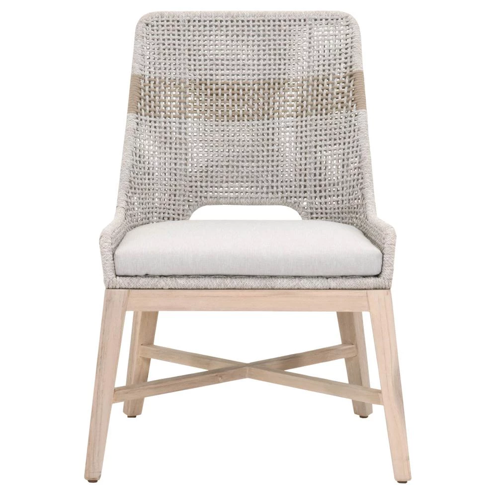 These woven outdoor dining chairs will add a touch of coastal style to your backyard or patio. Constructed with a stainless steel frame and solid gray teak legs, these side chairs are not only sturdy, but durable for outdoor use. A rich dove colored rope is tightly woven with an eye-catching solid white speckle stripe interwoven at the center of the seat back. The gray teak legs feature crossed leg stretchers and a beautiful wood grain finish. Paired with a removable all-weather seat cushion, the chairs provide comfort with style and will be the perfect addition to any outdoor space.
