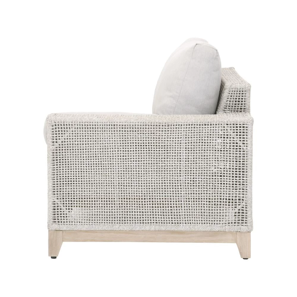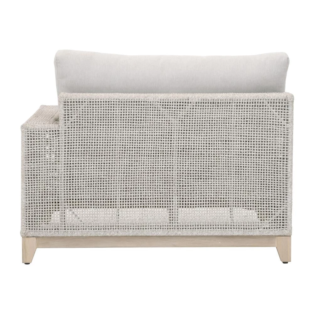 This alluring outdoor modular right-facing arm sofa will be an ideal addition to your patio or outdoor living space. It is just one component of a larger sectional outdoor sofa. You can easily connect this right-facing sofa seat with its matching modular pieces using its u-shaped clamp connecters. The modular sofa is suitable for many outdoor designs with its beachy look and transitional style. It is upholstered with a light gray olefin fabric that is weather resistant. The seat cushions are both reversible for easy cleaning, and removable for storing away in heavy weather conditions. It also includes one round bolster pillow to accessorize and complete the look. The frame is covered with an intricately woven white and taupe rope that projects a light gray hue from a distance. The exposed wood base is constructed of teak wood with gray undertones. The neutral color scheme and simple look of the modular sofa exude a clean and airy aesthetic, which is perfect for a casual and inviting ba