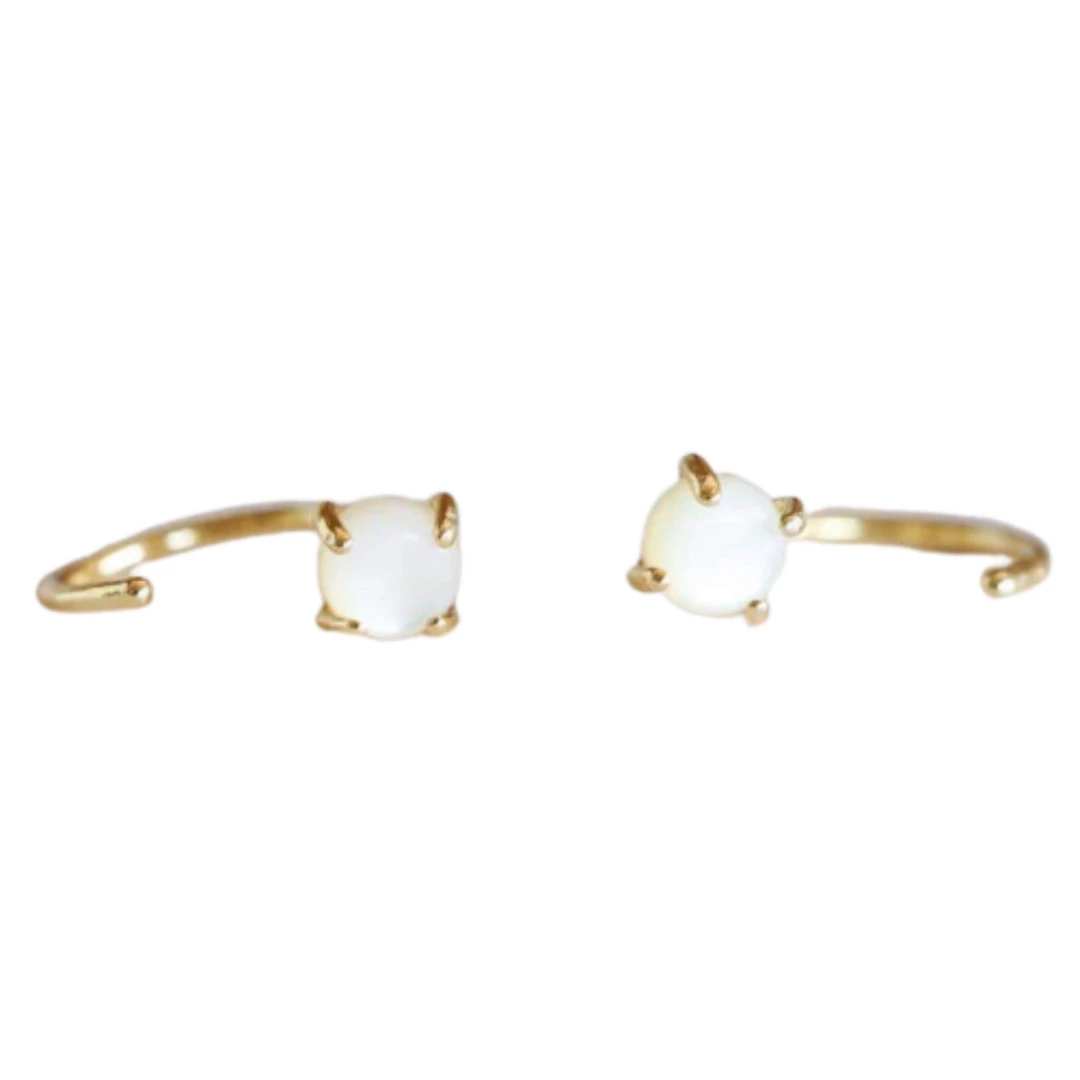 Made to be a calming reminder, our dainty Mother of Pearl Huggies will stand out from the rest and are perfect for everyday wear. Loop these through and let this pair “hug” your ears tight for a constant reminder of what the beautiful gemstone represents. Featuring a petite polished Mother of Pearl stone cut into shape and set in an 18k gold-plated prong earring over sterling silver.