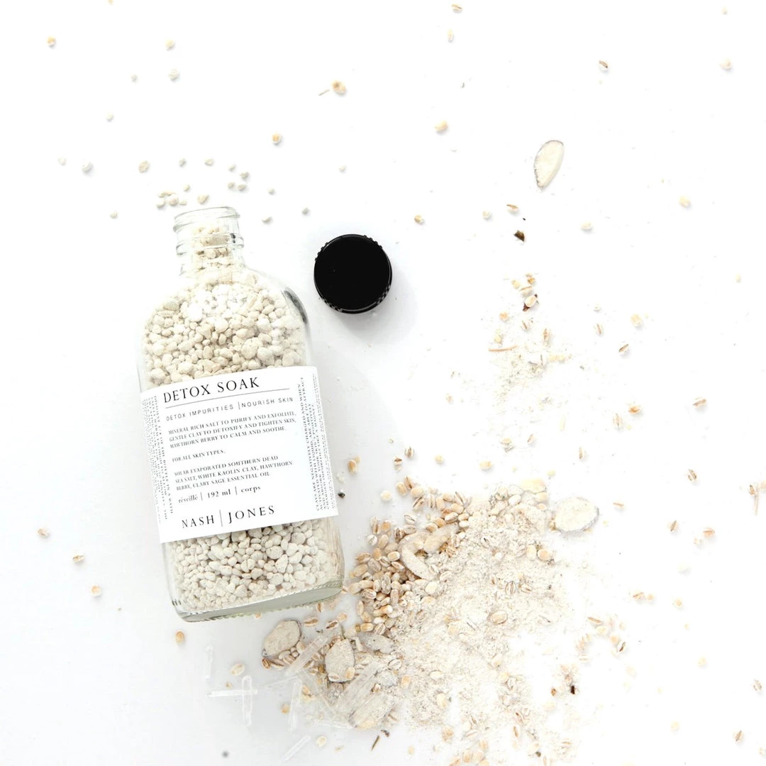 For all skin types. Our detox bath soaks are designed to draw out and bind toxins plus nourish and calm skin. Detox Soak: Dead Sea Salt, Kaolin Clay.Â