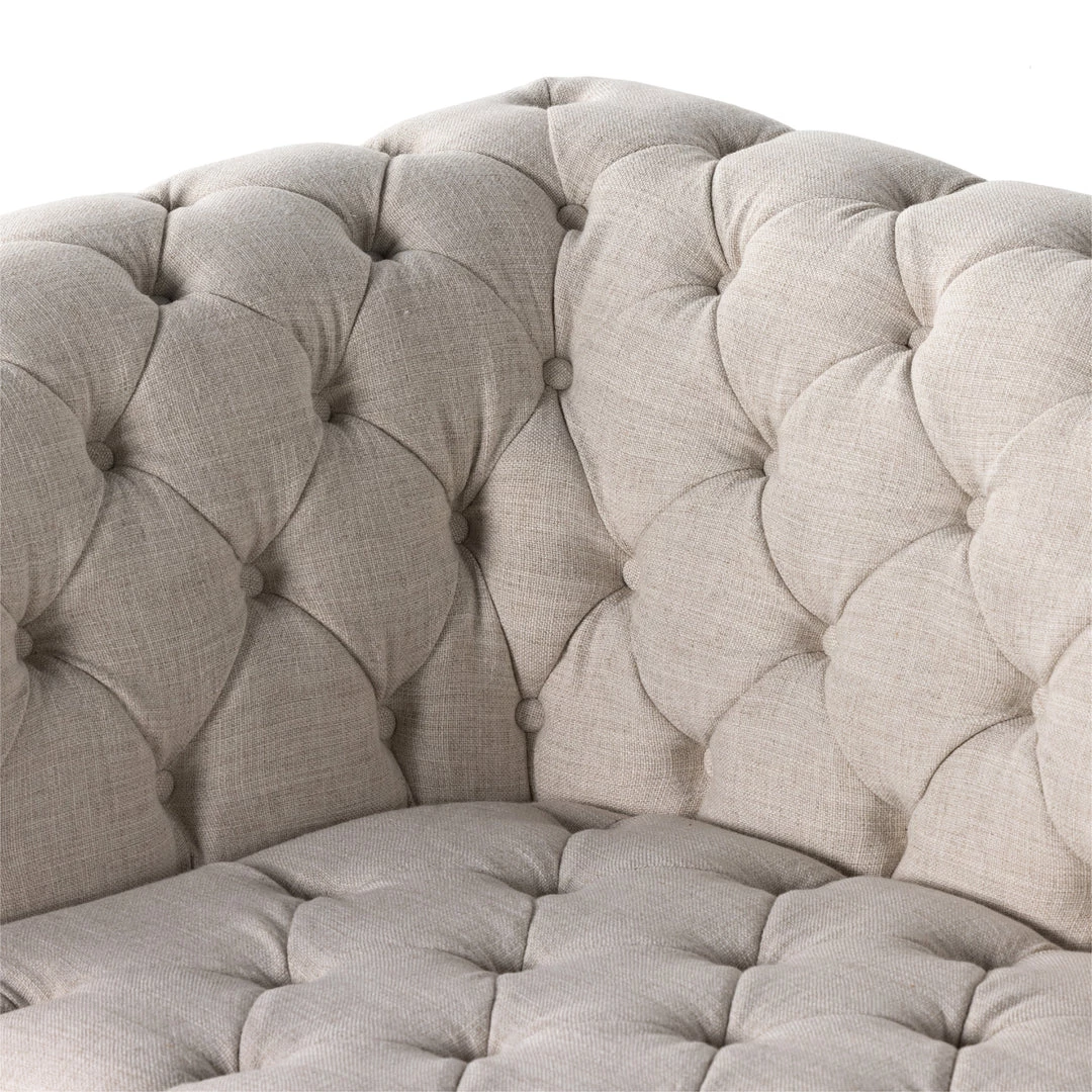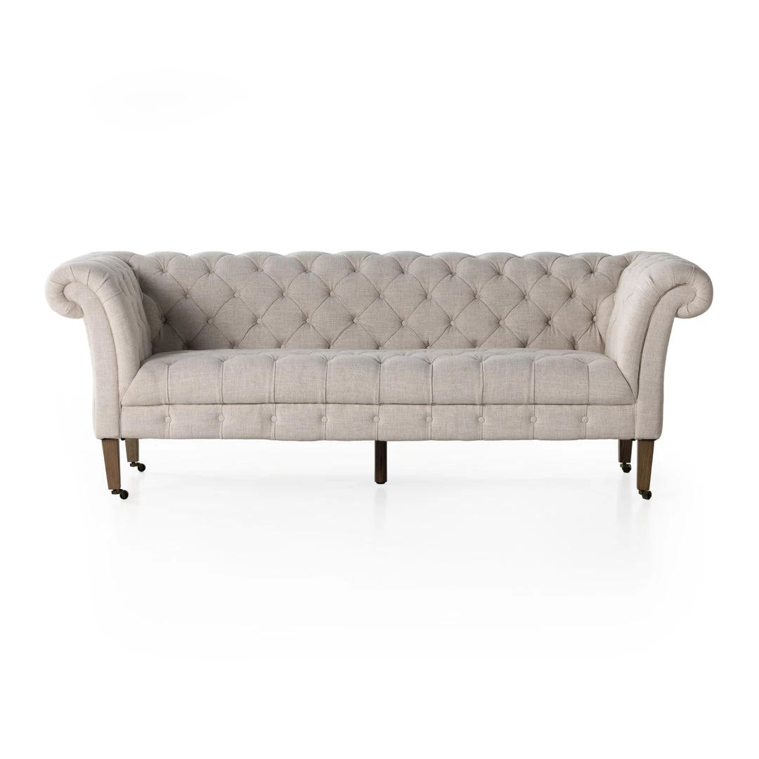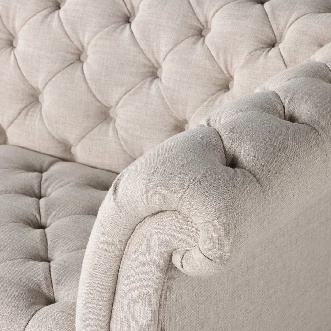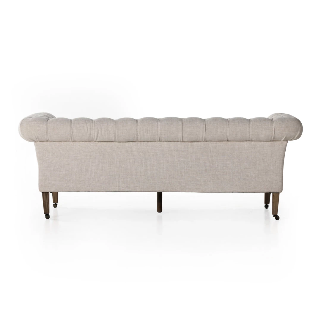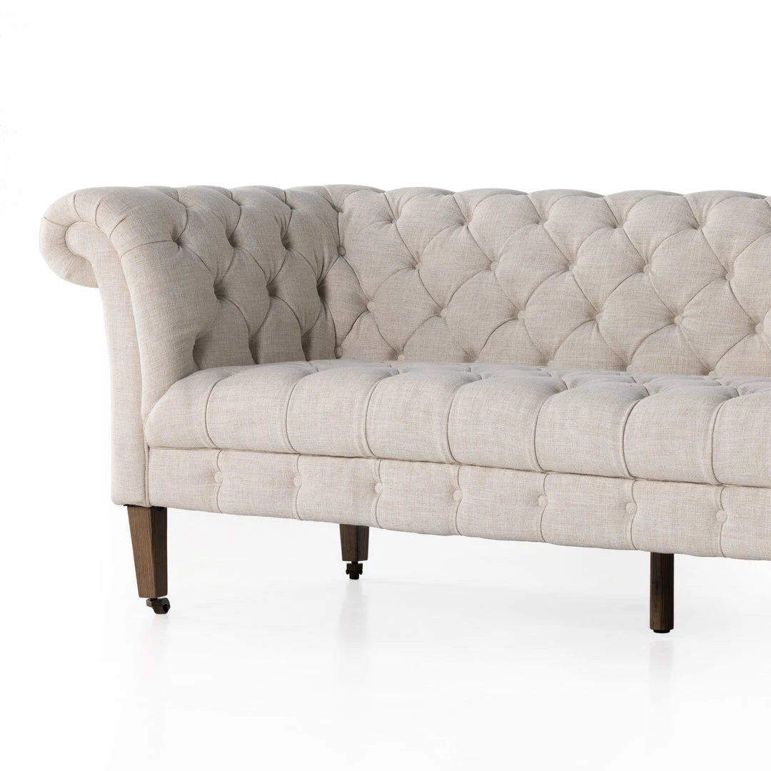Talk about traditional. Off-white linen upholstery flaunts rolled arms and dramatic tufting for a fun, English-inspired twist on the classic Chesterfield. Solid ash legs with casters for modern ease.