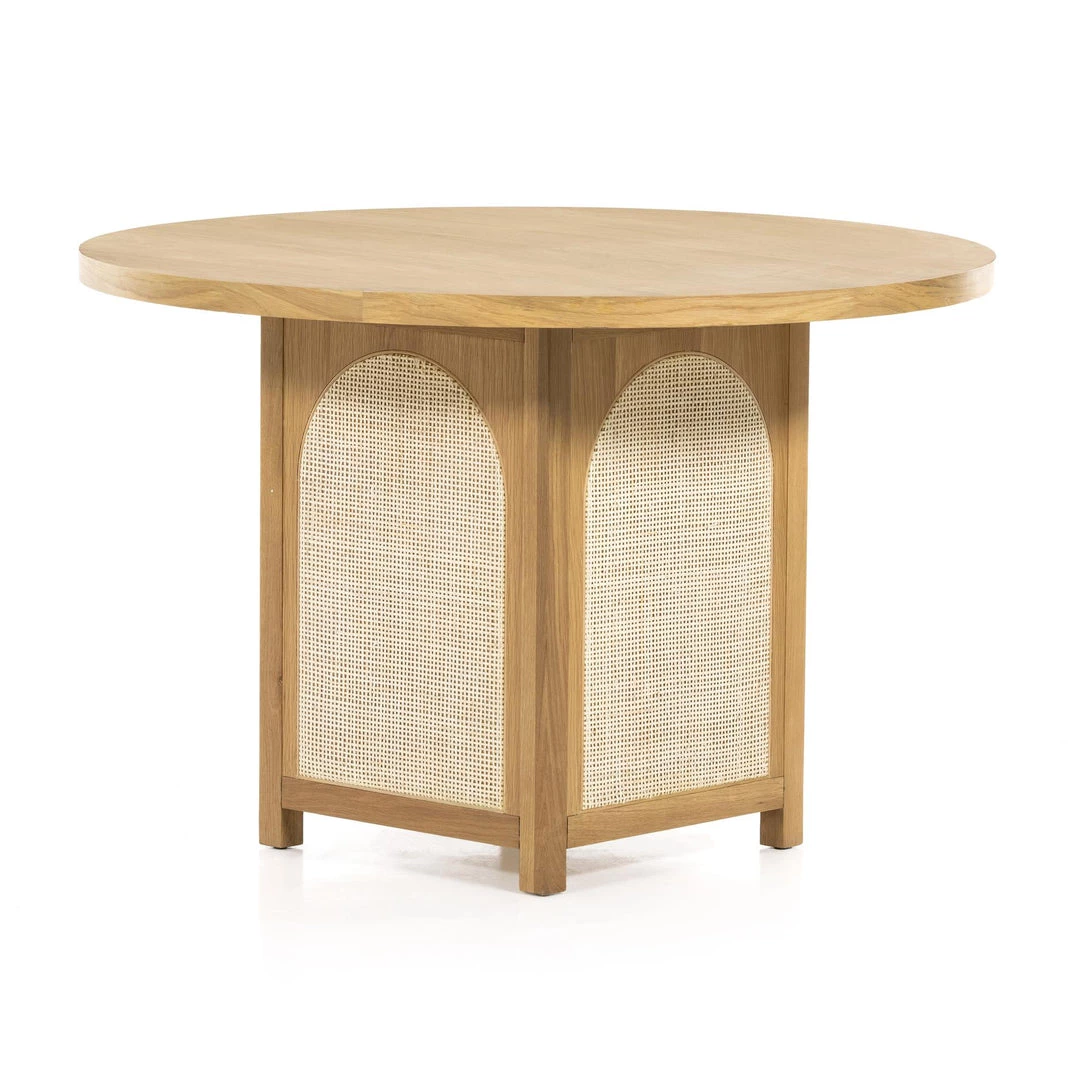 Au naturale. Honey-finished oak forms a rounded tabletop and structured base featuring beautifully arched, wood-backed cane paneling for a textural twist. Option to pair with matching dining chairs.