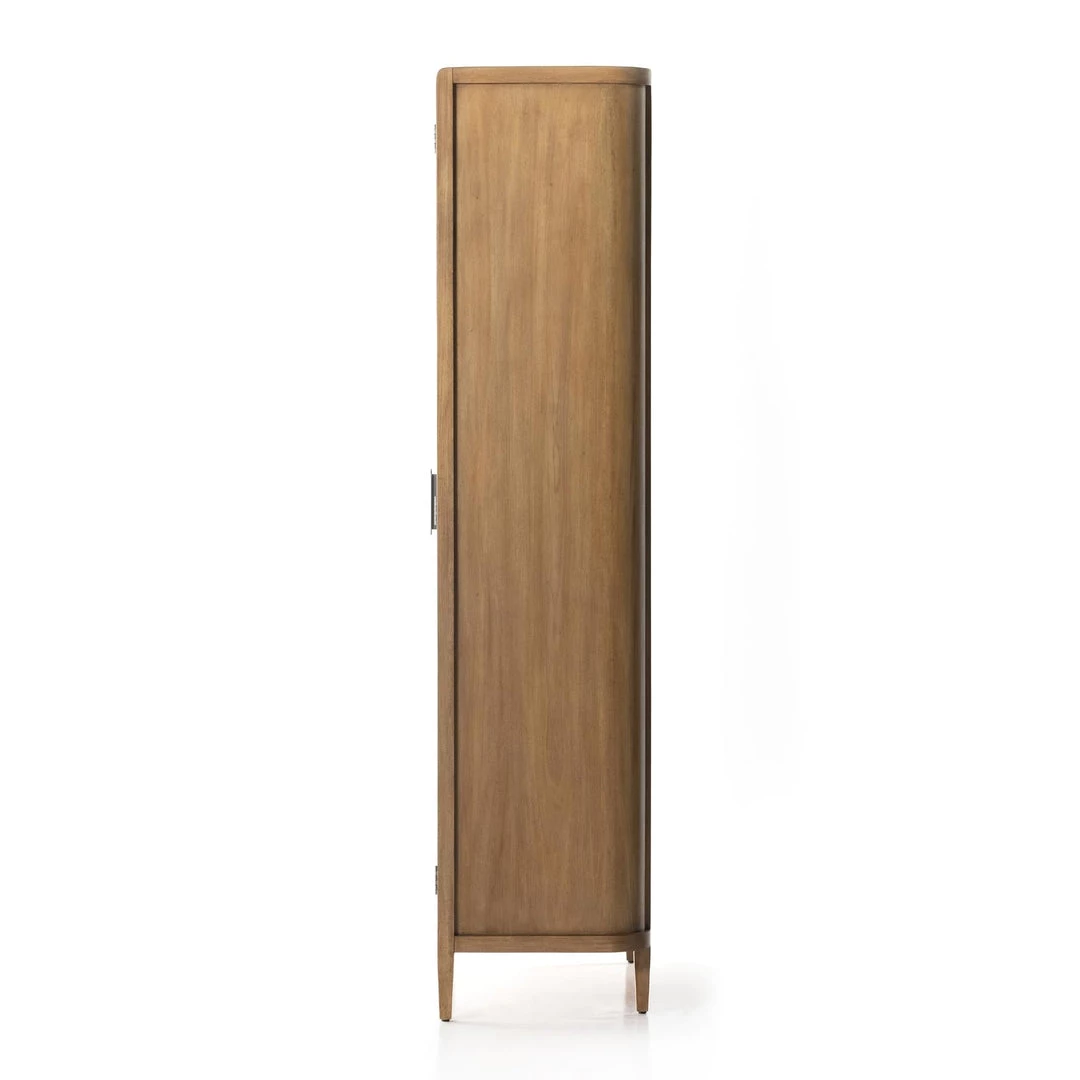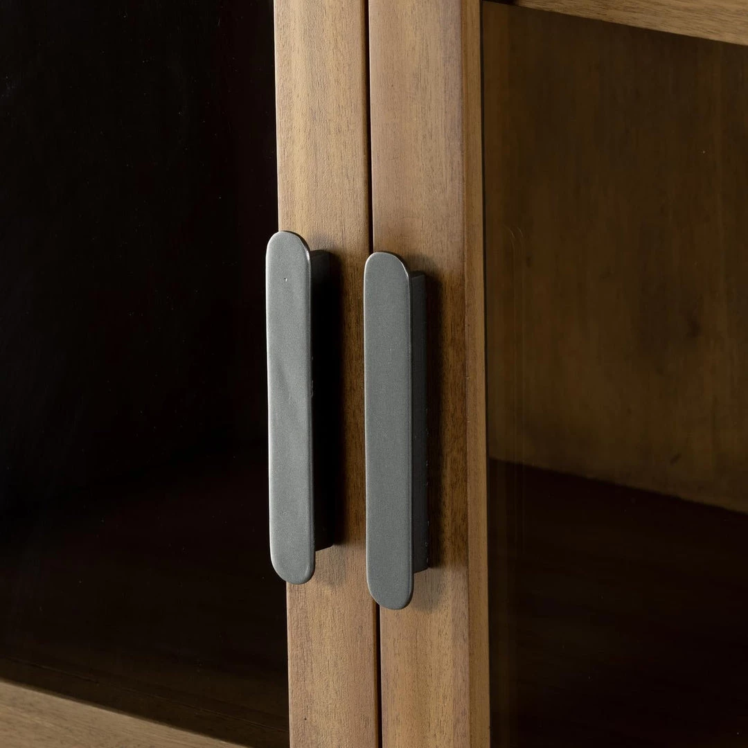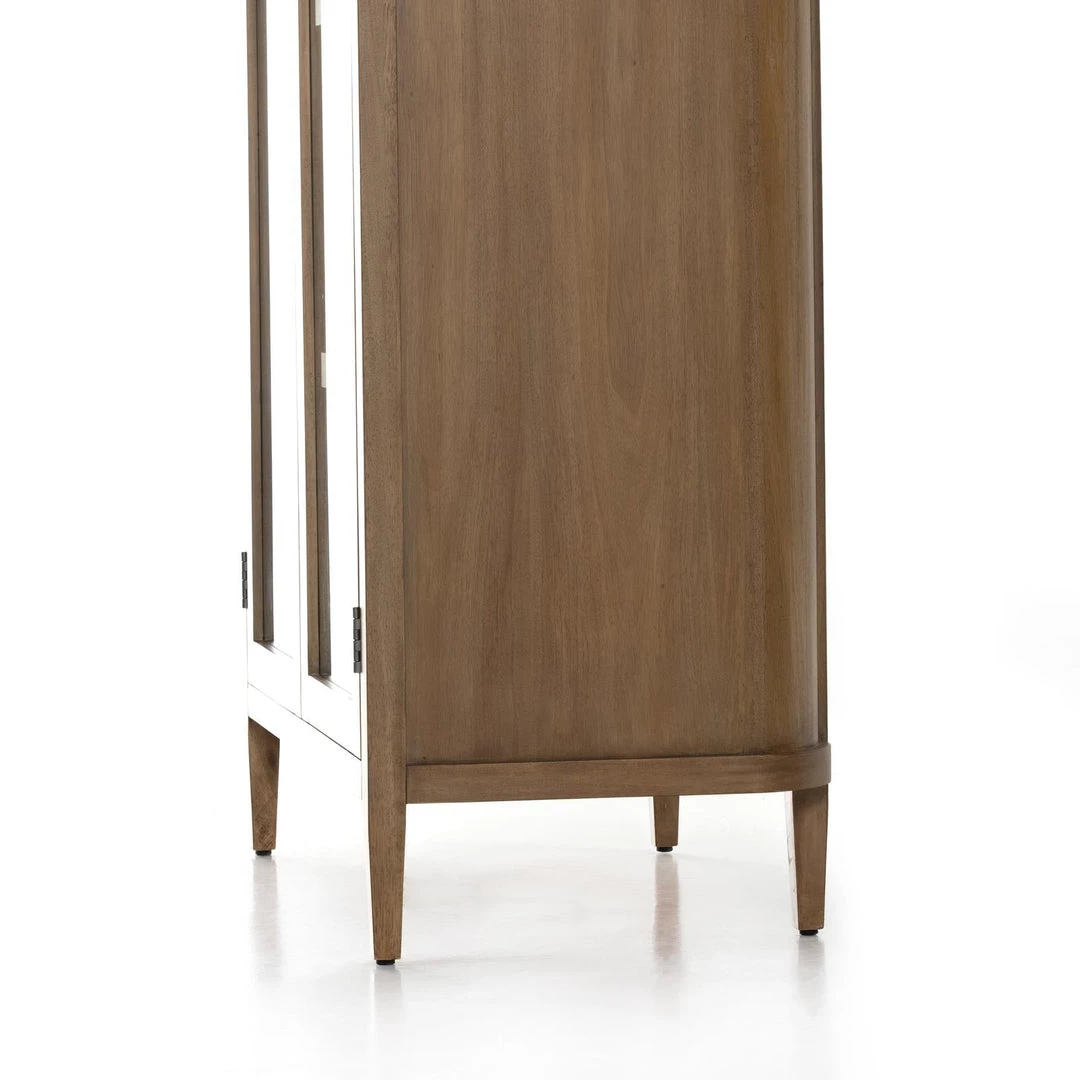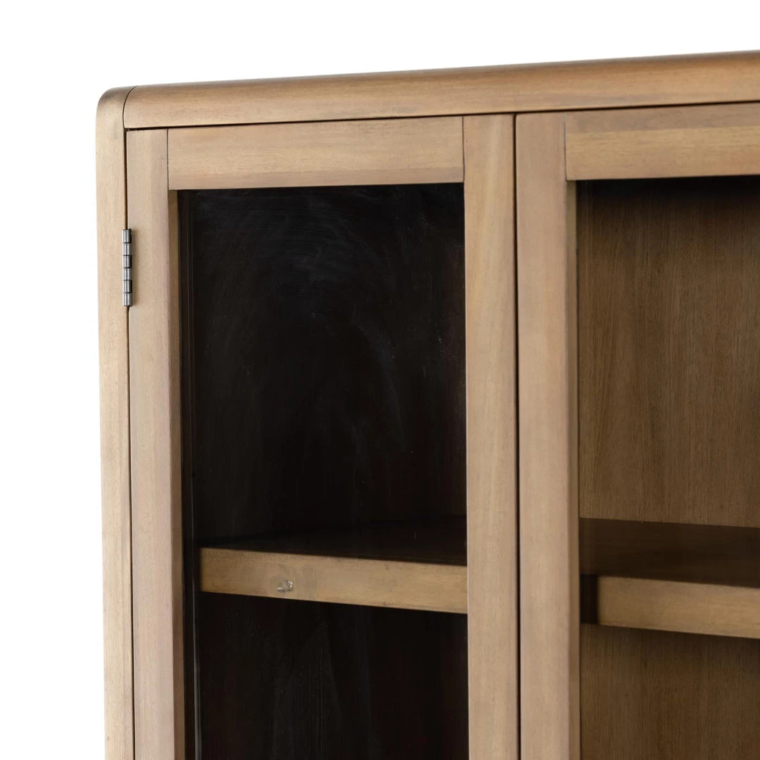 A natural finish and tempered glass door fronts lighten the look of simple-but-stately cabinetry, the perfect place to store and display favorite books, framed photos, keepsakes and more.