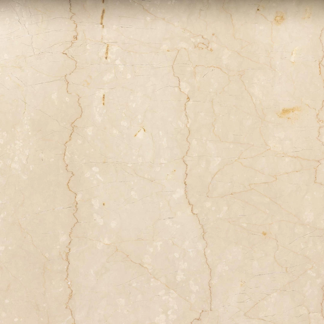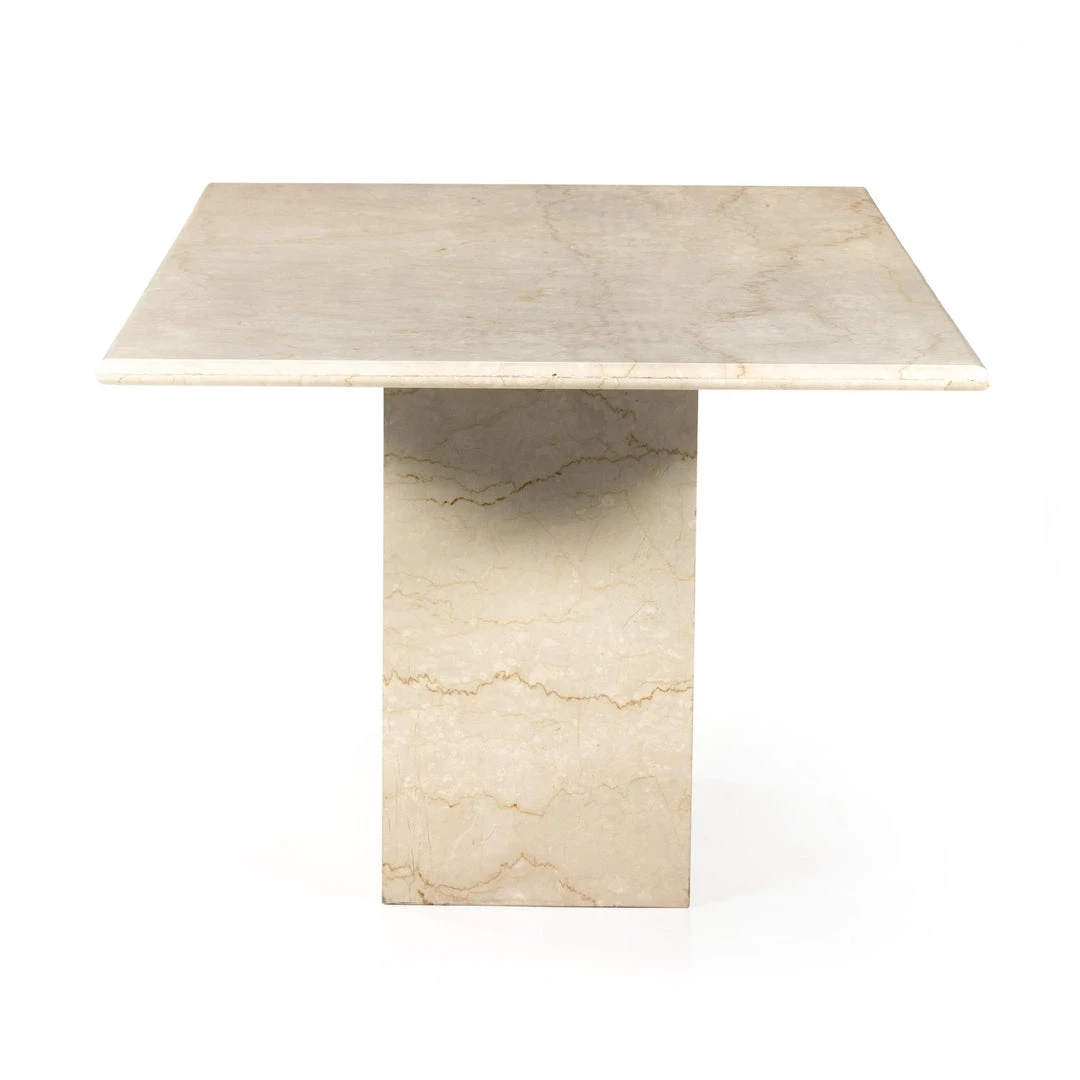 Inspired by grand Italian design of the 1970s, a monolithic dining table of solid cream marble seats six comfortably.