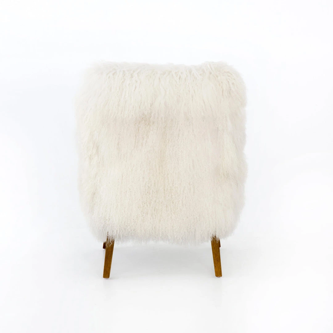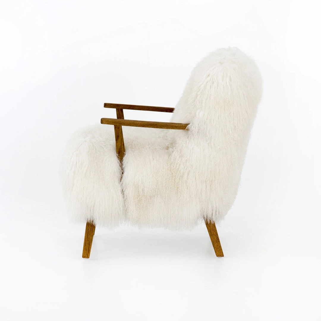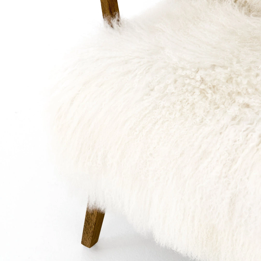 The modern statement-maker. Sculpted arms of drifted oak emerge from shaggy, cream-colored seating of Mongolian fur.