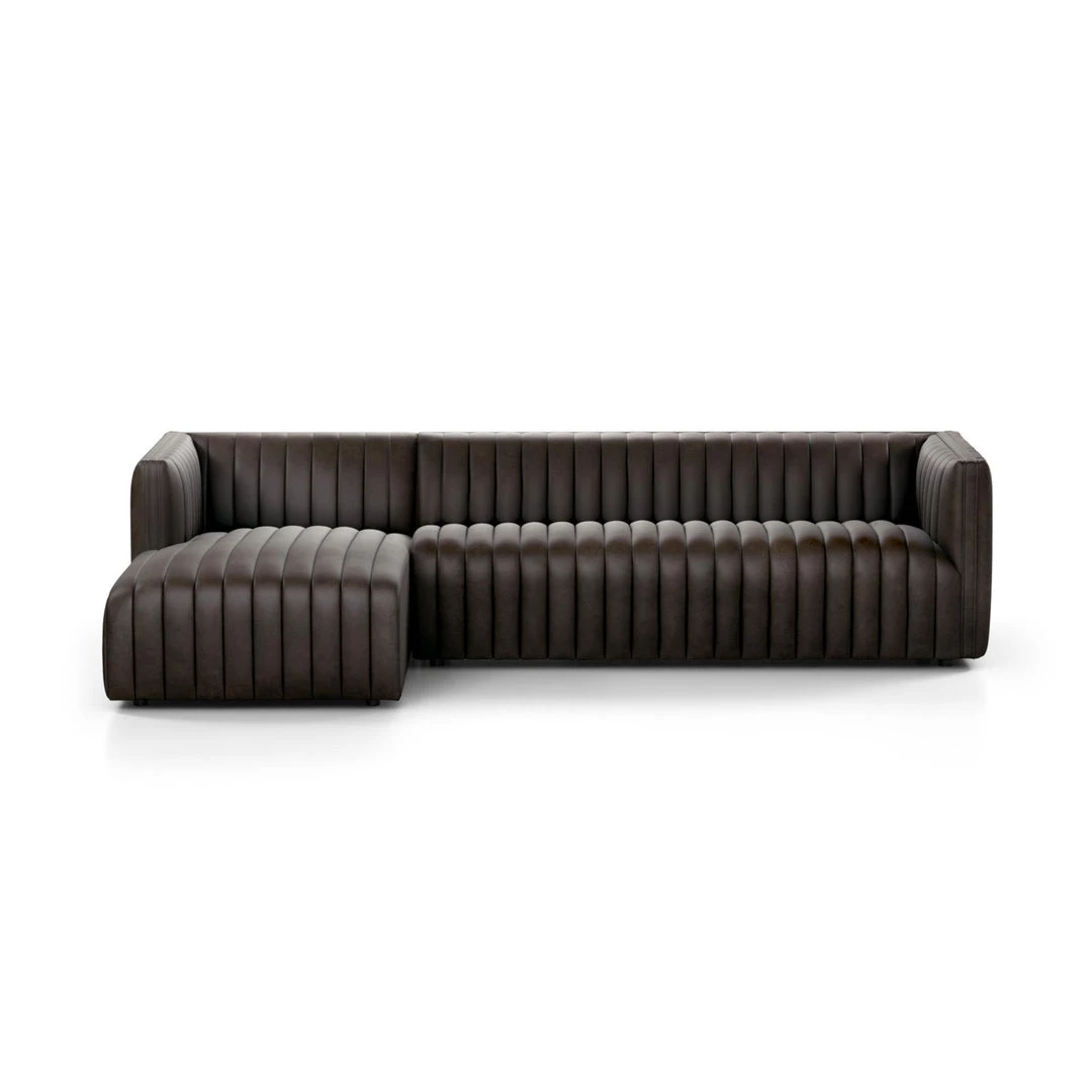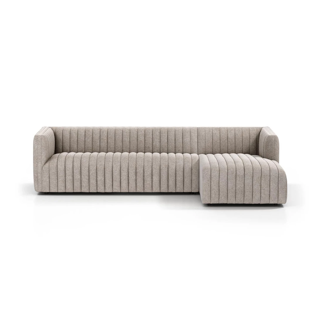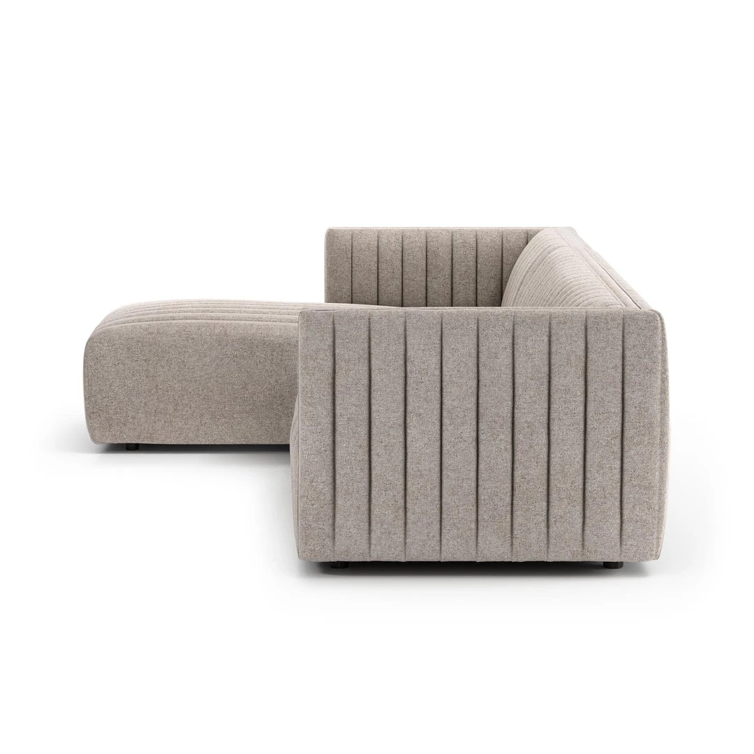 A dramatically channeled sofa with white linen-blend upholstery offers a crisp, clean look and sumptuous sit. Two-piece sectional with left arm-facing chaise, perfectly sized for smaller spaces.