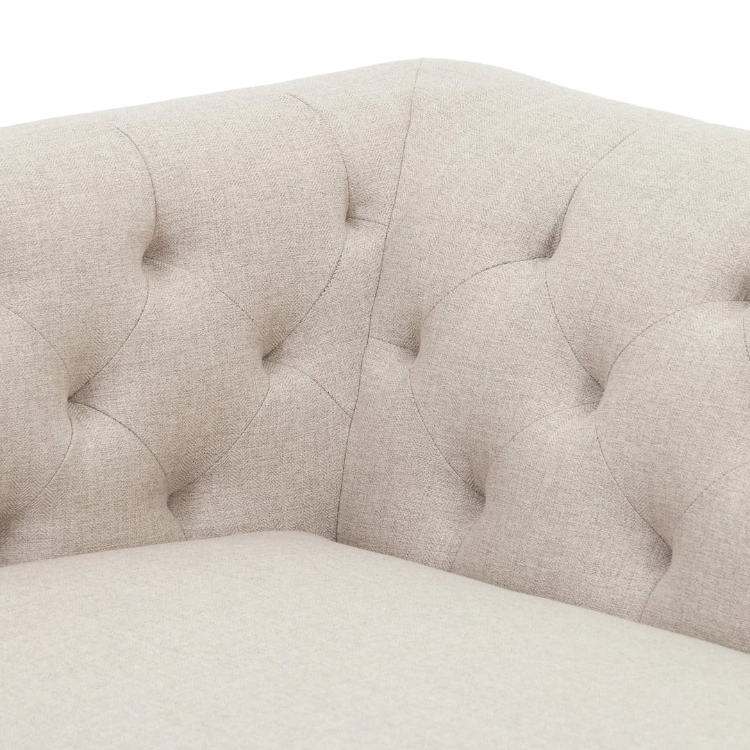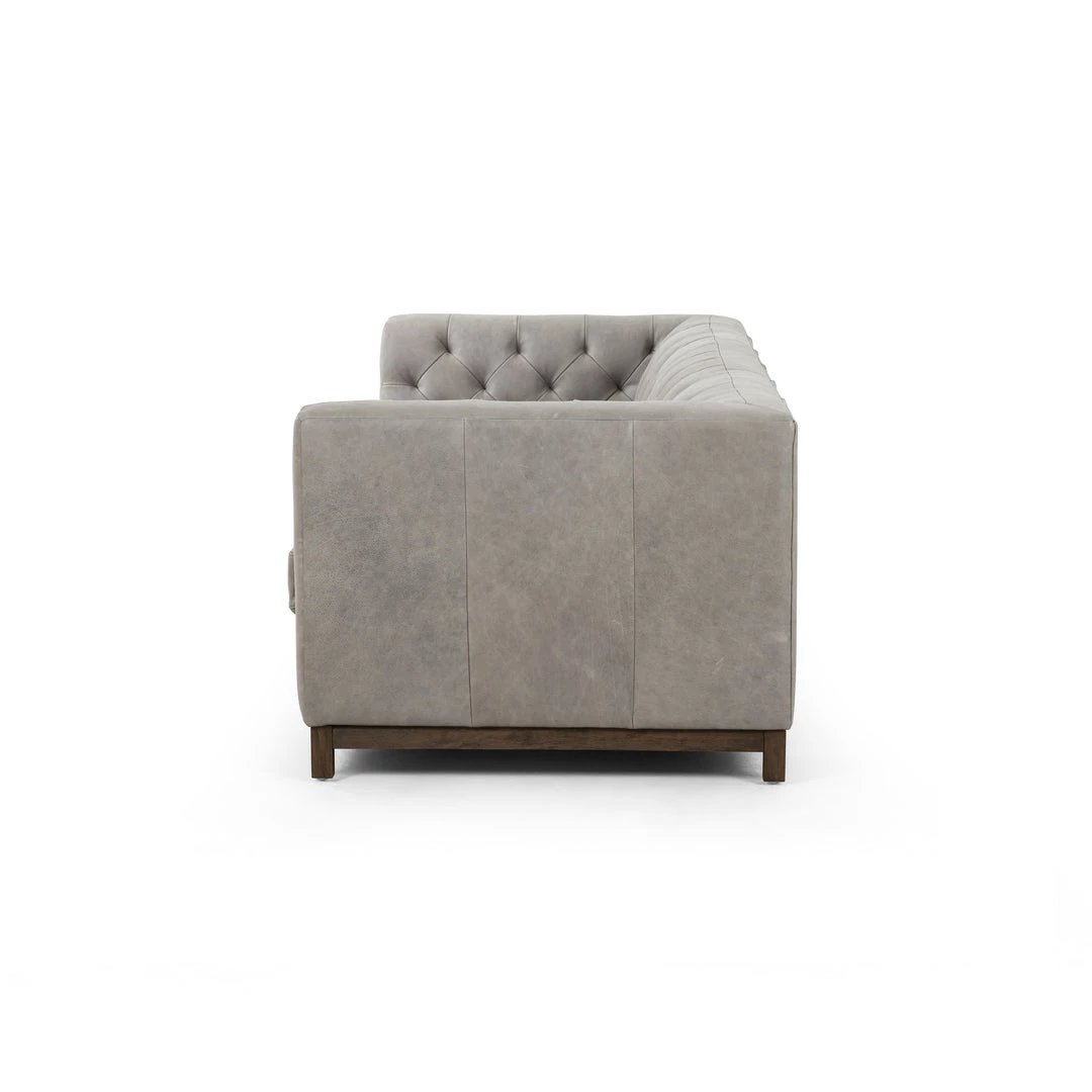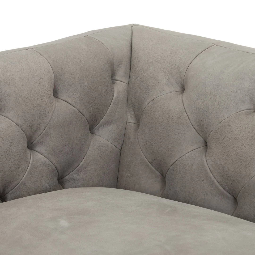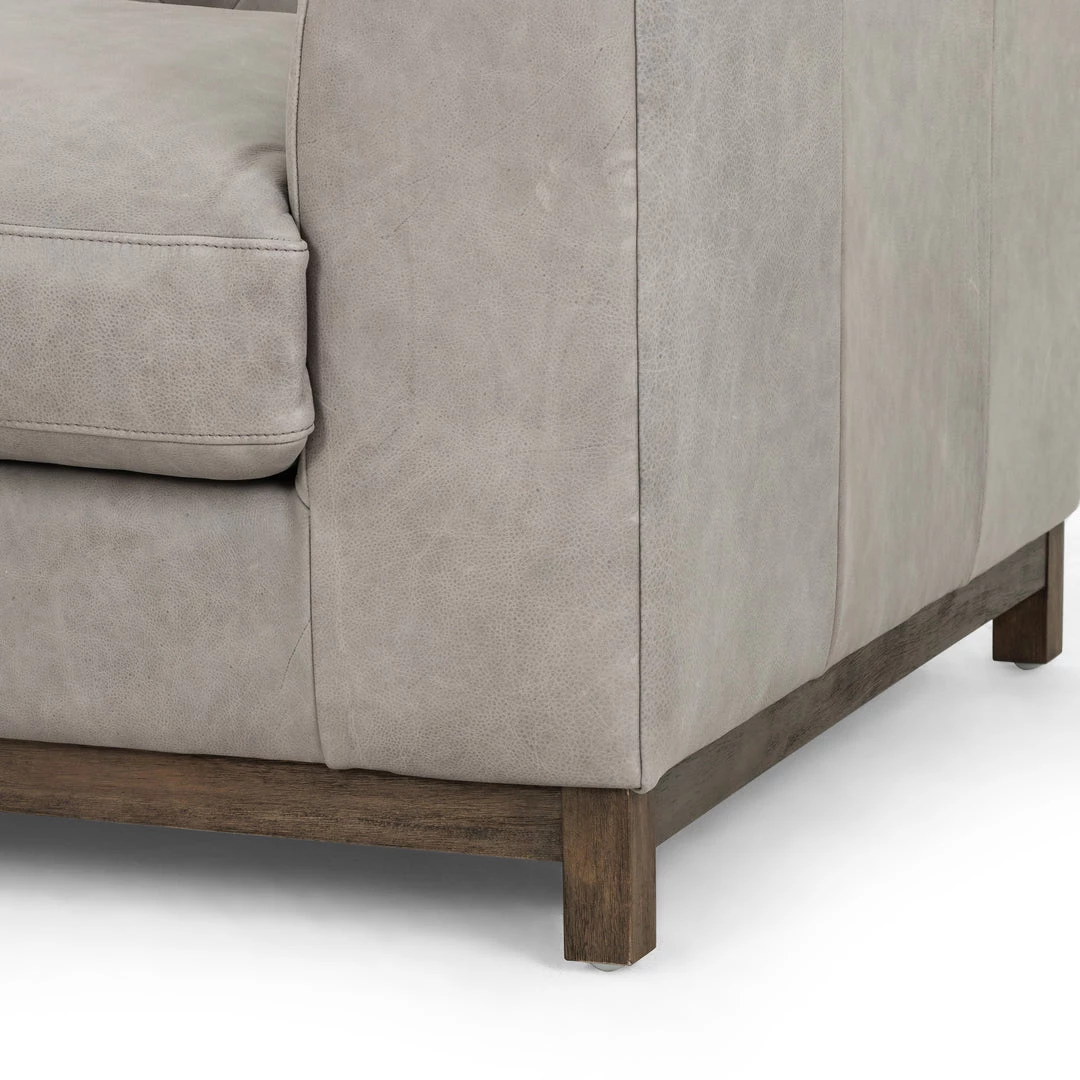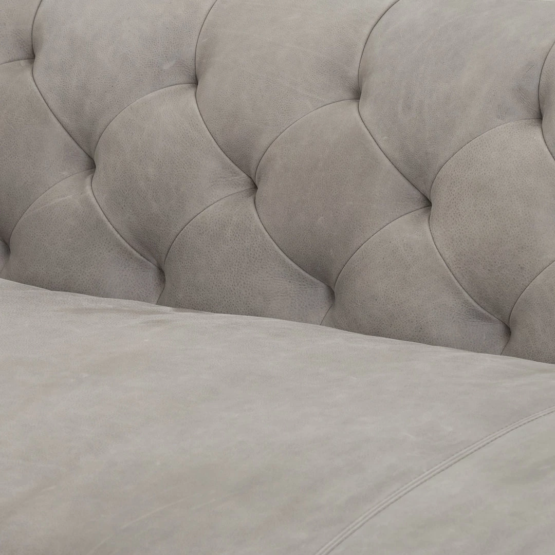 Up updated take on the classic Chesterfield features luxuriously thick-cut top-grain leather in a modern pewter hue. Buttonless tufting lends texture, while a brown wire-brushed parawood base mixes in natural warmth.