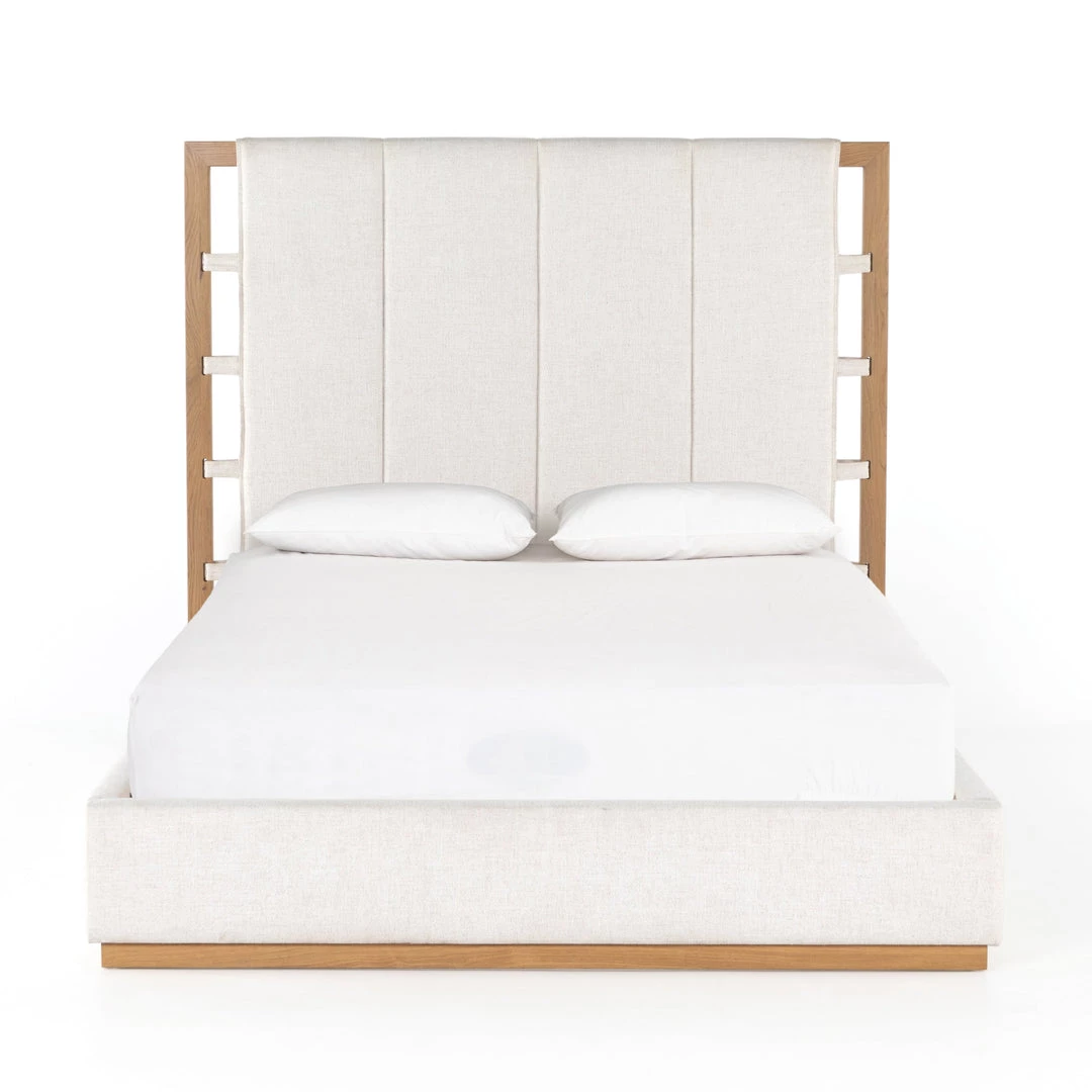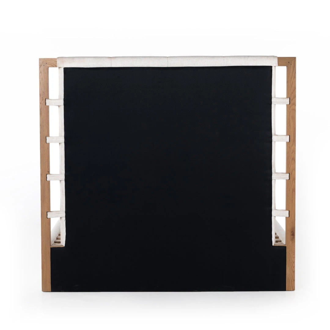 Take bedroom styling to new heights. Framed by a plinth-style base of burnished solid oak, light, linen-like upholstery creates a well-tailored headboard, with vertical channeling and unique strap detailing.