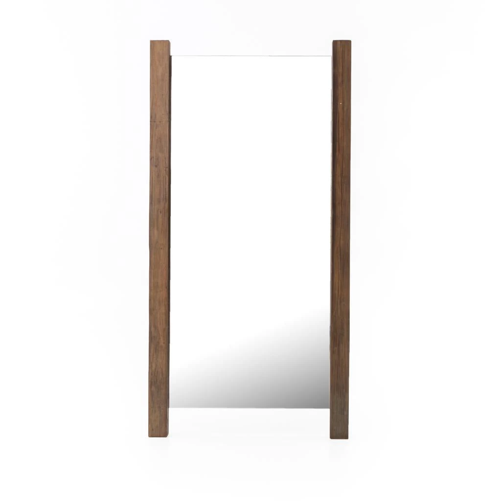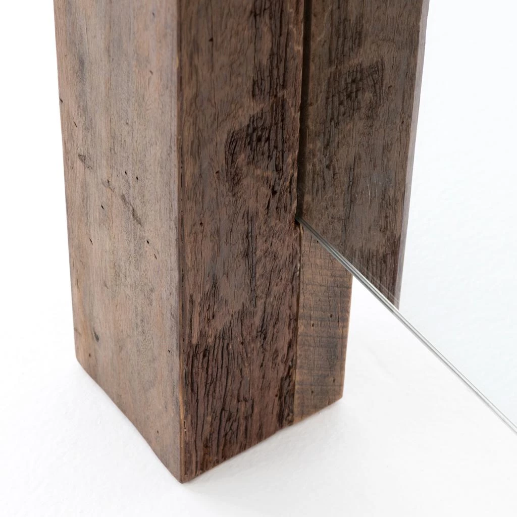 Shimmering mirror is floated within thick beams of reclaimed peroba wood chosen for character graining. Leans against a wall adding modern, monolithic presence to any space.