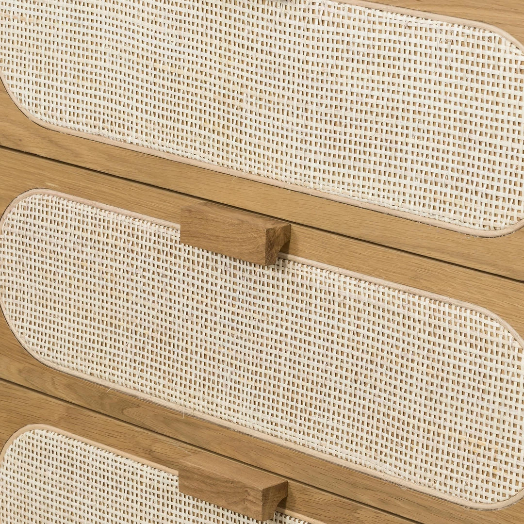 Au naturale. Honey-finished oak welcomes five spacious drawers with wood-backed cane paneling, for a soft, neutral look with lasting modernity.