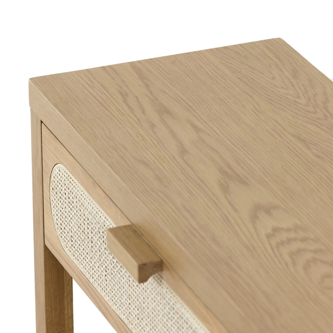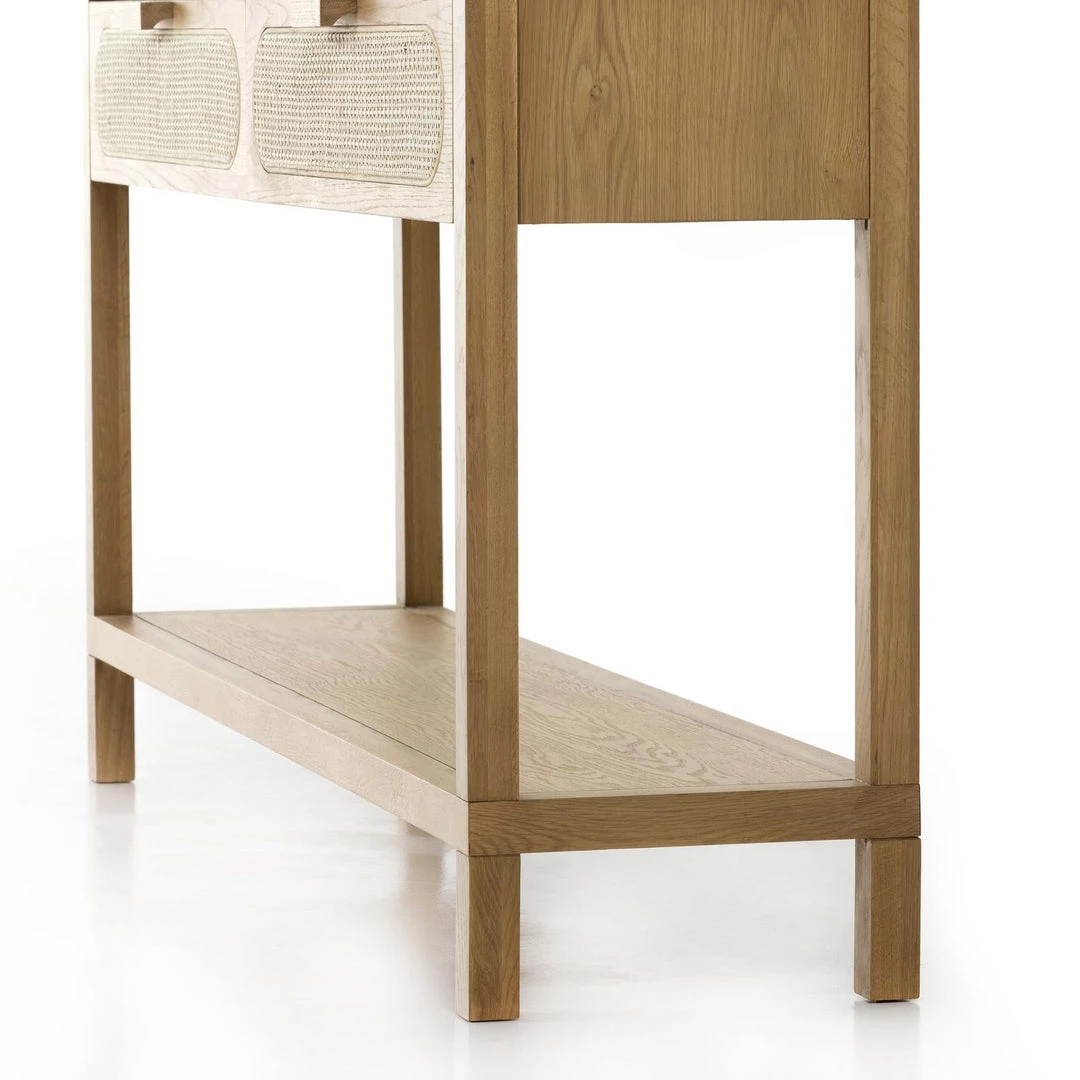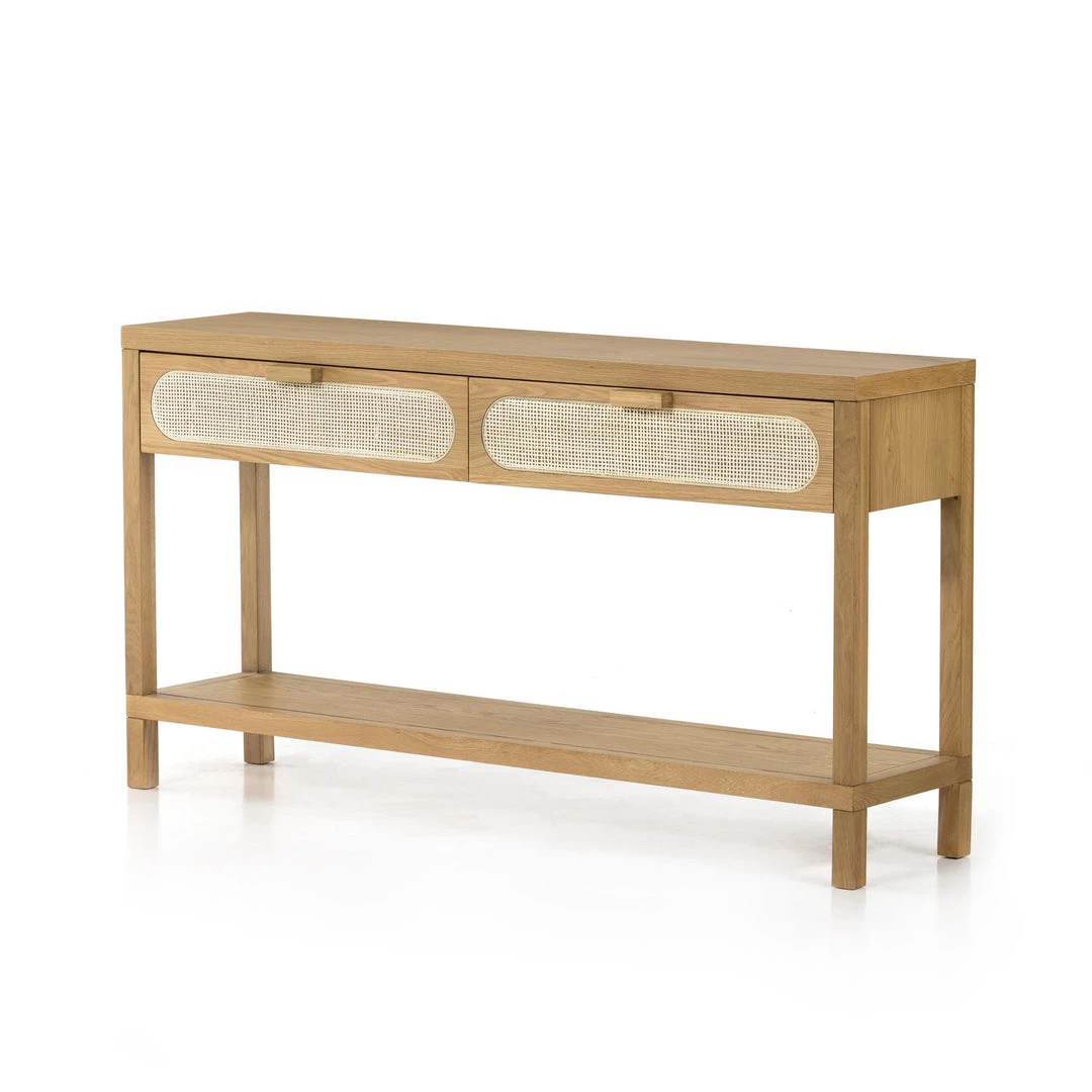 Au naturale. A light-looking console table of honey-finished oak features dual drawers with pill-shaped cane fronts, for a soft, neutral look with trend-forward allure.