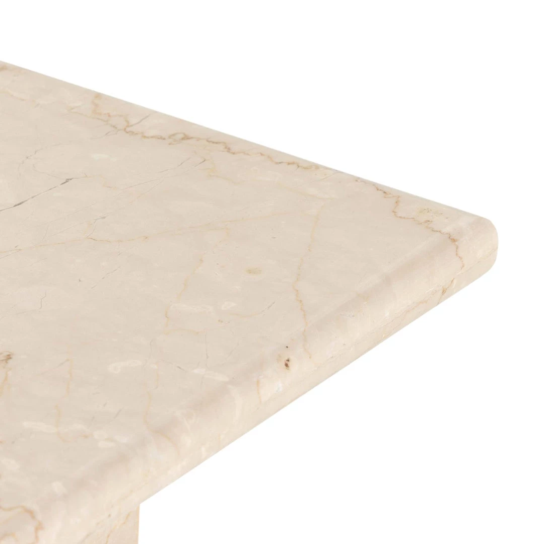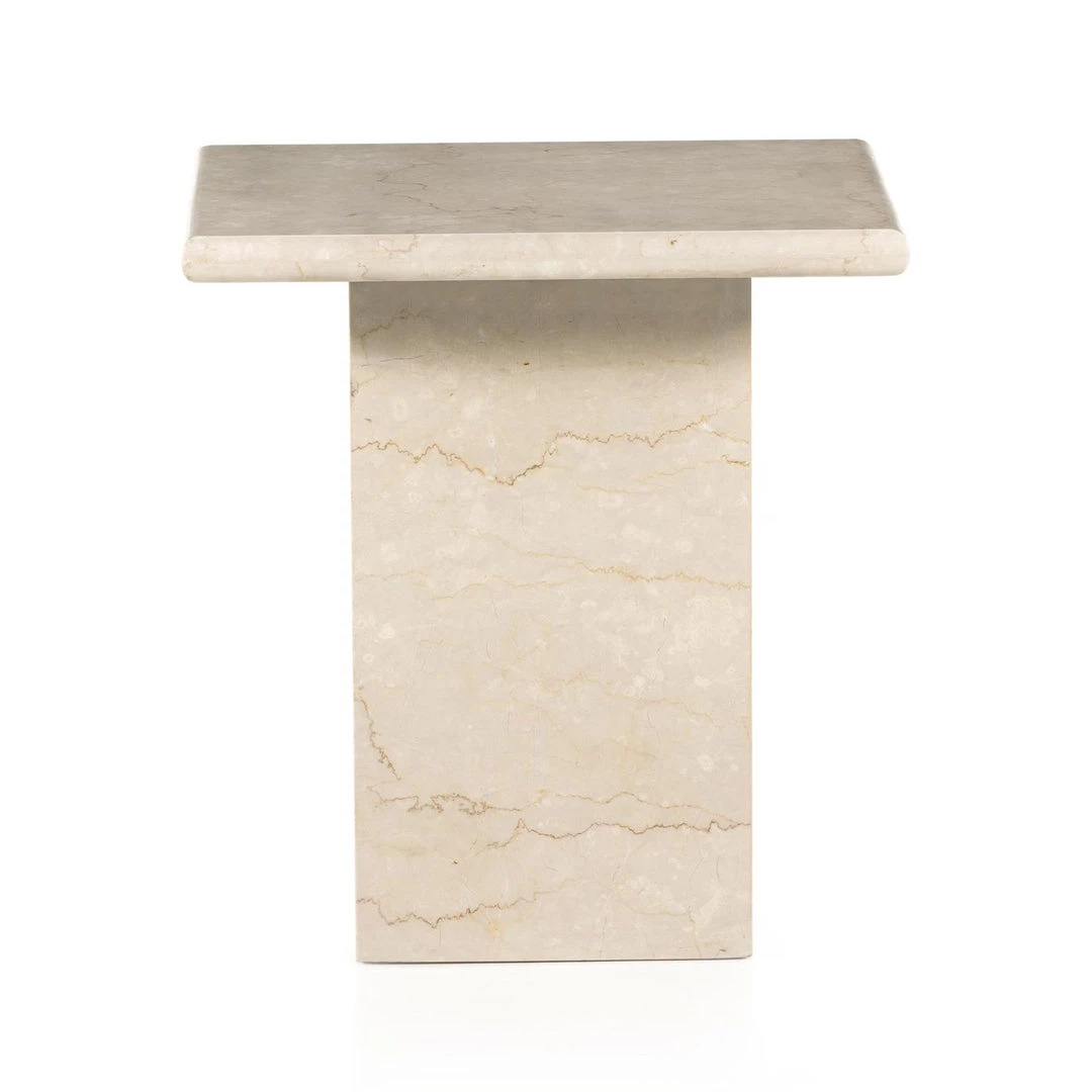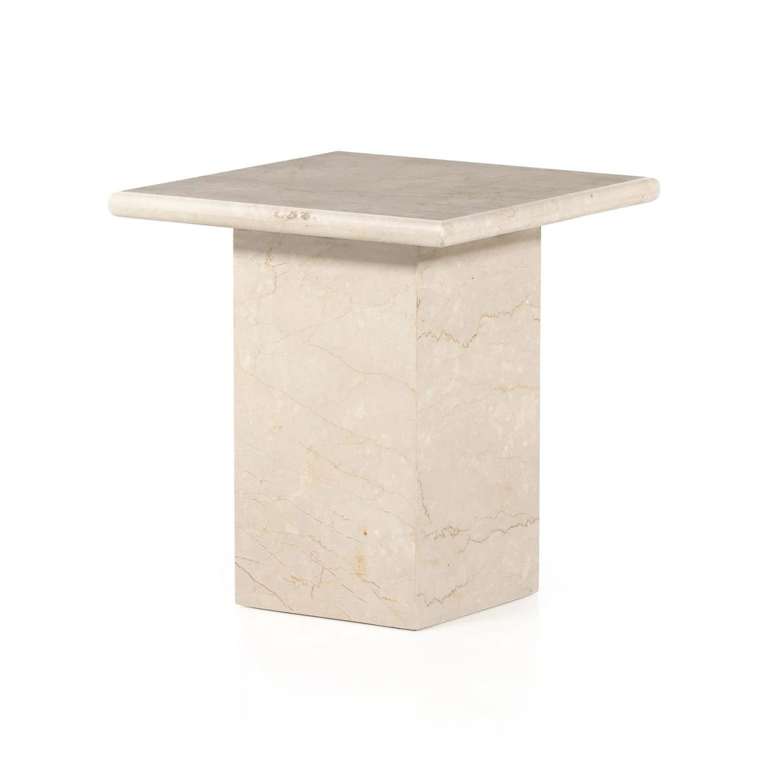 Inspired by Italian design of the 1970s, a monolithic end table is made entirely from solid marble in a soft cream.