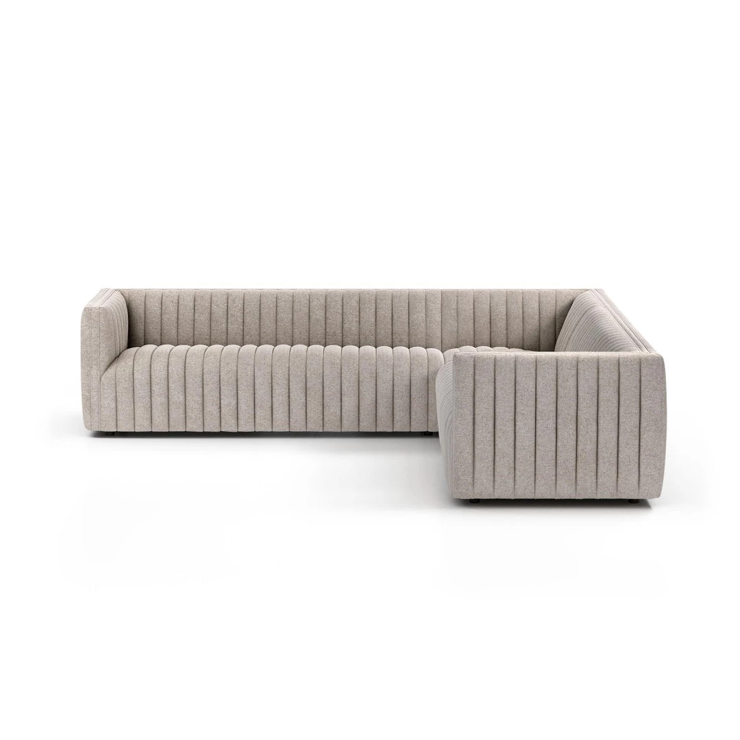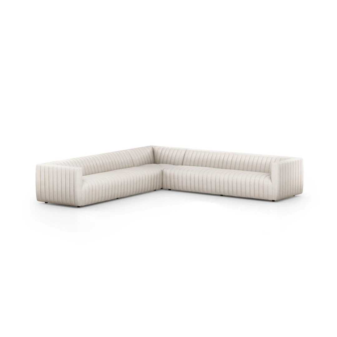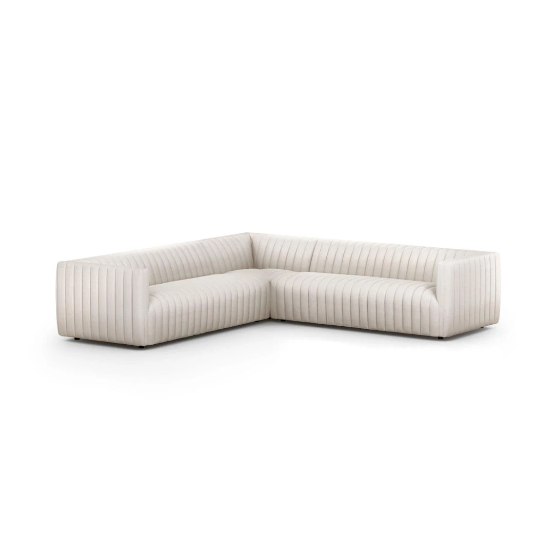 A dramatically channeled sofa with white linen-blend upholstery offers a crisp, clean look and sumptuous sit. Three-piece L sectional, perfectly sized for smaller spaces.