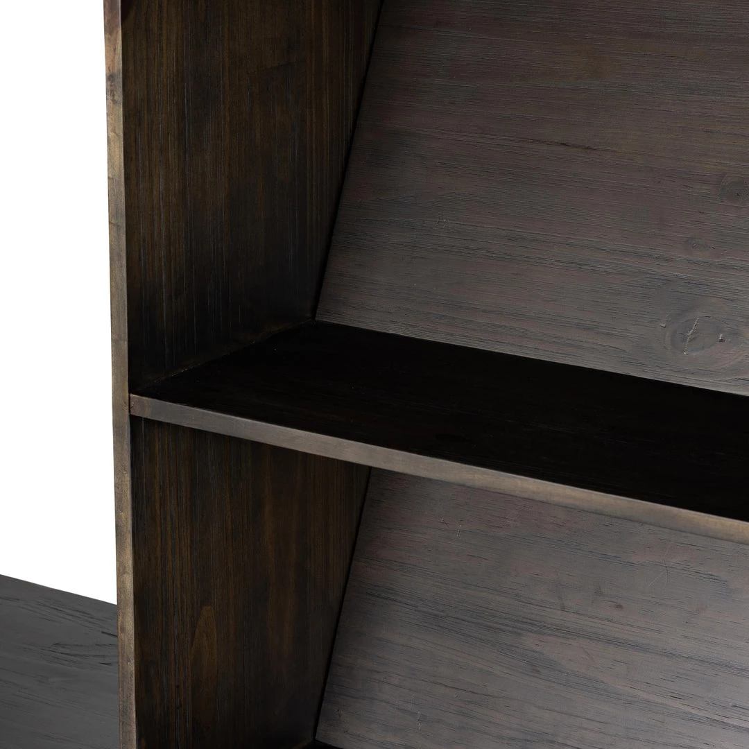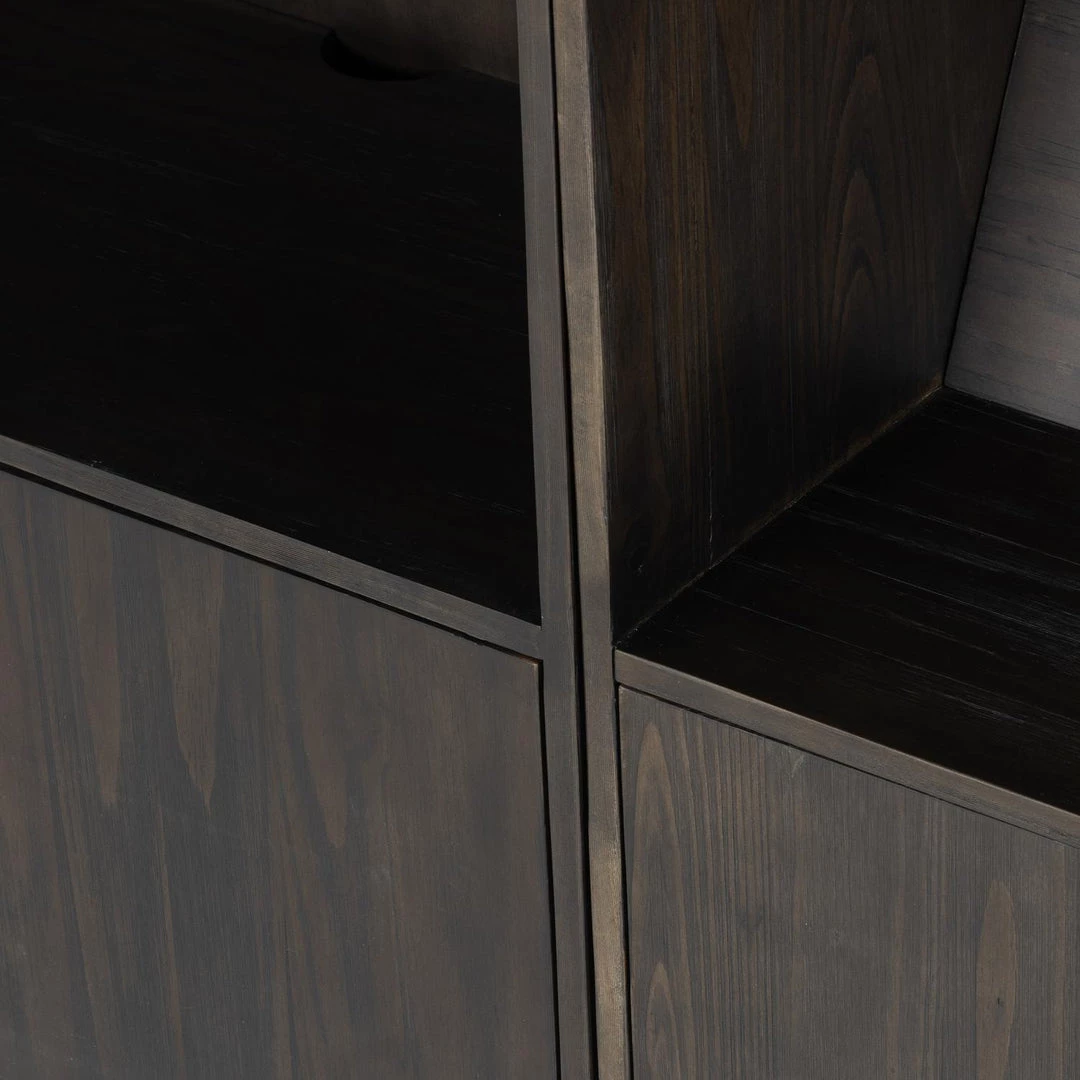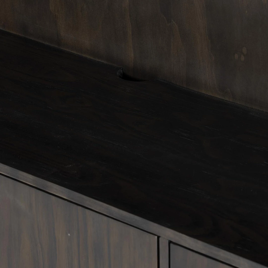 Turn up the storage. Made from solid pine finished in a dark charcoal, an oversize console features ample open and interior storage for display and media needs alike. Dual rear cutouts for cord management.