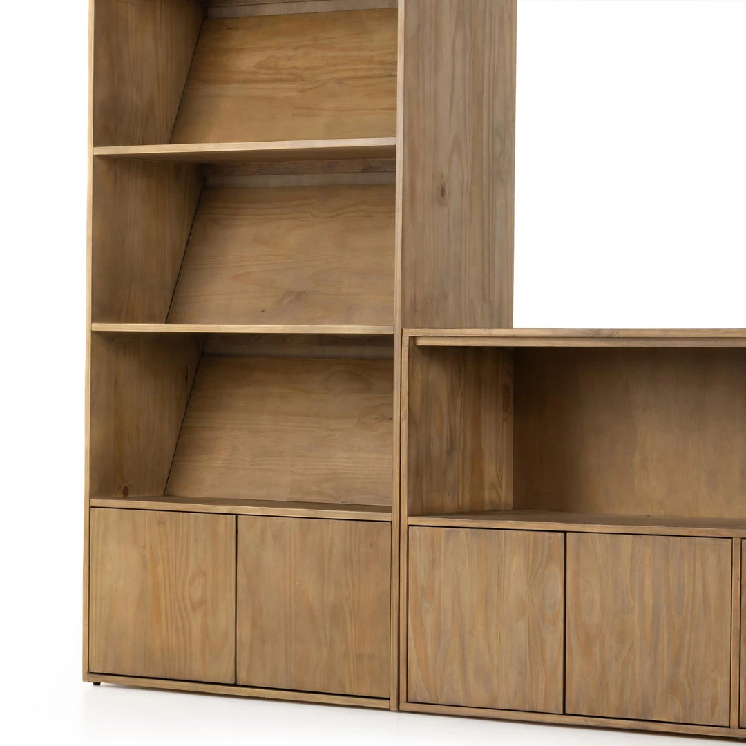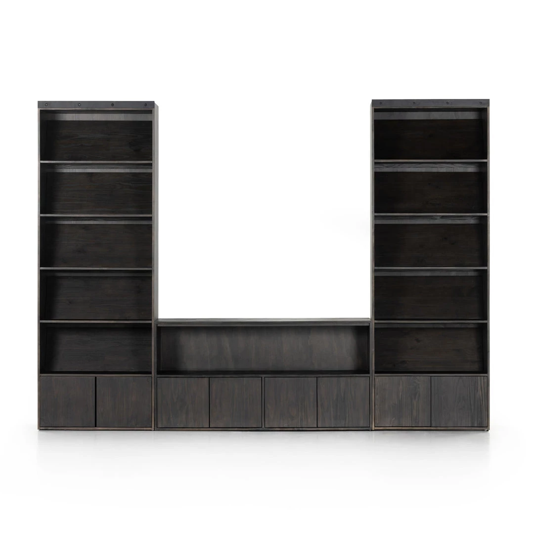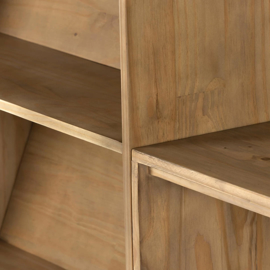 Turn up the storage. Made from solid pine finished in a dark charcoal, an oversize console features ample open and interior storage for display and media needs alike. Dual rear cutouts for cord management.
