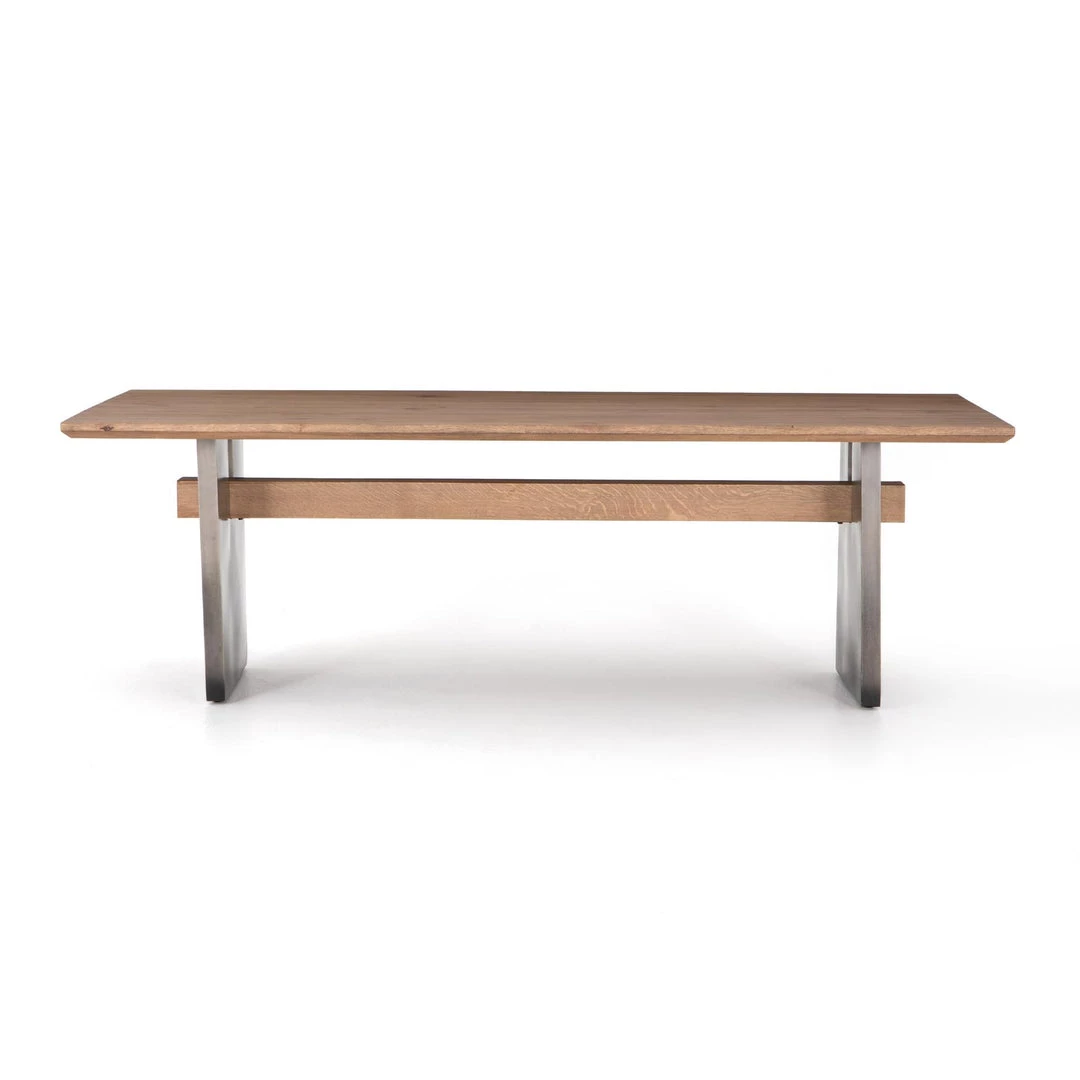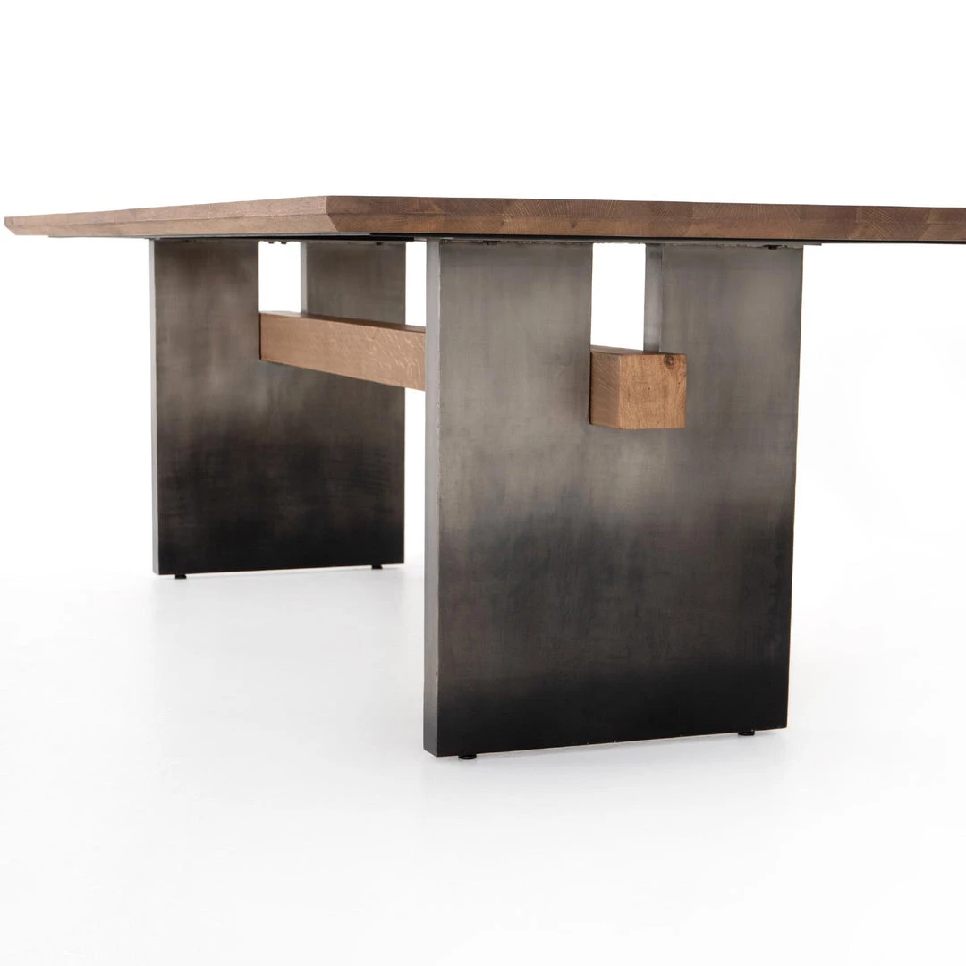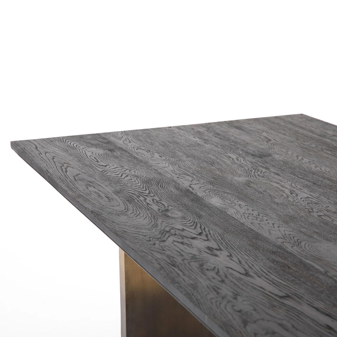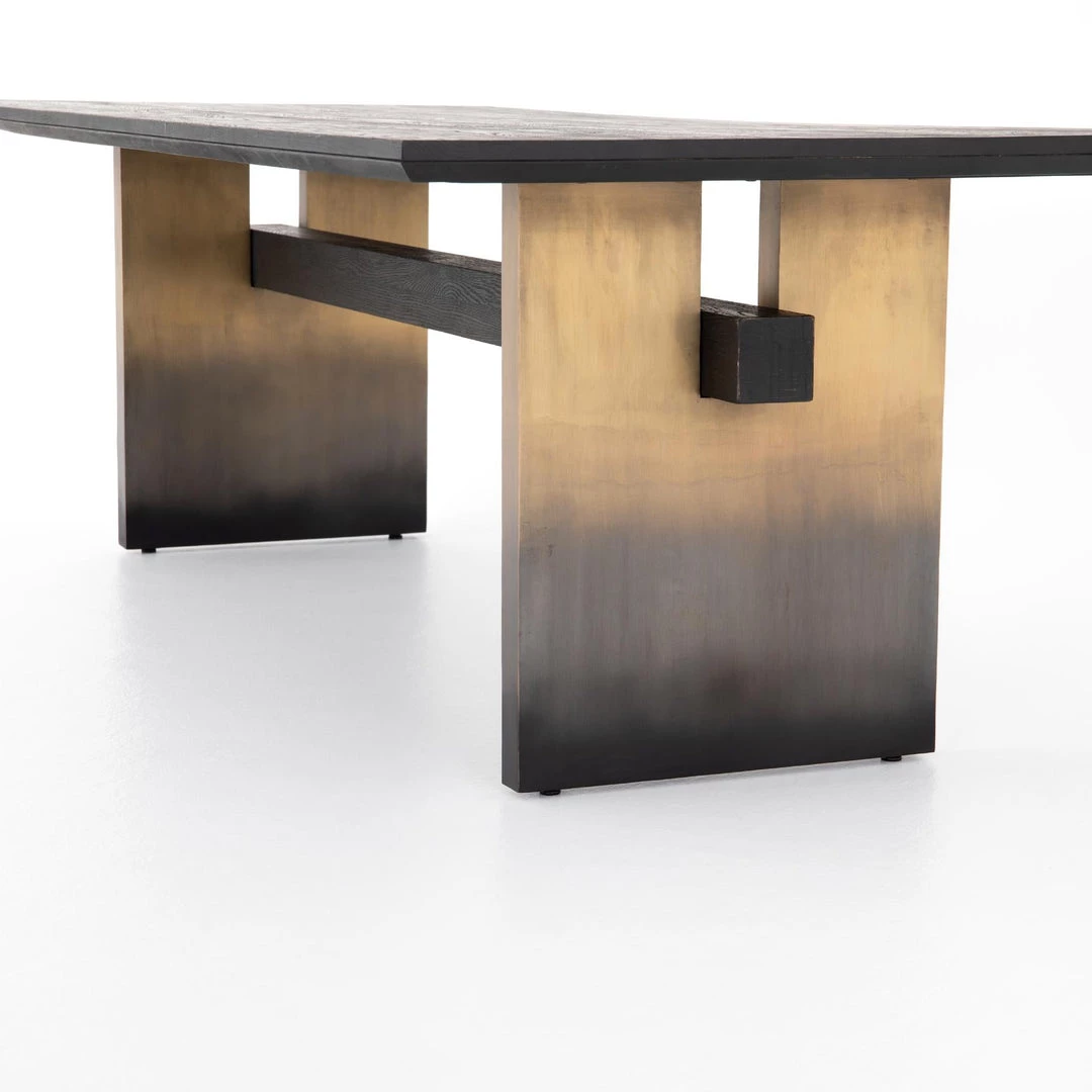 Wide, plank-style legs of brass-finished stainless steel feature an ombre pattern for eye-catching effect, with an intersecting beam adding intrigue. A rectangular black oak tabletop flaunts its materials’ natural graining, for a richly organic takeaway.