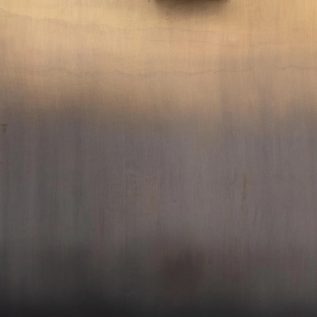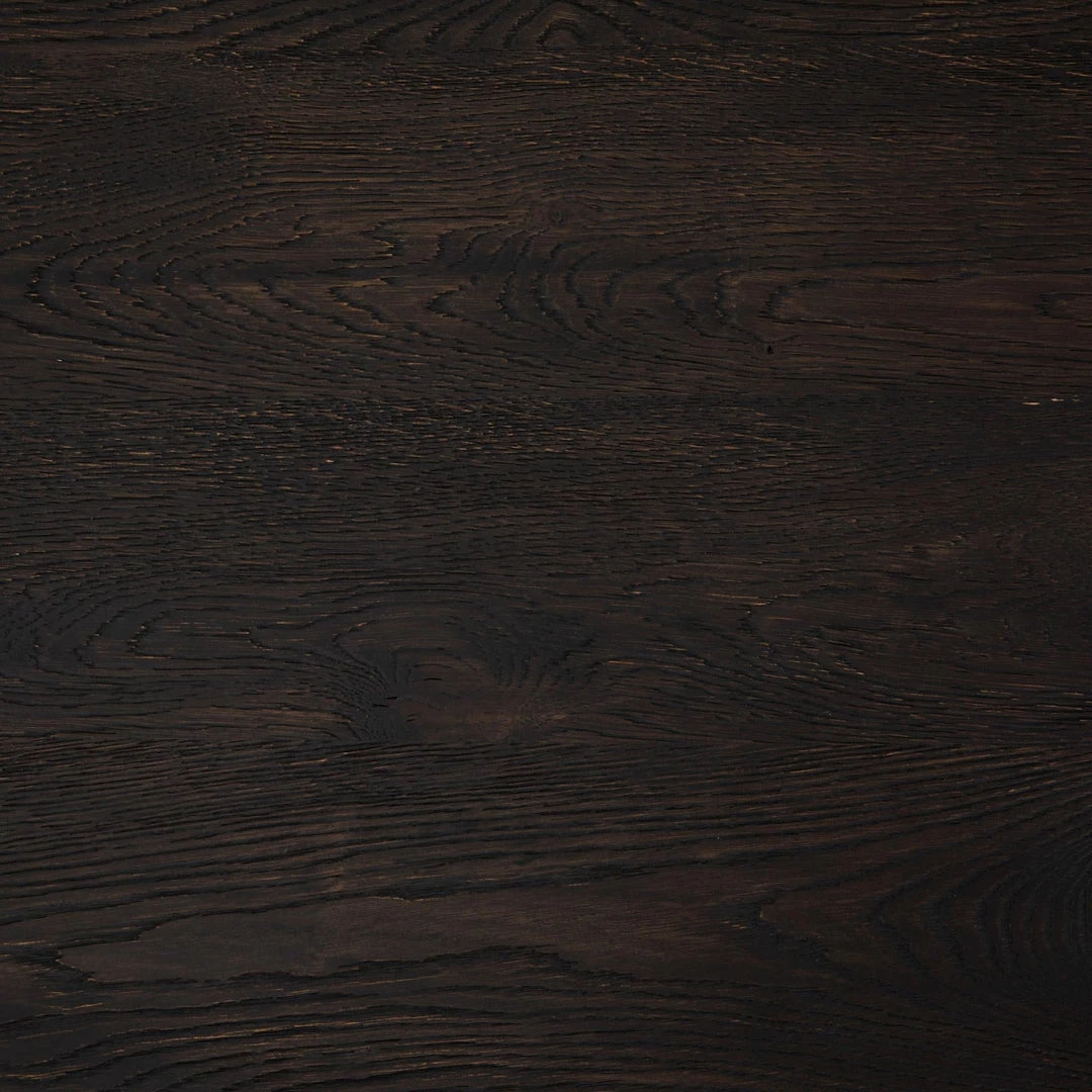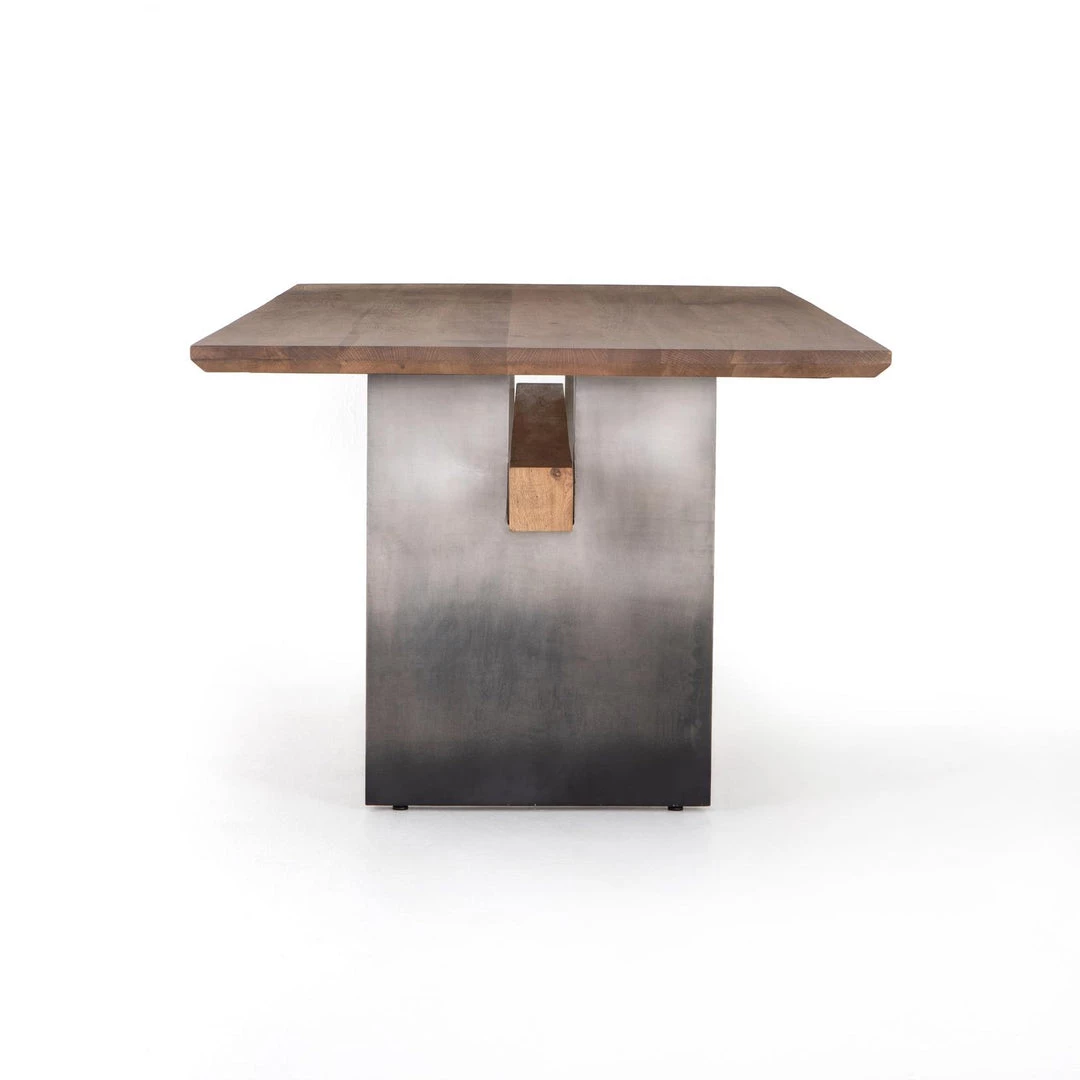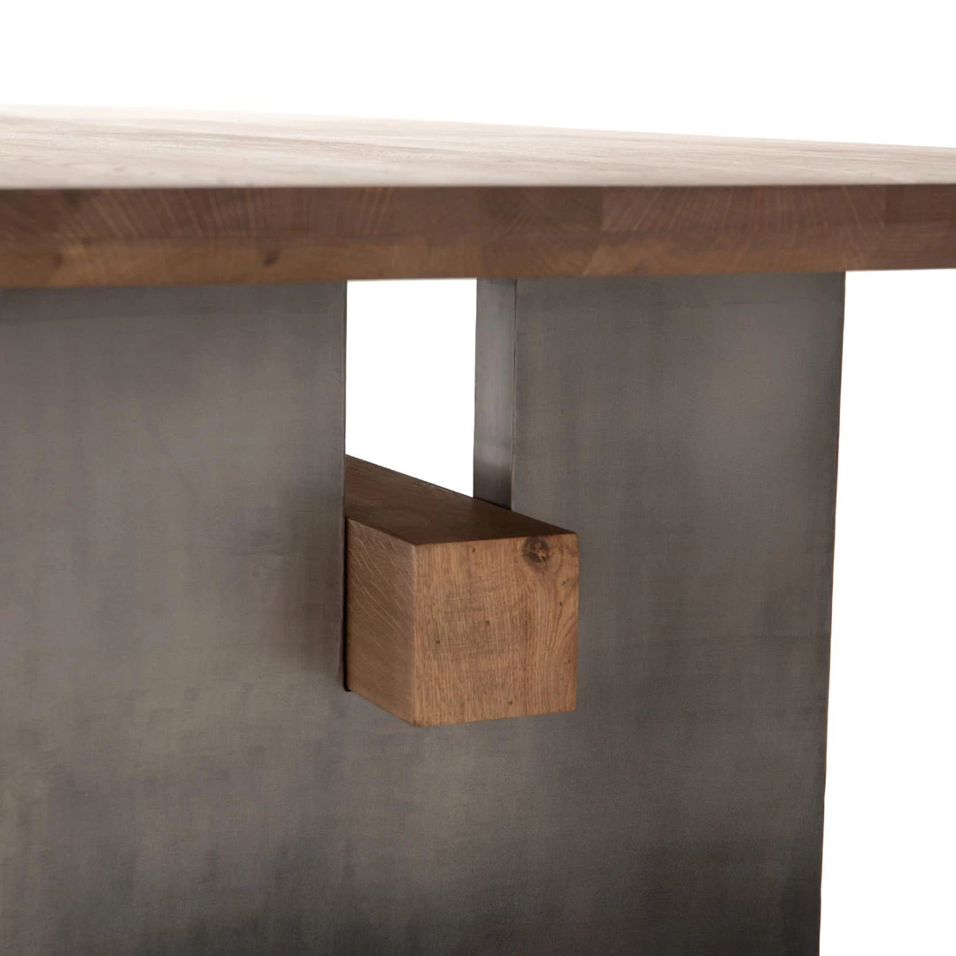 Wide, plank-style legs of brass-finished stainless steel feature an ombre pattern for eye-catching effect, with an intersecting beam adding intrigue. A rectangular black oak tabletop flaunts its materials’ natural graining, for a richly organic takeaway.