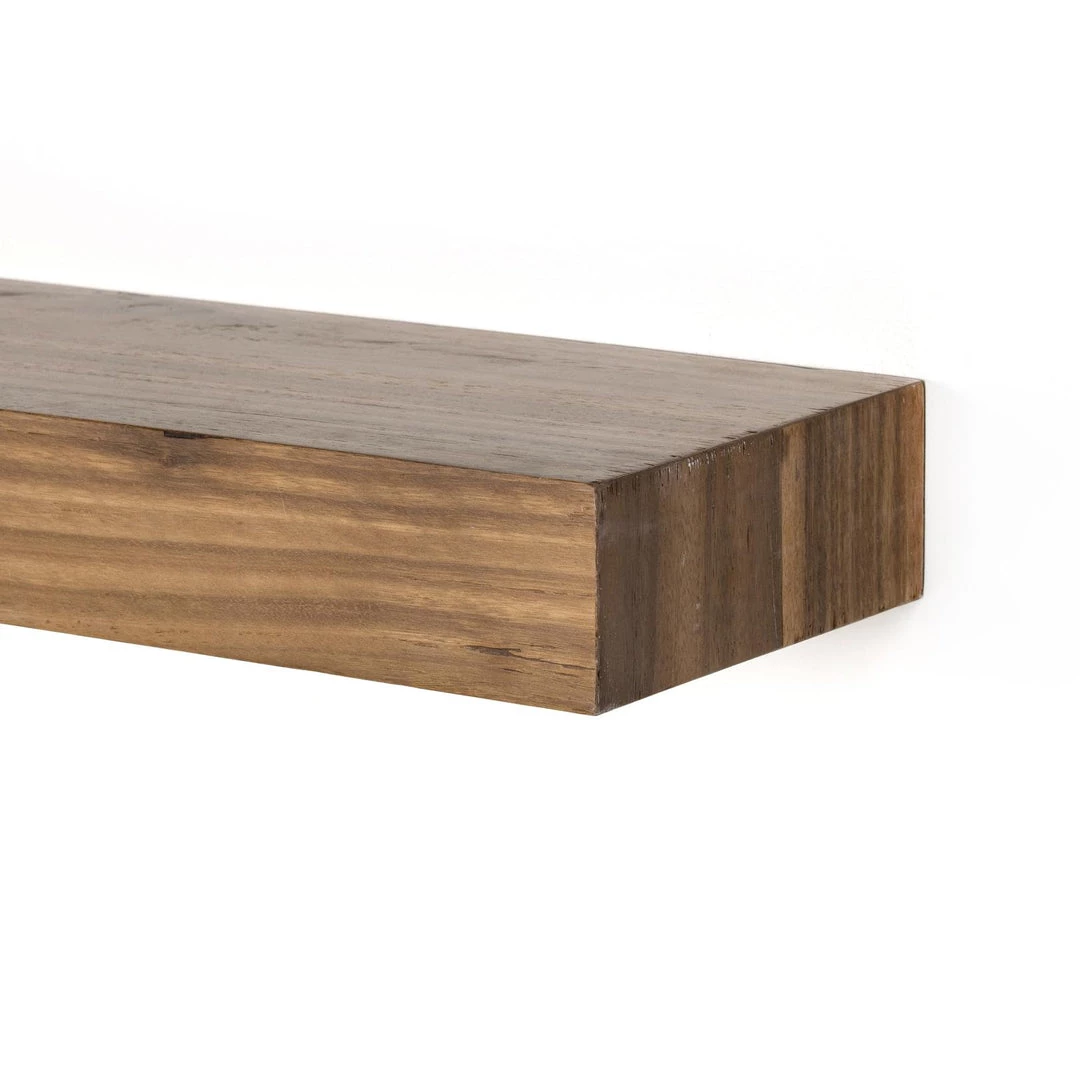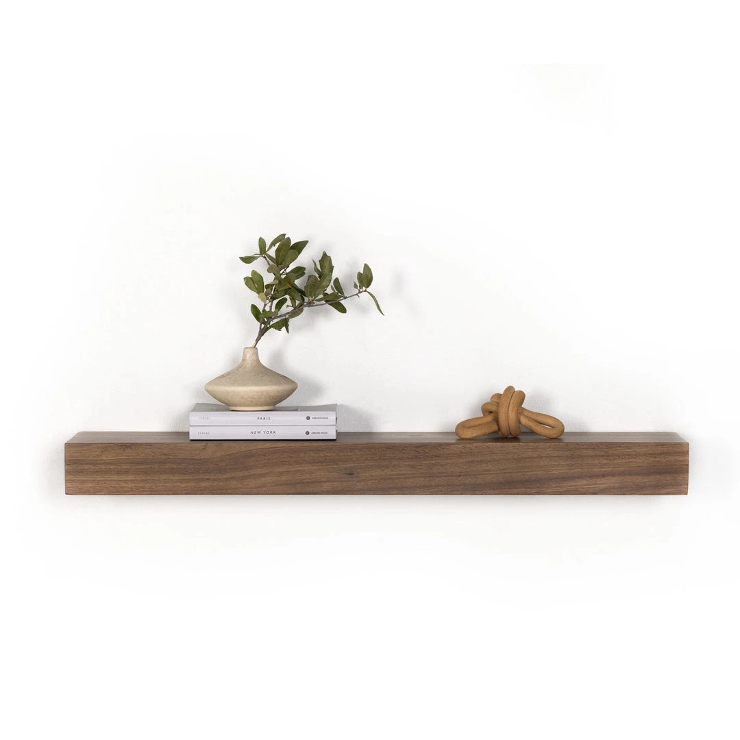 A wall-mountable shelf of natural thick-cut yukas is ready to welcome favorite books and decorative treasures. Great solo or in multiples.