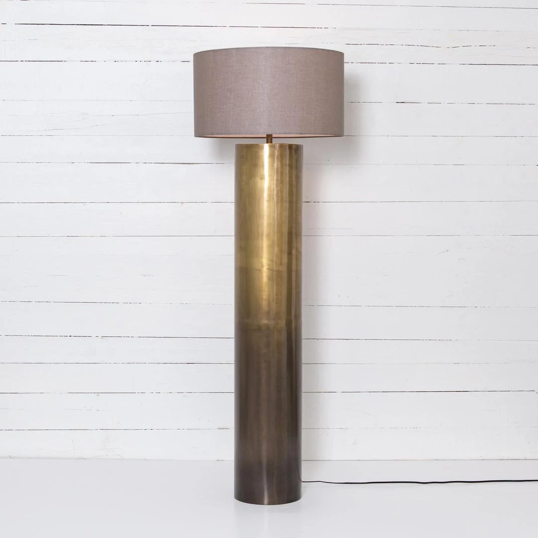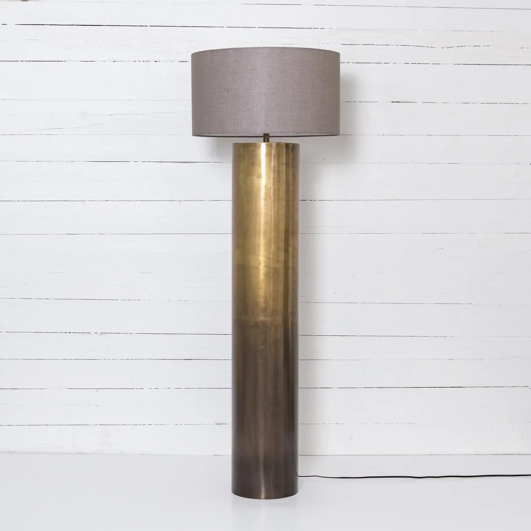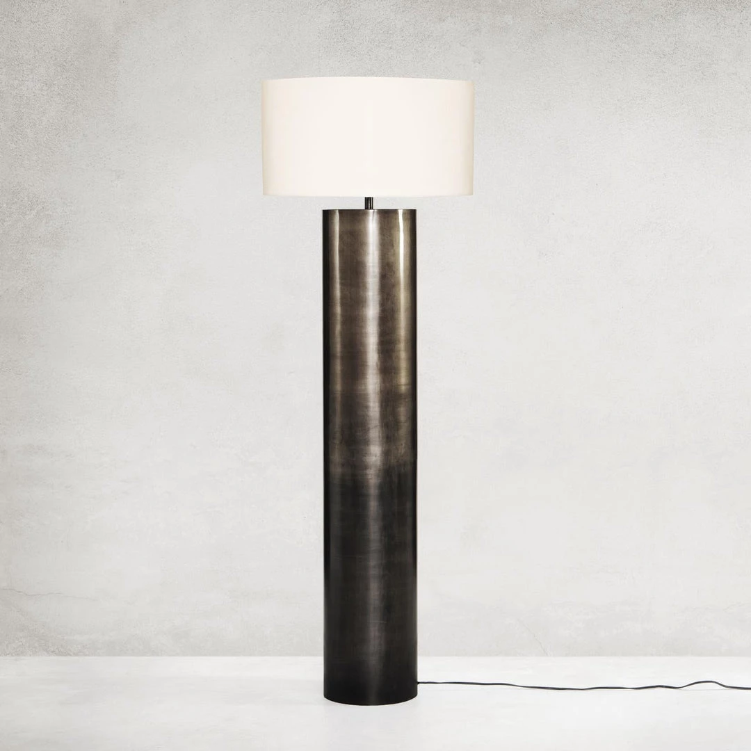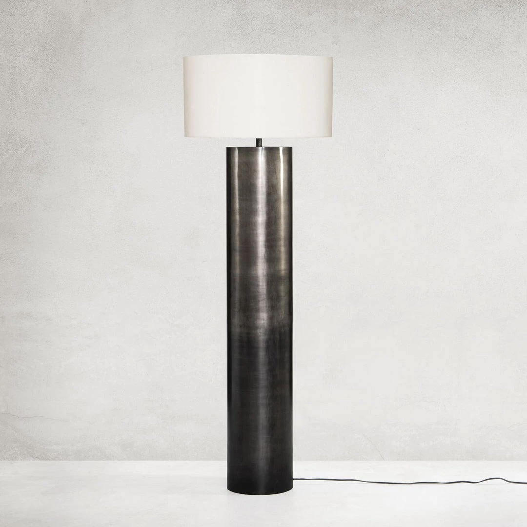 An antique pewter finish highlights iron’s gradual blending of hues, delivering a distinctive ombre effect to the cylindrical floor lamp. A white silk shade plays up this fresh mixing of materials.