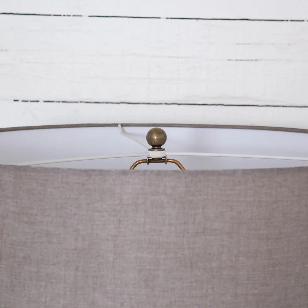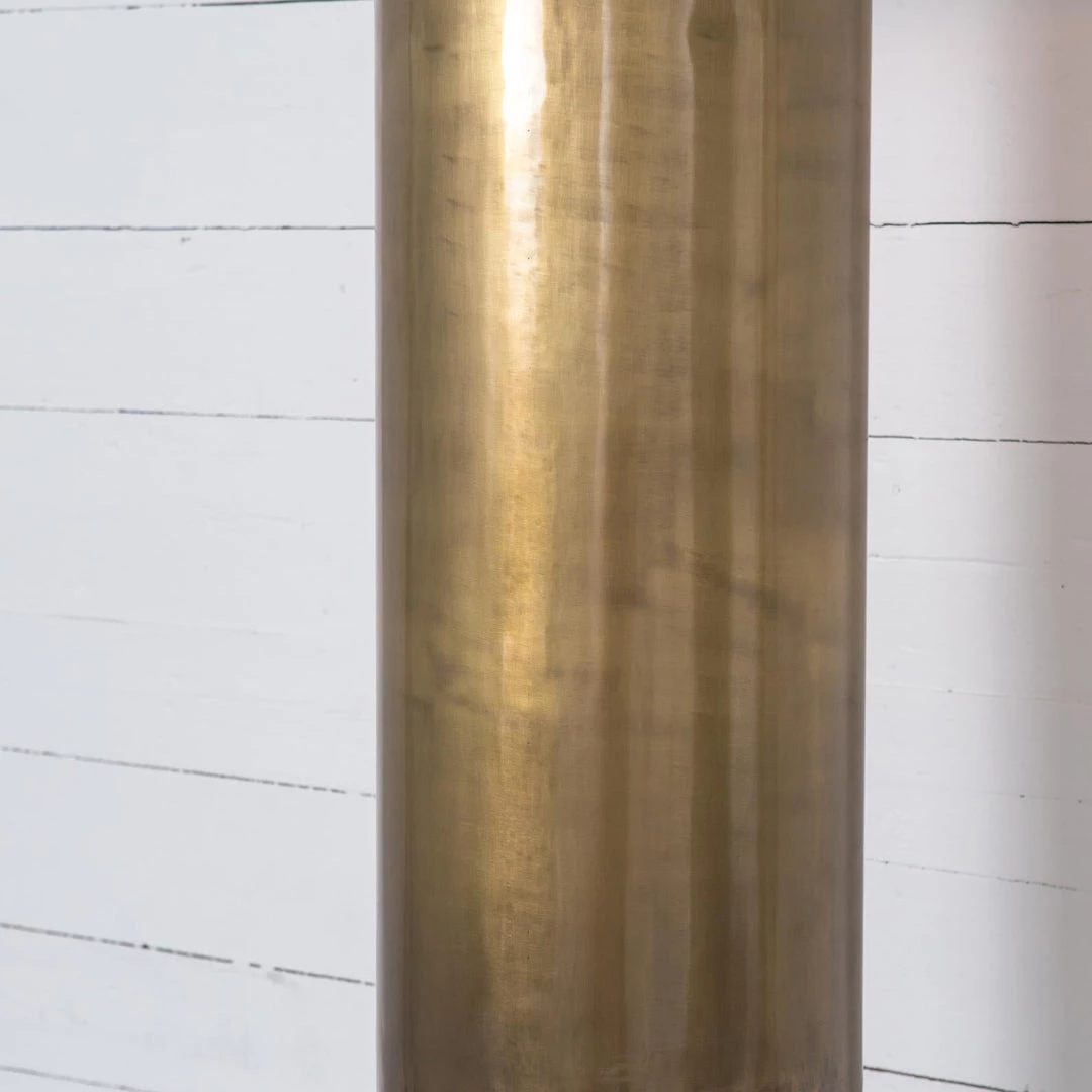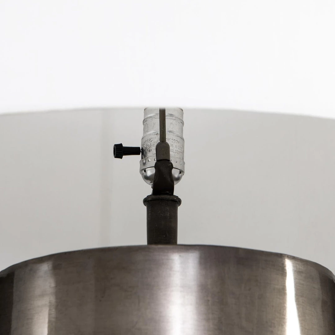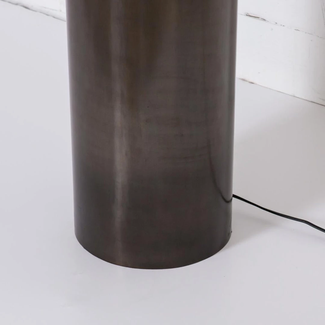 An antique pewter finish highlights iron’s gradual blending of hues, delivering a distinctive ombre effect to the cylindrical floor lamp. A white silk shade plays up this fresh mixing of materials.