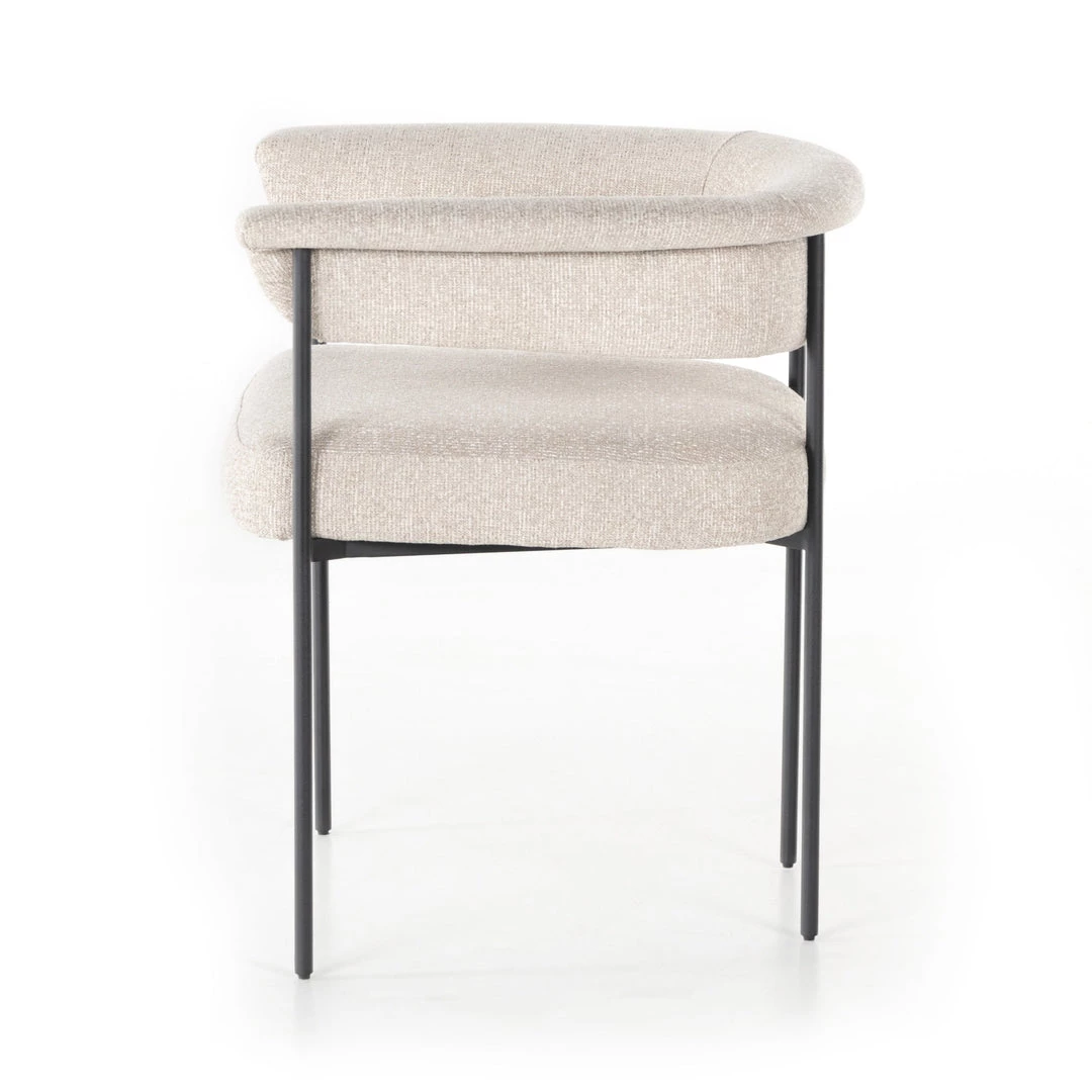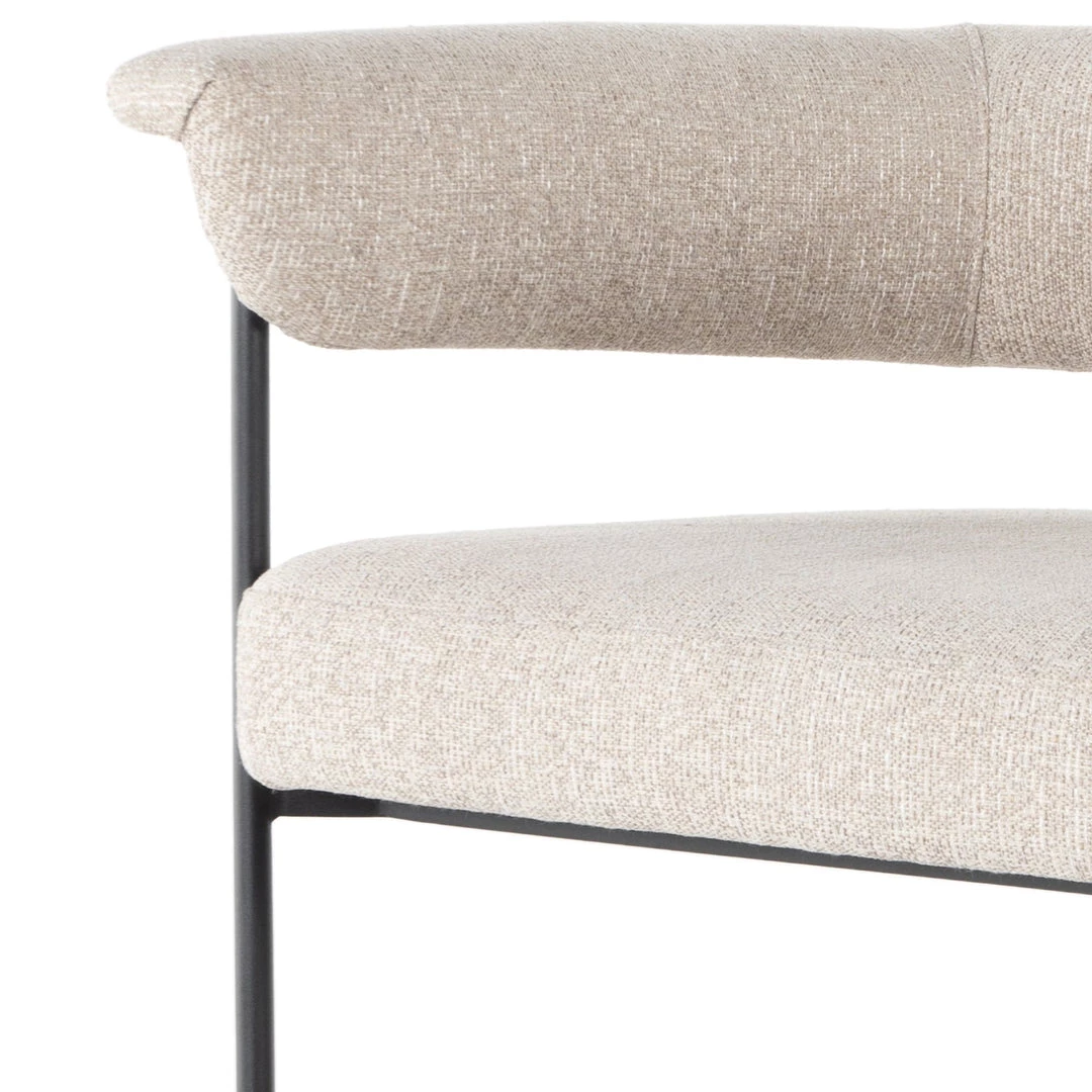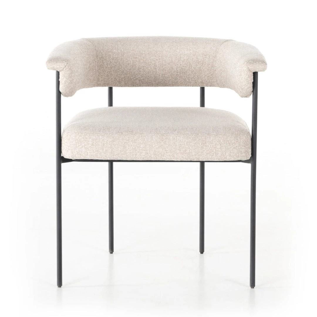 Airy and light with slim, black-finished iron framing, camel-colored upholstery lends texture to a beautifully sculpted dining style featuring a yoke back and exterior fold detailing.