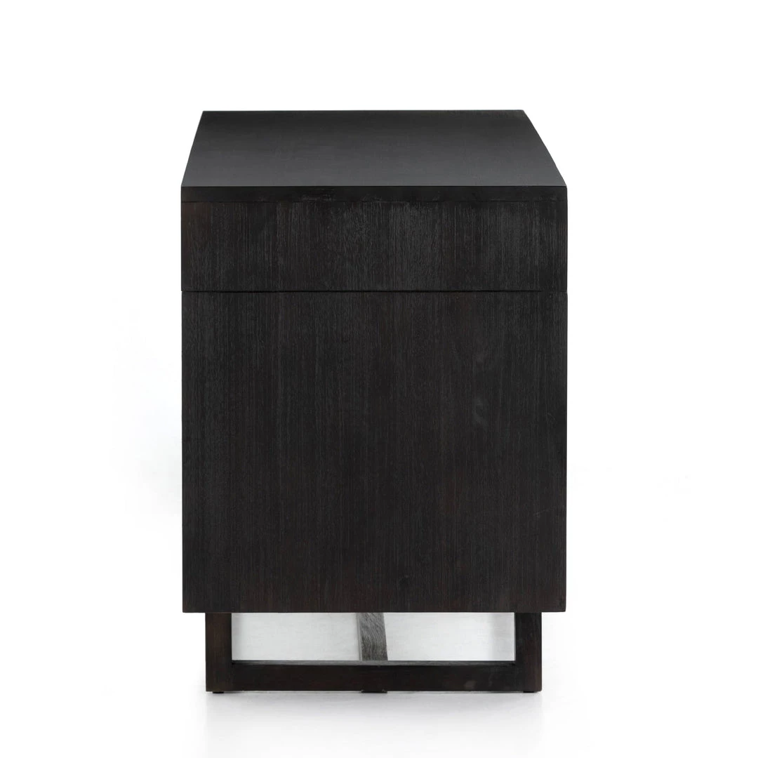 Mid century-spirited while beautifully on trend. A texture-driven desk of black-washed mango features three cane-covered drawers plus cabinetry for handy file storage.