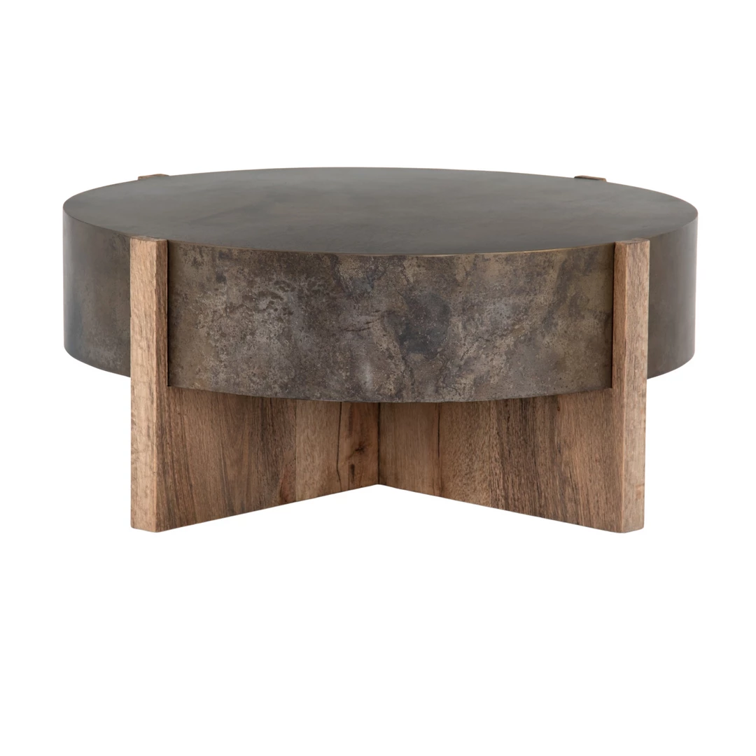 An organic-spirited statement piece. A drum-style coffee table of distressed iron rests within a sculptural cradle base of rustic, character-rich oak with beautiful highs and lows.