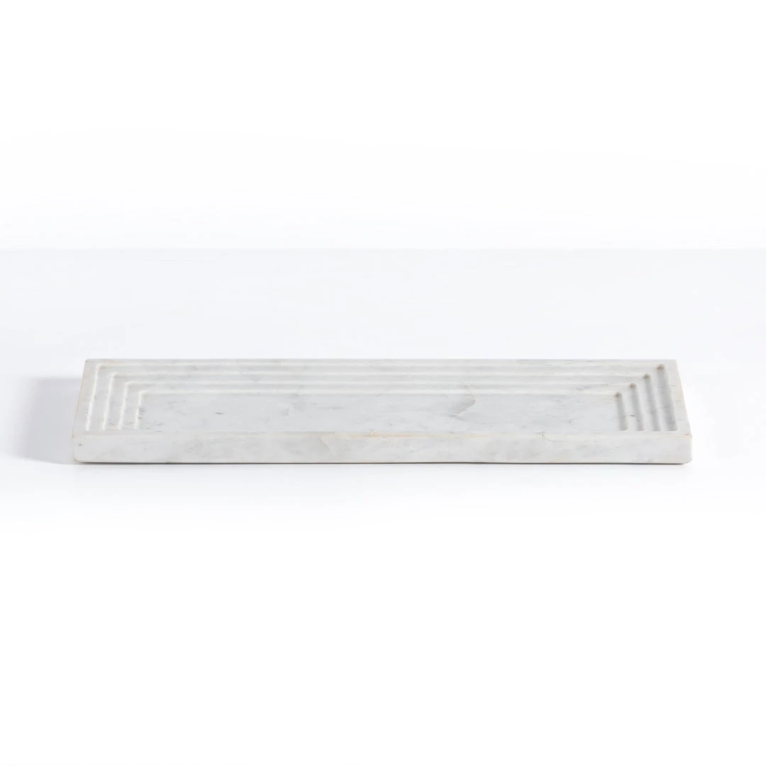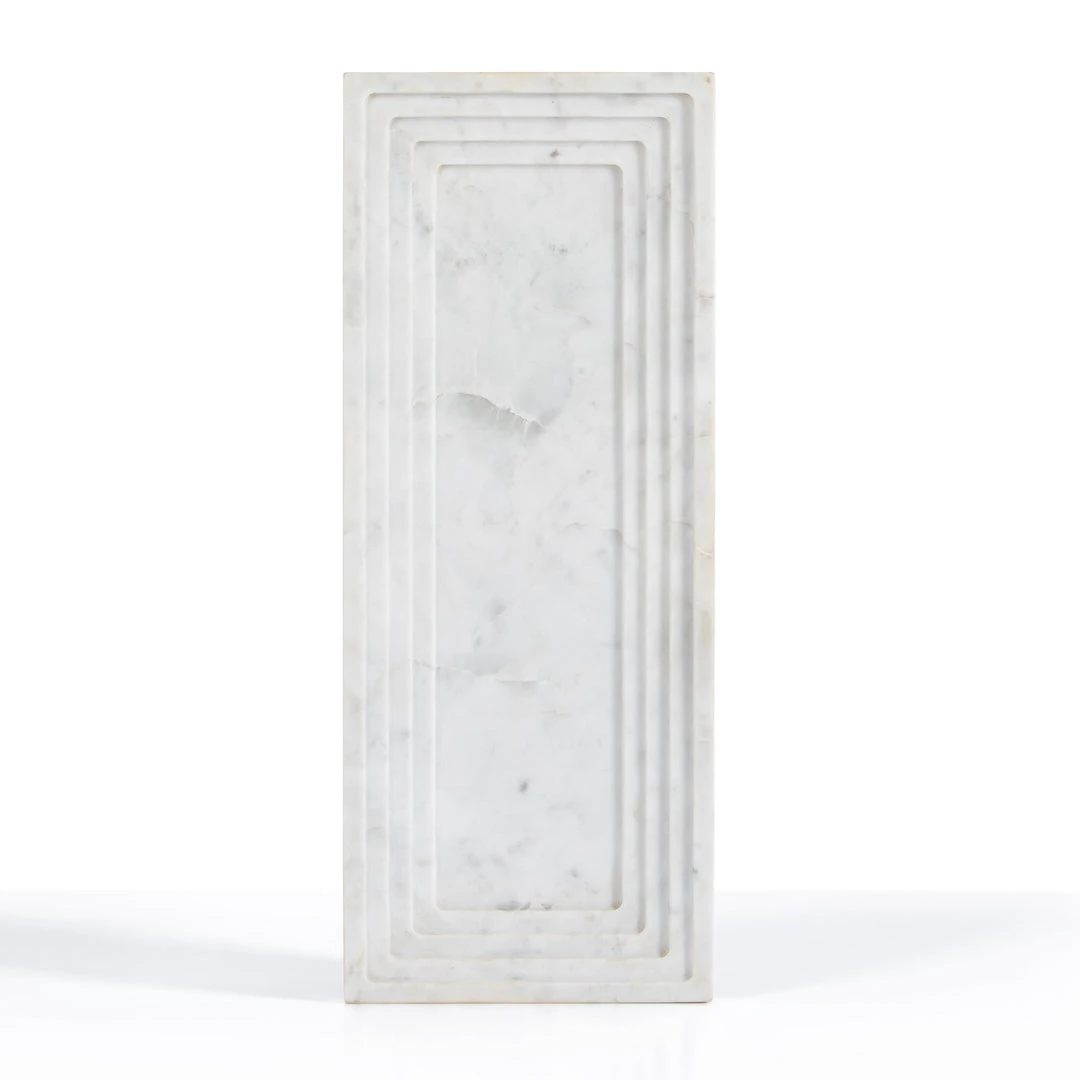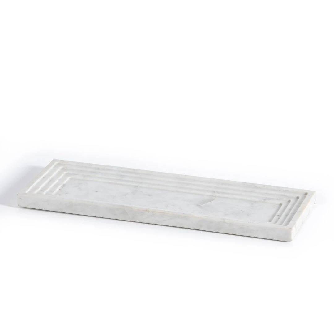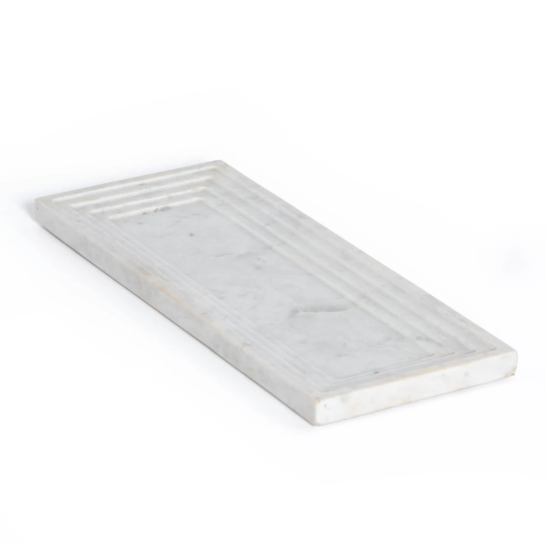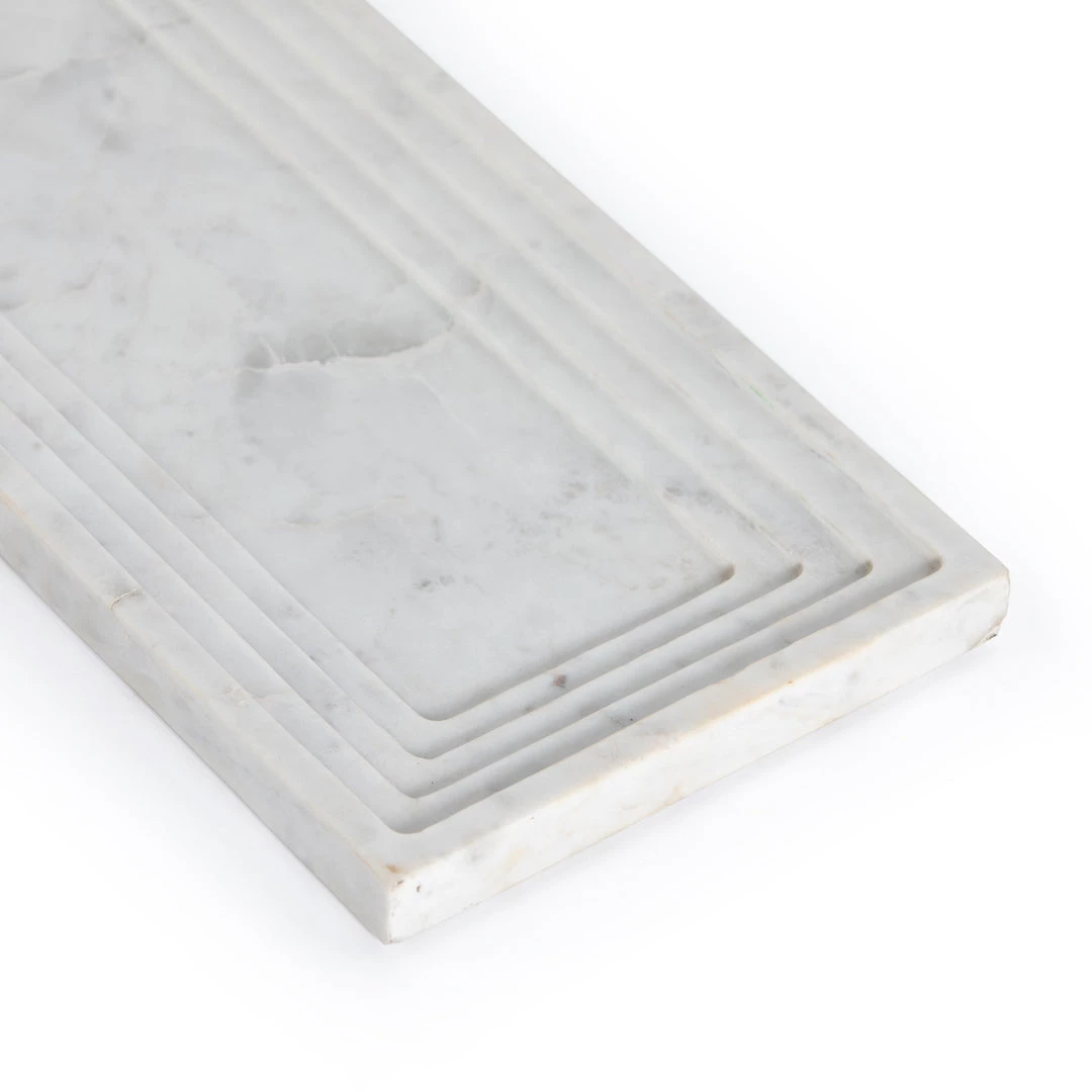 A definitively stylish catch-all, made from polished white marble, stepped for textural intrigue. Style in the entryway way for keys and sunglasses, or atop the coffee table for remote controls and more.