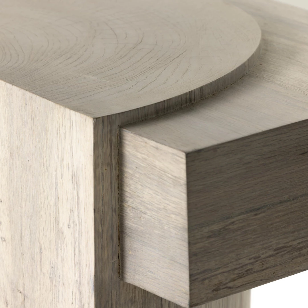 Made from thick-cut bleached oak veneer, as asymmetric base features pillar-style legs, with a plank-style top. The result: a show-stopping silhouette.