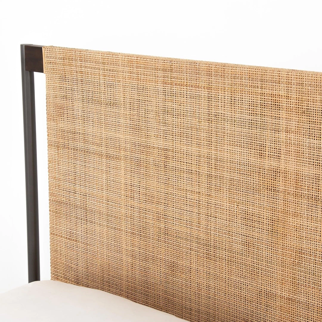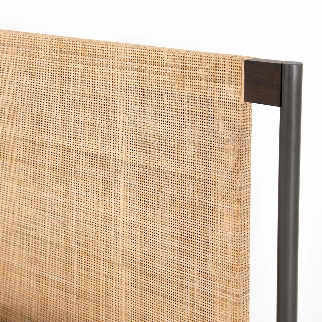 A float-like design brings a lightweight look to the bedroom. Natural cane head and foot boards, with mahogany backing for style and support. A charcoal-finished iron base with wooden stretchers offers a fresh, refined look with organic presence.