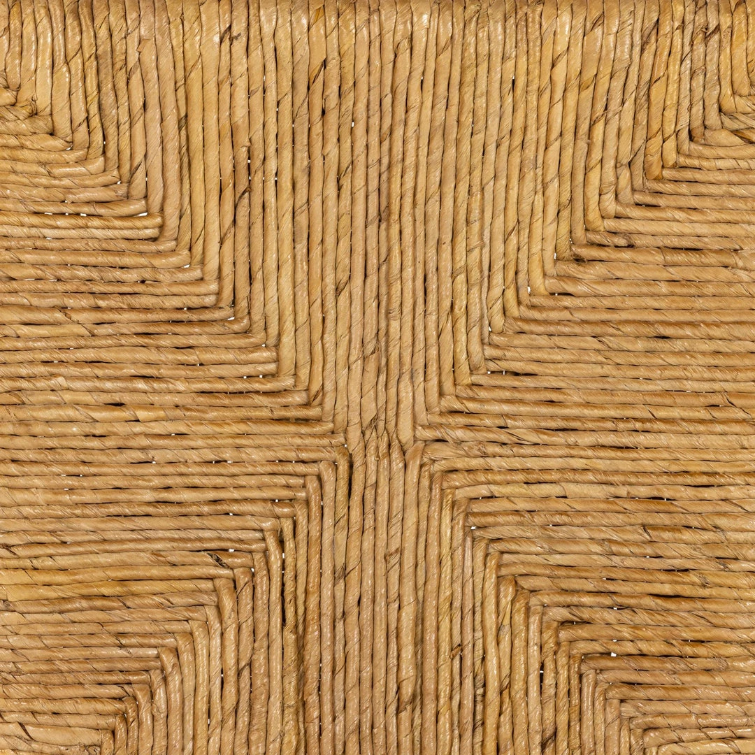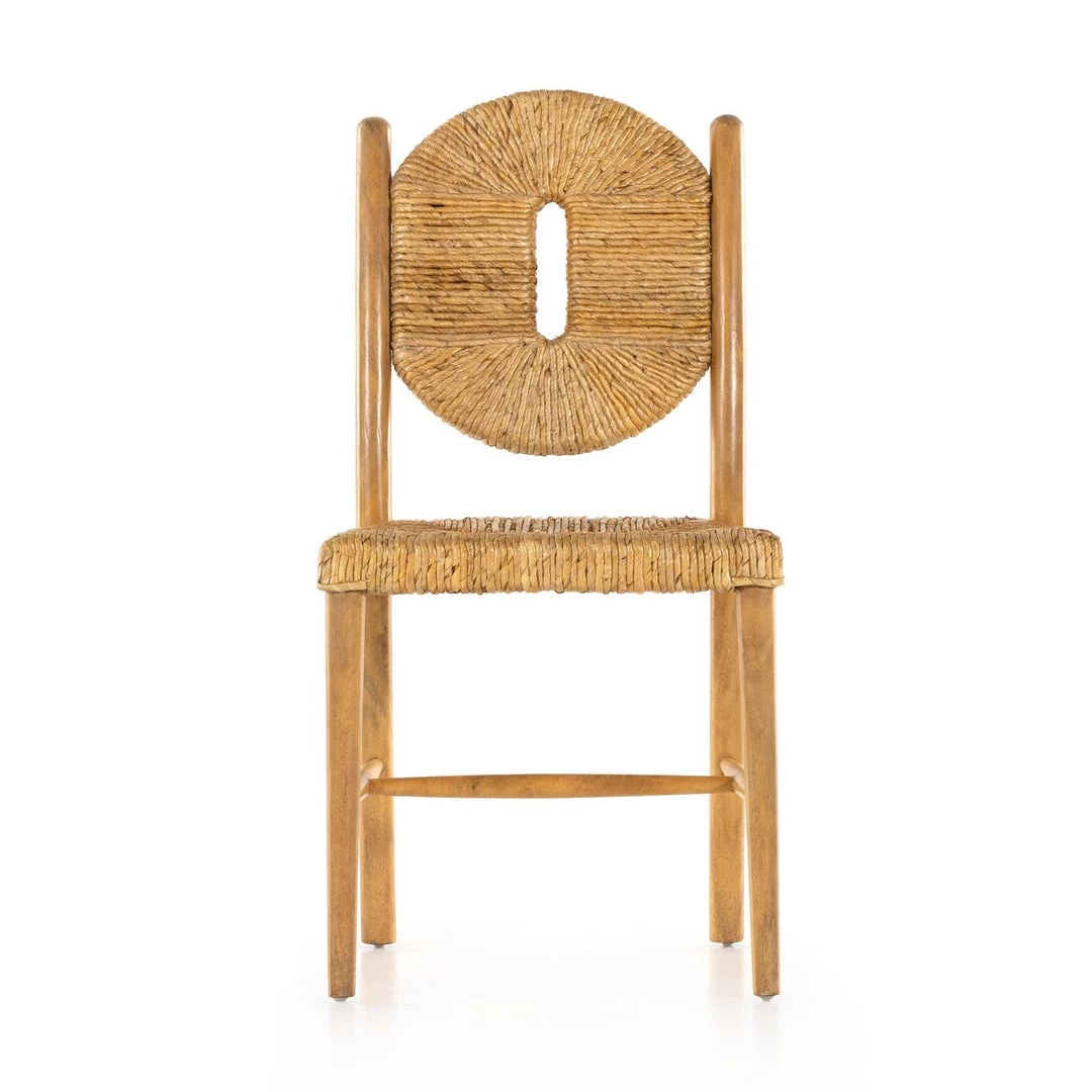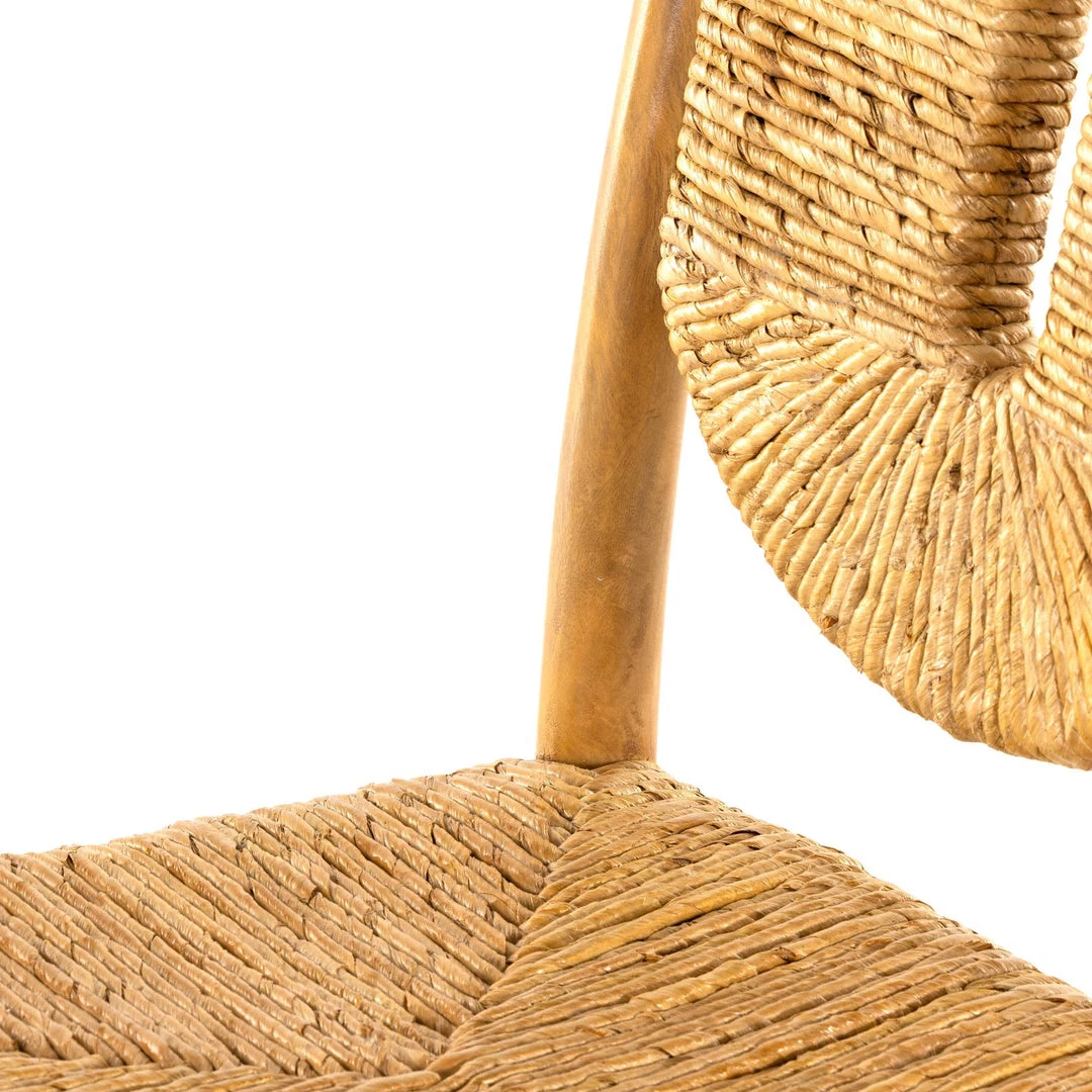 A texture-rich stunner. Solid light-washed mango forms a simple frame for woven, radial-style seating made from dark-bleached banana leaf.
