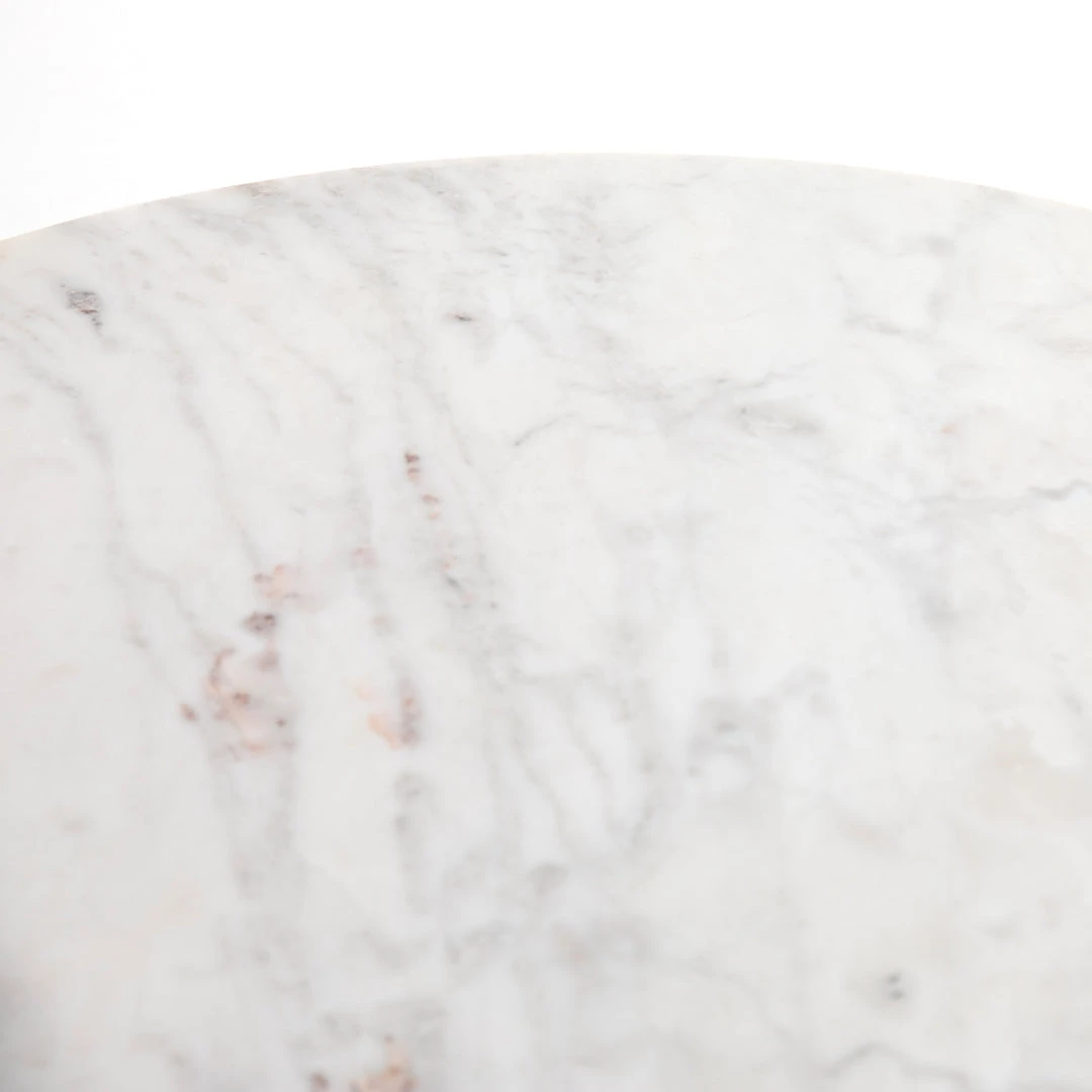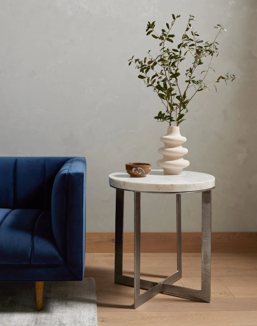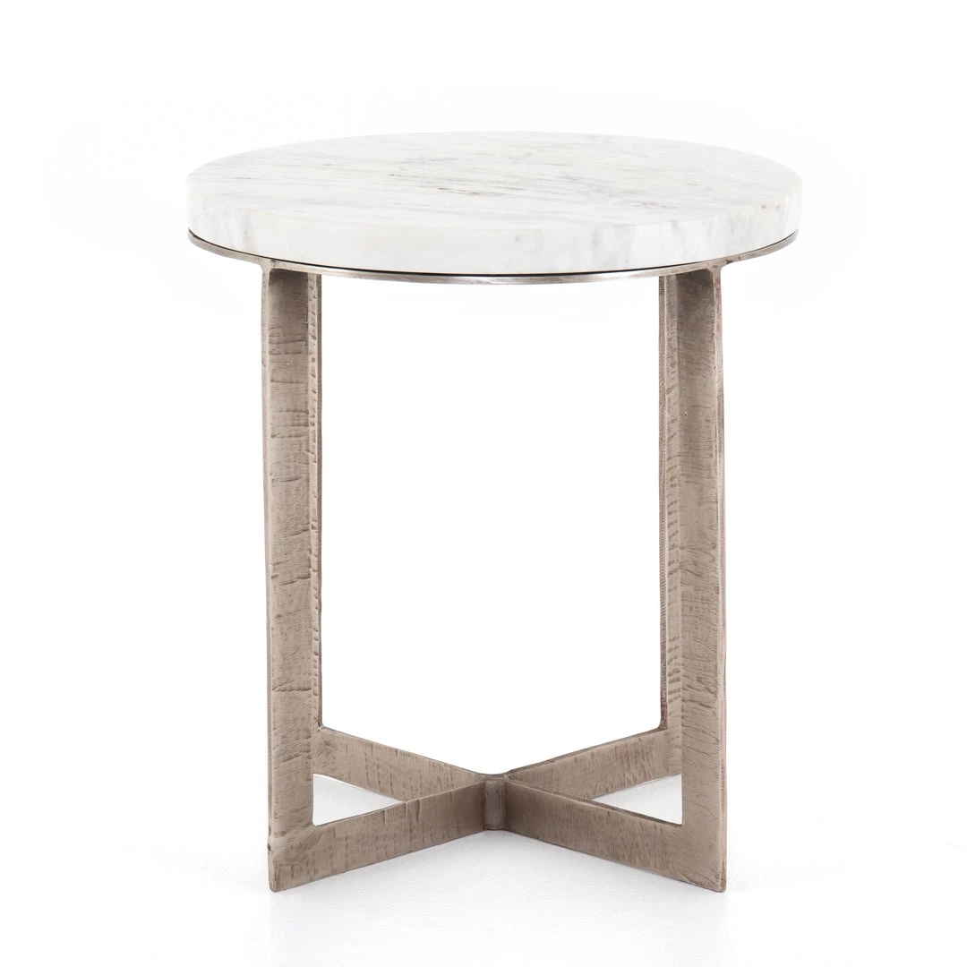 Modern materials meet geometric edge, bringing elegance to the bedside. An aluminum base of brushed nickel intersects to create clean right angles, with a thick tabletop of polished white marble.