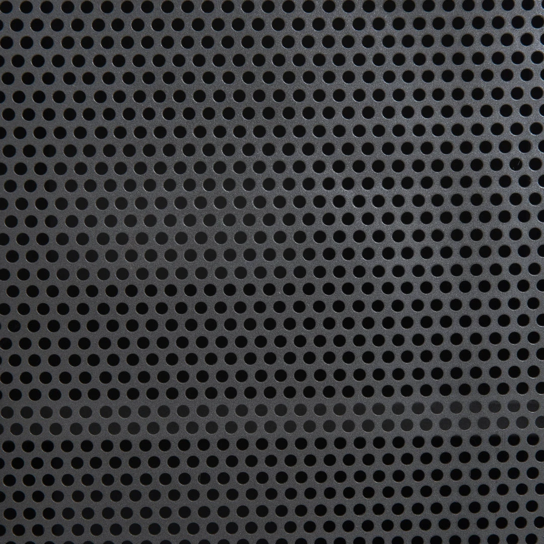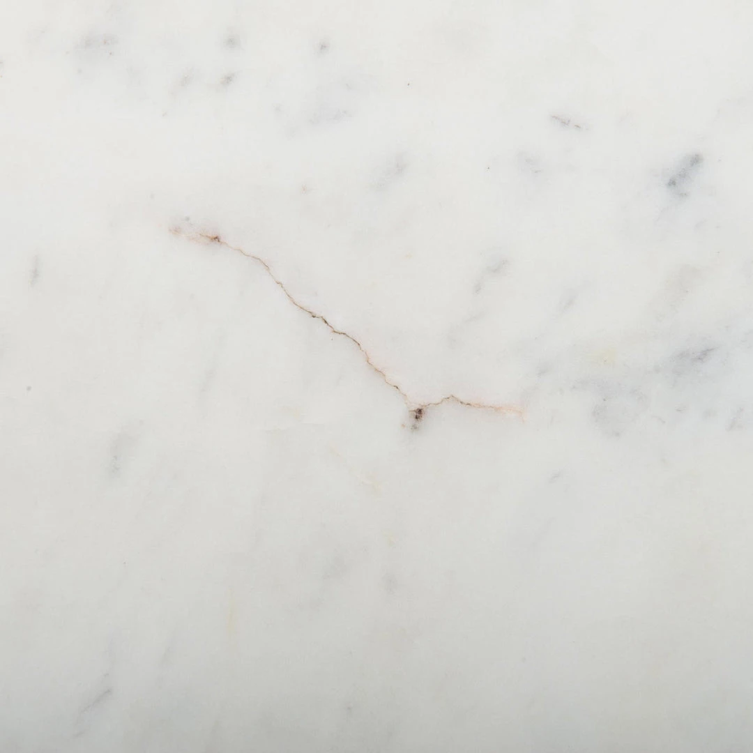 Late-Seventies style gets a modern refresh. Gunmetal-finished iron is rounded and perforated, for an intriguing take on popular pill shaping. A polished white marble top adds material interest to this unique, industrial-minded piece. Interior shelving plus rear cutout for cord management.