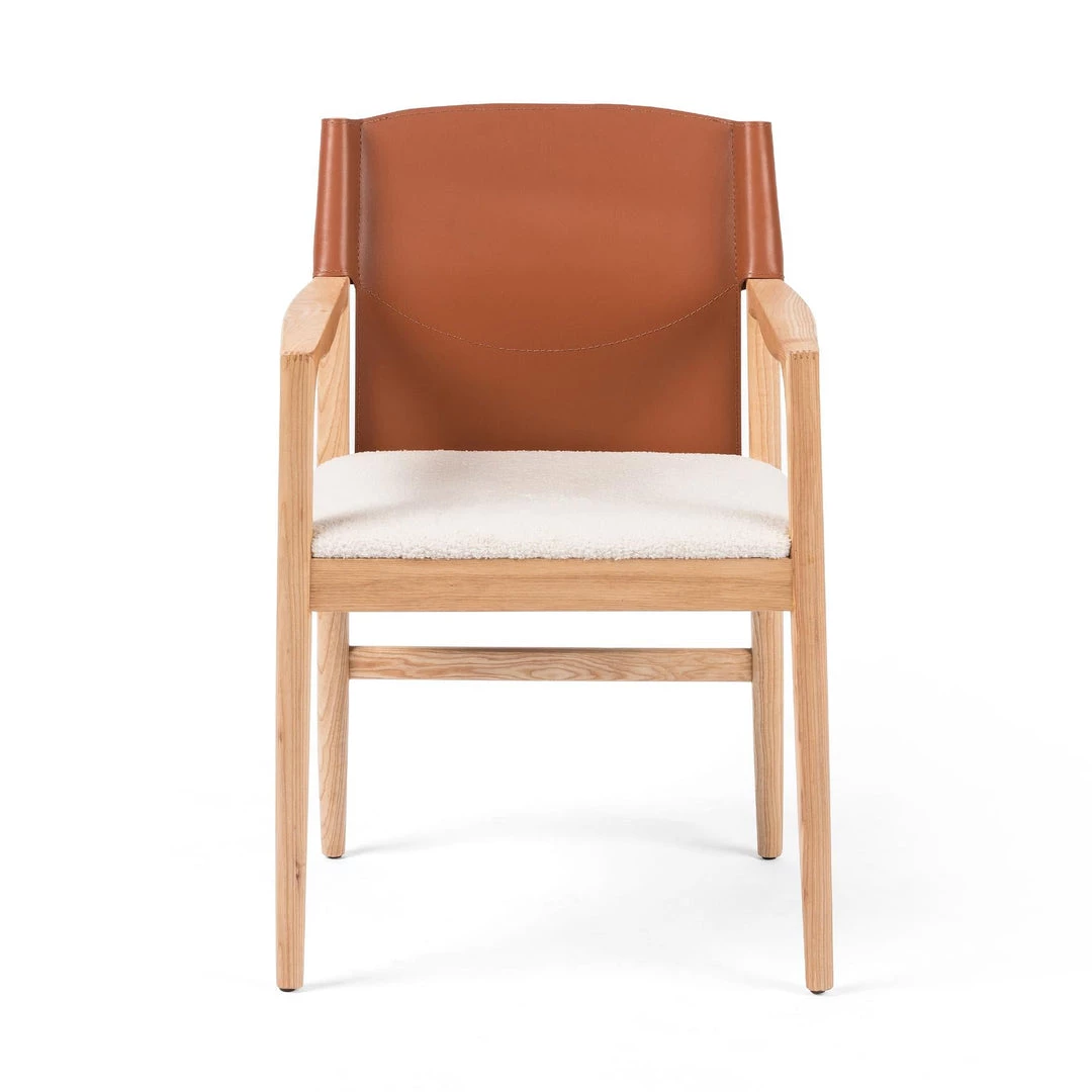 Sleek, streamlined seating with a midcentury vibe. Dining chair features a sling leather seatback and a faux shearling seat in liquid-repellent performance fabric. Subtly curved arms, frame and legs made of solid ash wood.