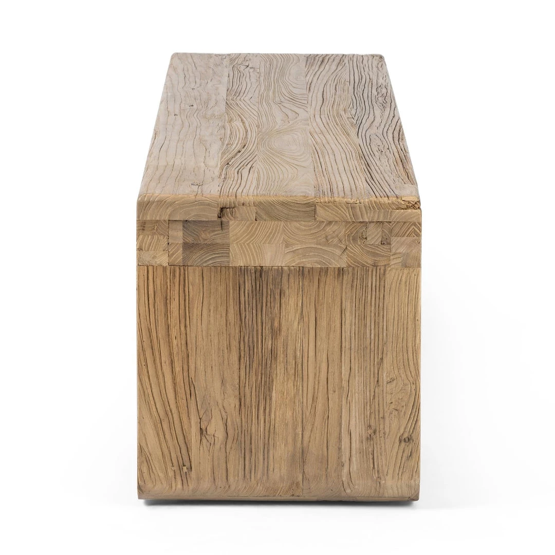 Natural elm forms clean, streamlined bench seating for a fresh take on traditional farmhouse, with chunky legs adding rustic-spun substance.
