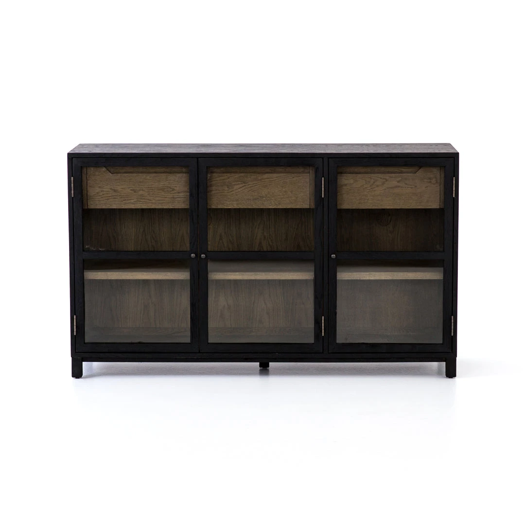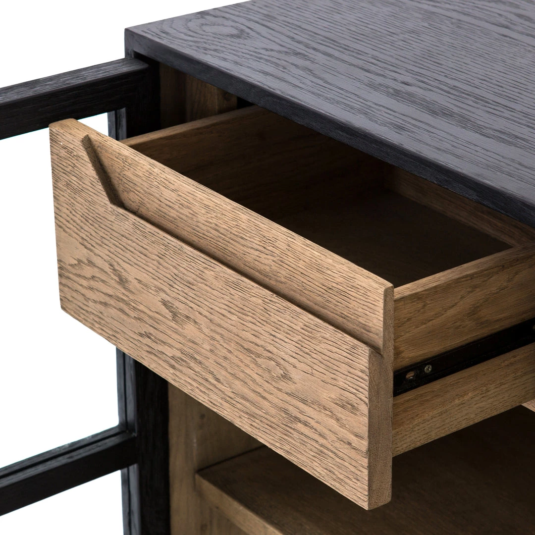 Black drifted oak frames lighter interior shelving for subtle but striking contrast. Glass doors allow for prized possessions to dazzle on display while spacious interior drawers add out-of-view storage options.