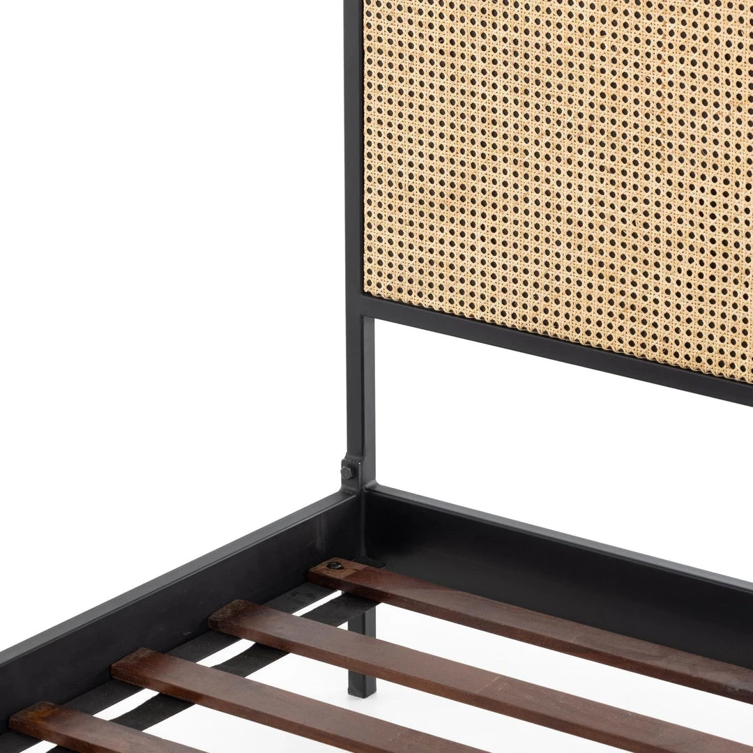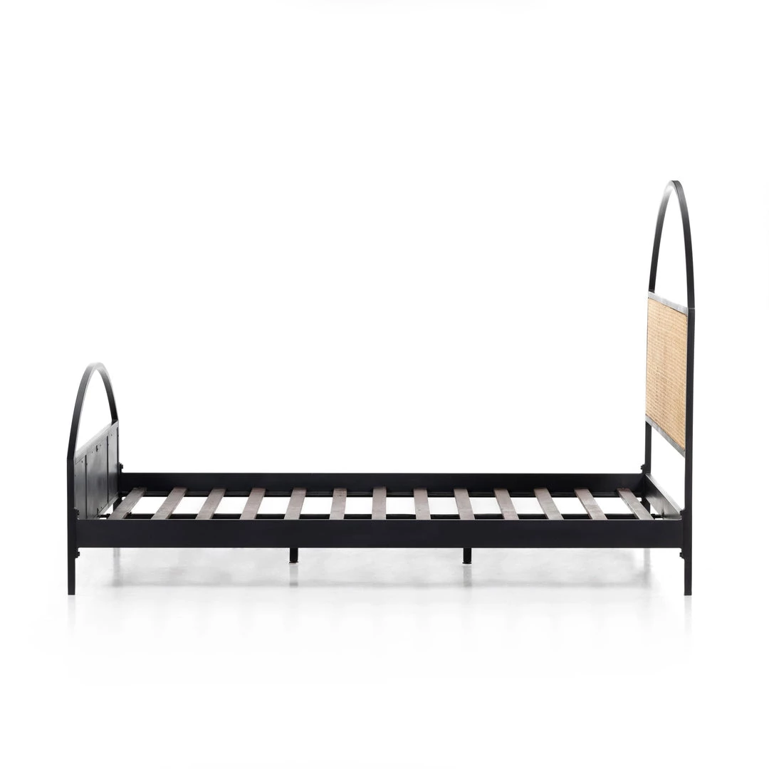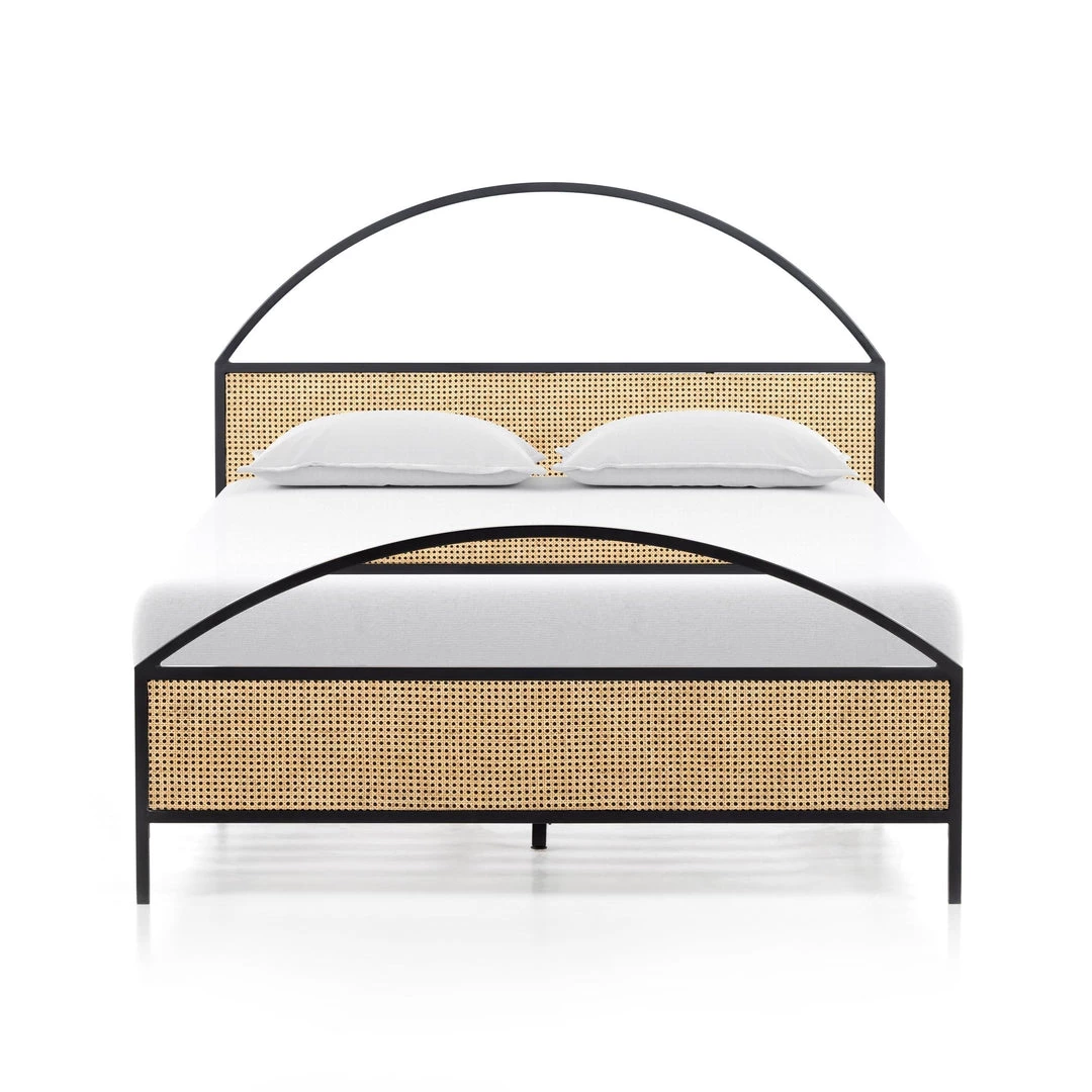 Make it modern with mixed materials. Finished in a vintage black, tube iron forms a beautifully arched frame for head and foot boards of wood-backed natural cane. Low-profile box spring recommended.