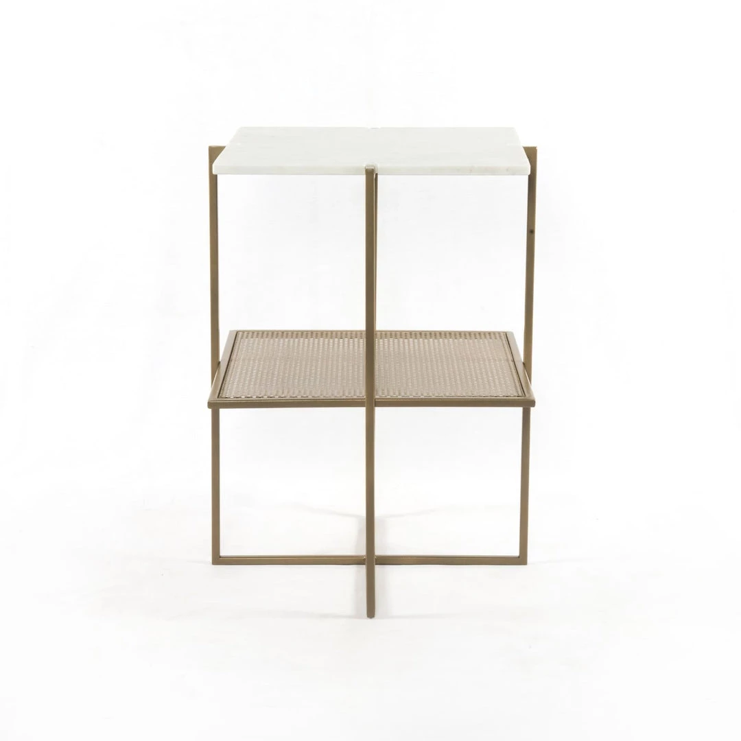 Add a pop of sophistication with a two-tone touch. Slim, antique brass-finished iron forms an X to support tiers of perforated metal and polished white marble for a look of simple grace.
