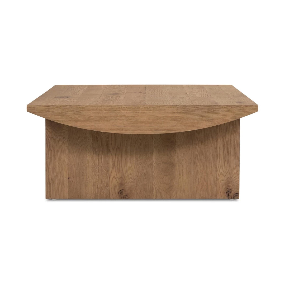 Low-styled and shape-driven, a coffee table made from thick-cut oak veneer features overscale proportions and half-moon shaping, with a warm grey-brown finish.