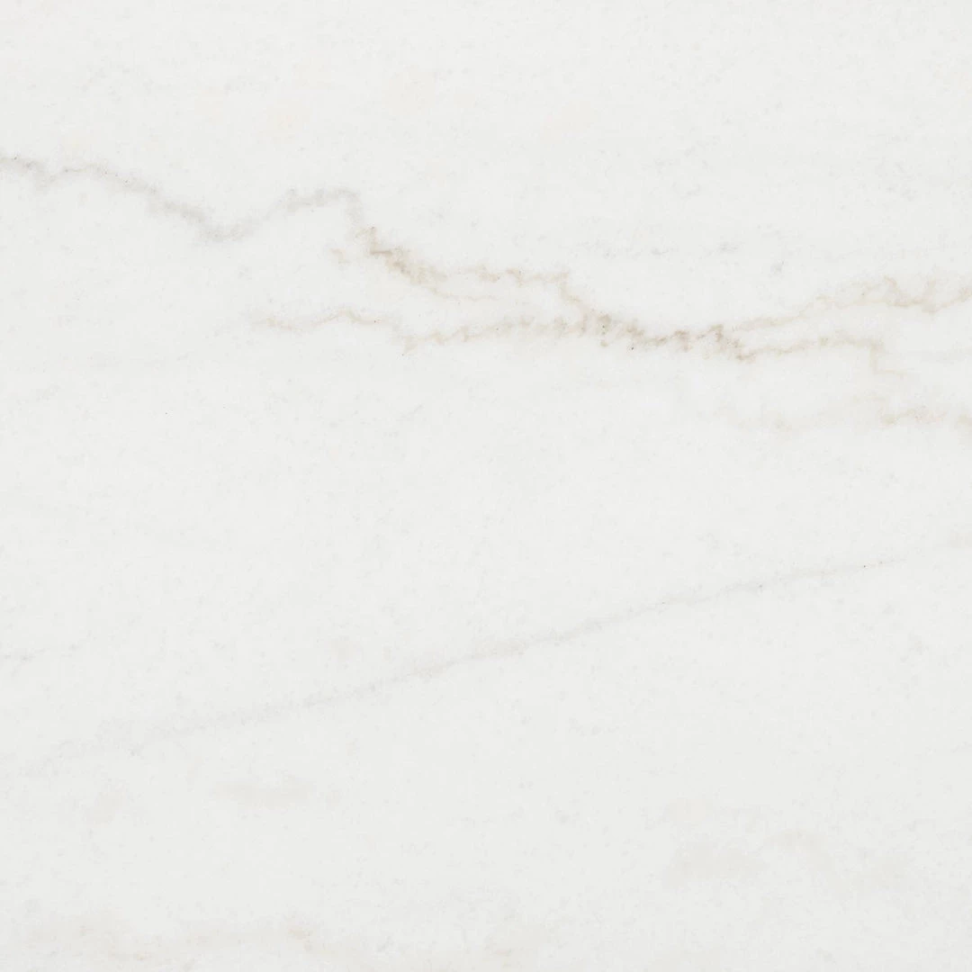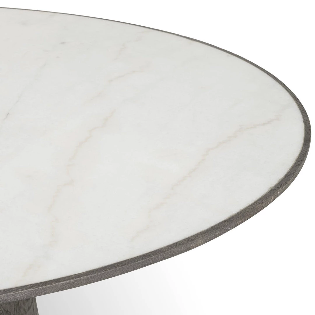 Mixed materials make for great drama. A cone-tapered base of dark, weathered oak supports a rounded tabletop of white-finished solid marble, with oak banding on the edges for thoughtful contrast.